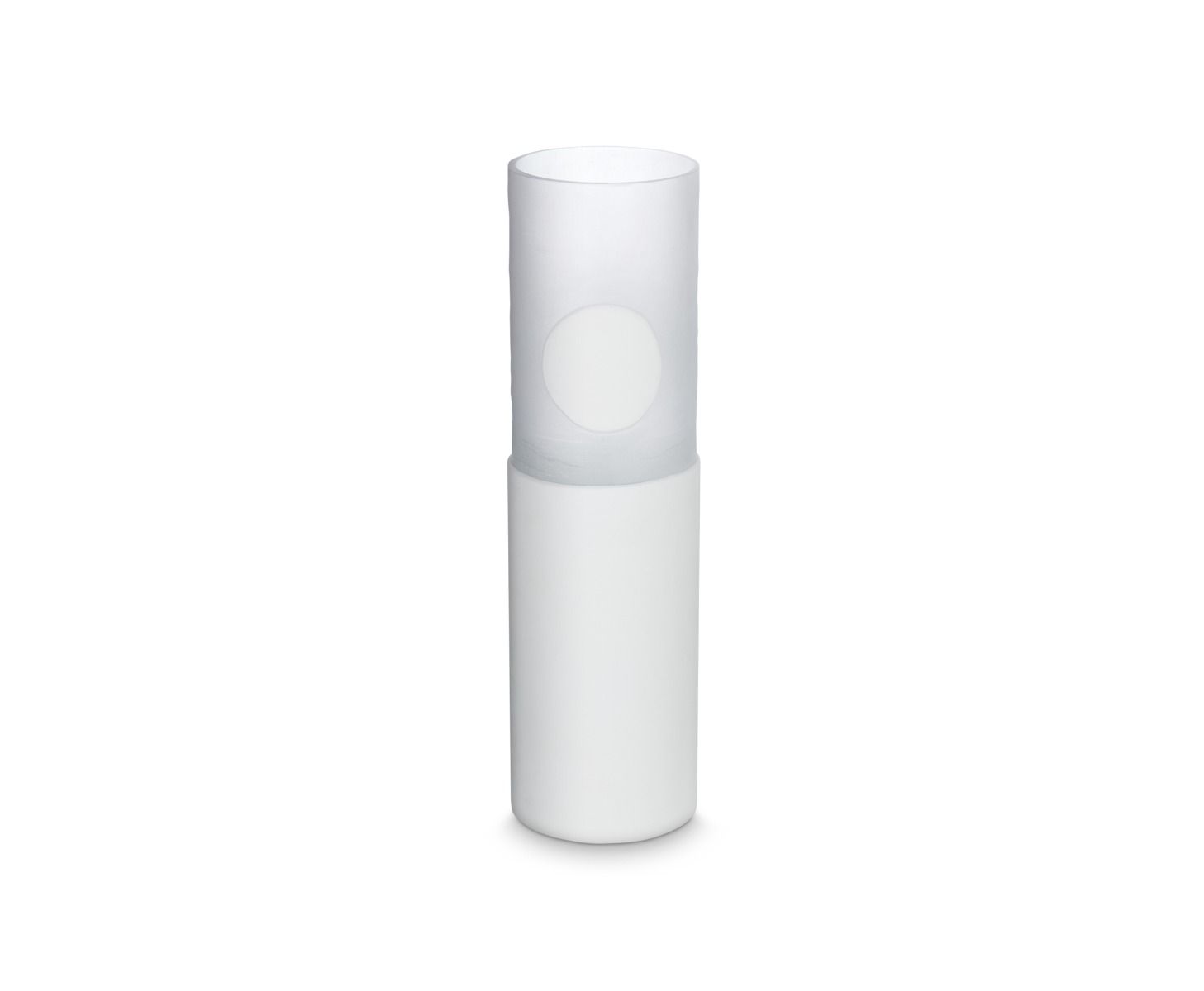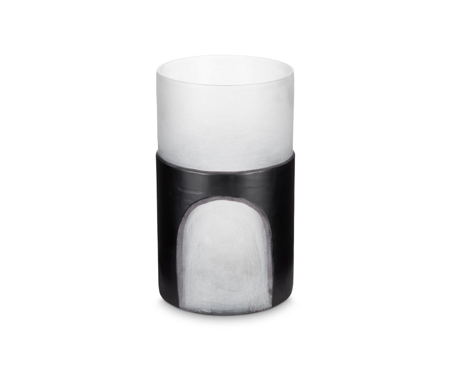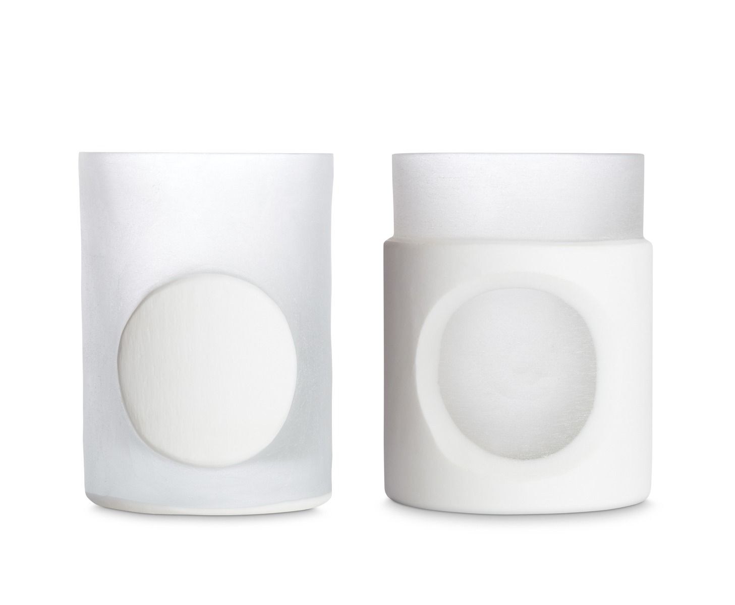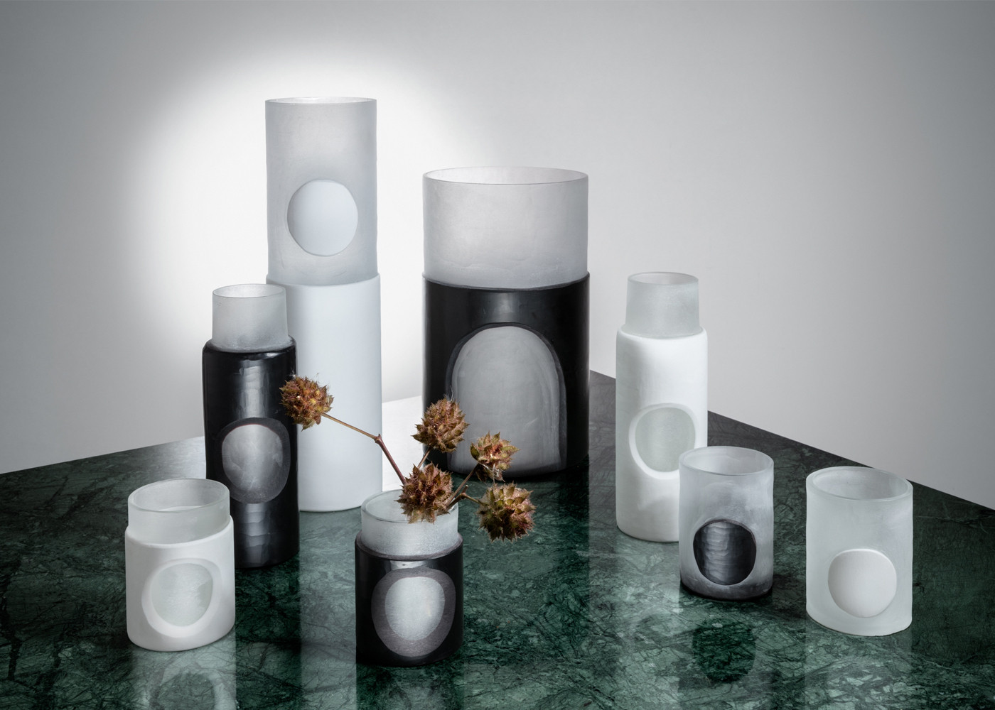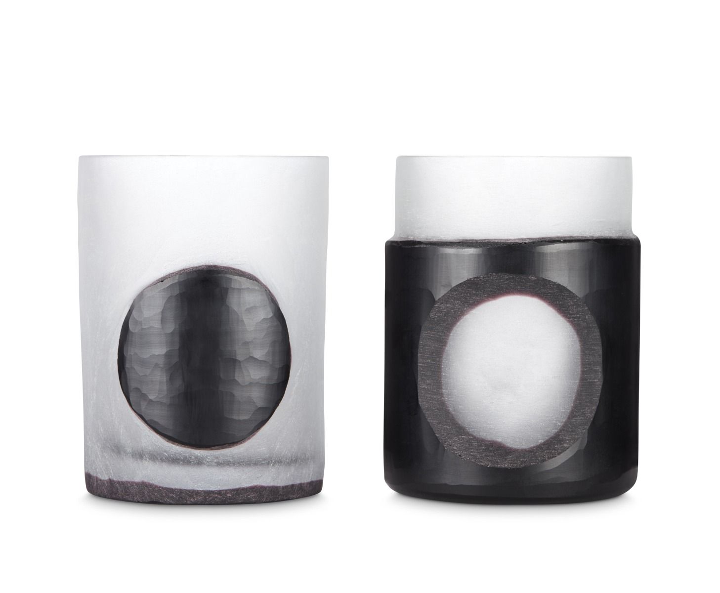 Mouth-blown, double layered black and white glass has been acutely cut back to define a series of circular motifs. Artisanal glass makers in India carefully carved away layers of glass in a design process that explores the opaque, the translucent and the transparent. The intention was for the chunky and heavy glass to take on an ethereal lightness. Availabel in small, medium, tall and stem set of 2 versions.