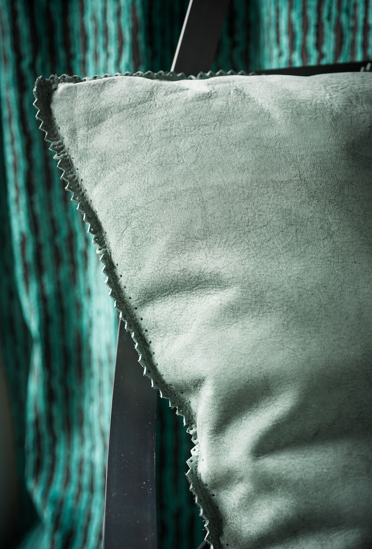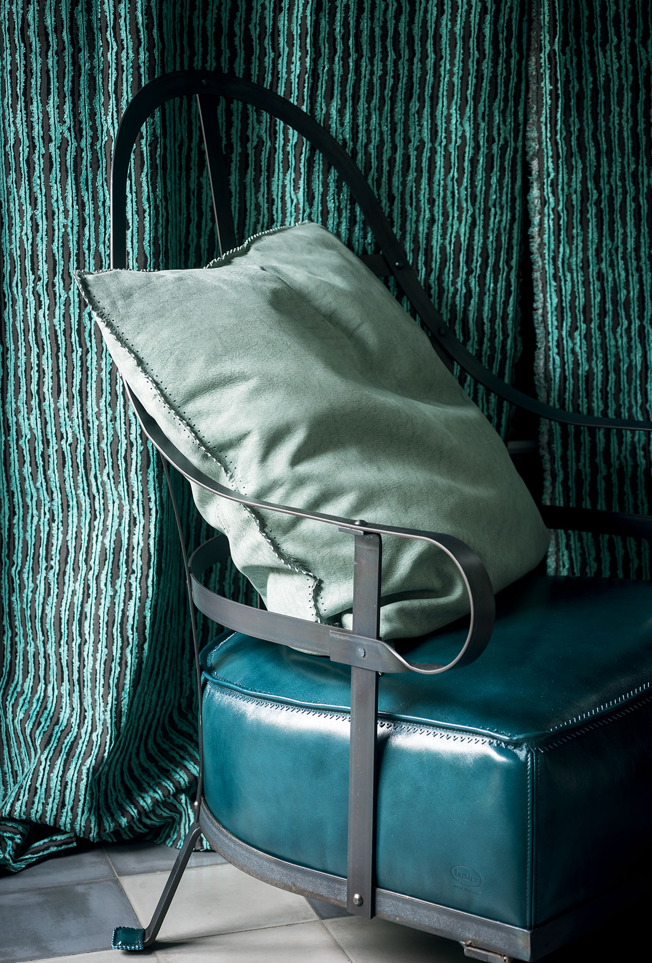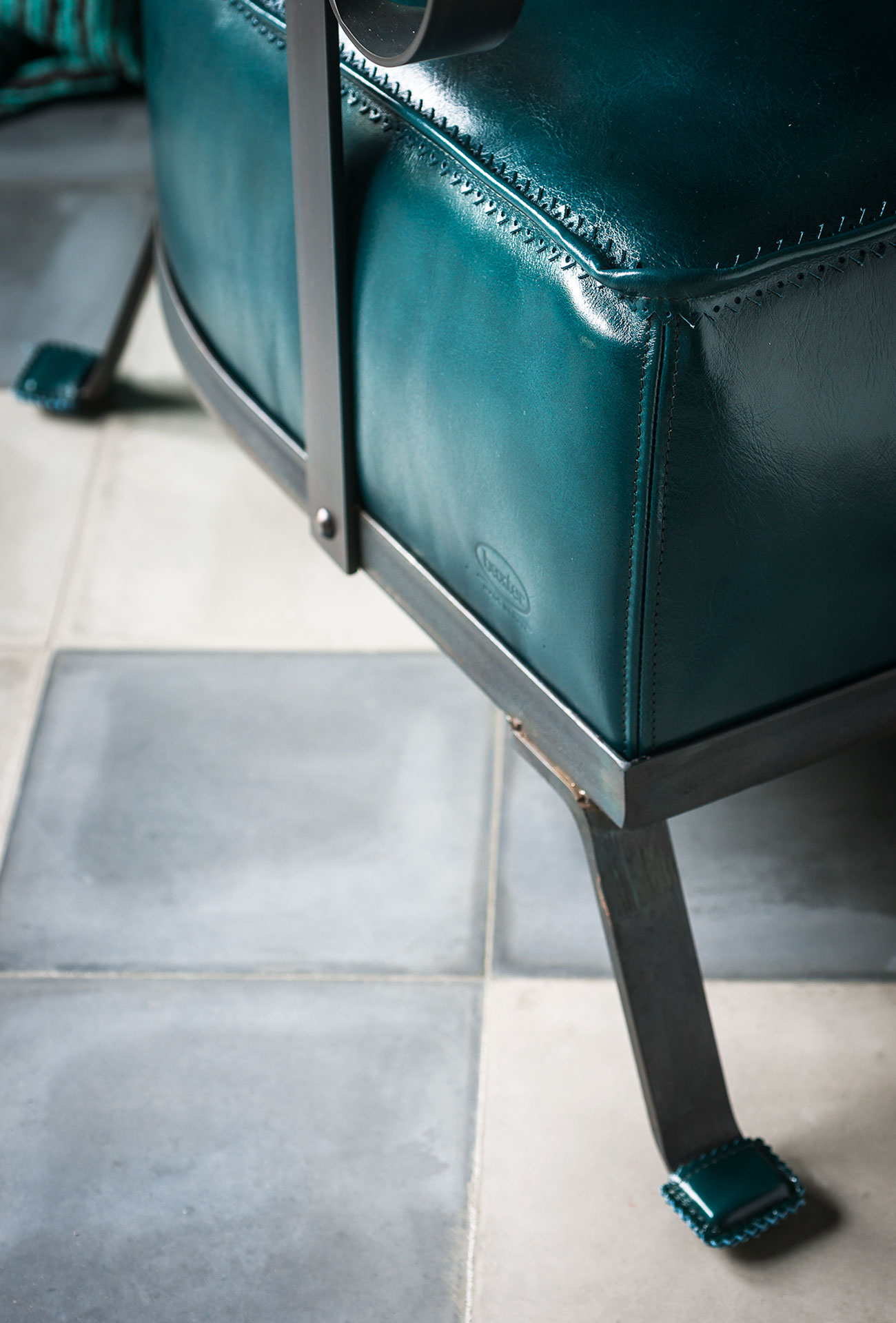 Black forged metal flat bar and angle bar frame; flat bar assembled with metal studs. Antirust protection with clear matte enamel. Seat cushions in differentiated density polyurethane foam. Back cushion in washed and sterilized goose down. Leather upholstery with stitching with decorative pattern. Foot with leather tip.