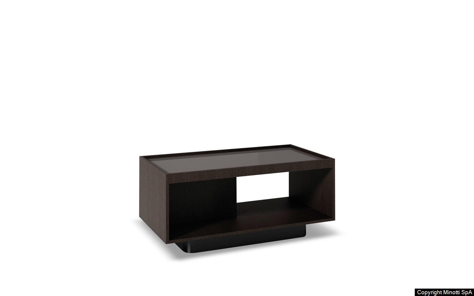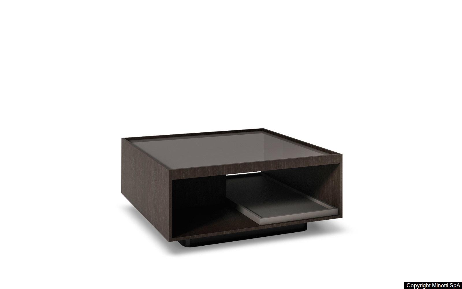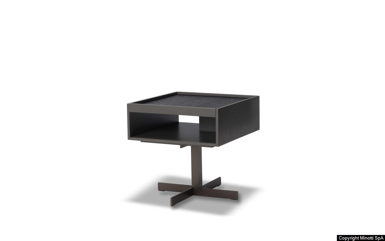 The Close night stands feature a sleek cross-shaped base with a refined Bronze satin finish. The upper part has a compartment with a removable tray that can be accessed from both sides and comes in two versions: structure in open pore Moka lacquered oak, and glossy Clay-colored lacquered top with inside tray in a matt Clay lacquered finish, or with a matt Clay lacquered structure, and top and inside tray in oak with an open pore Moka lacquered finish.