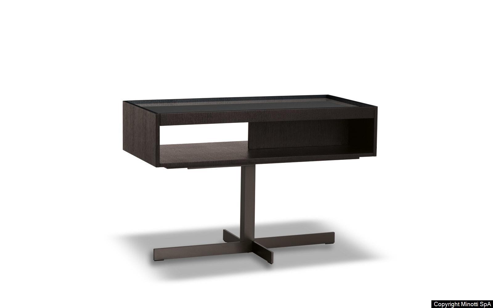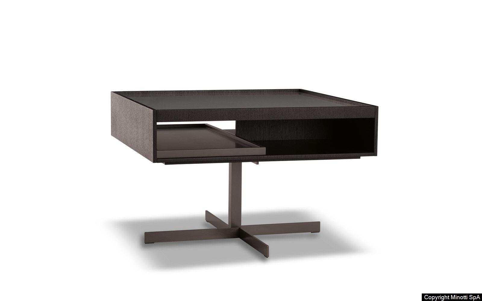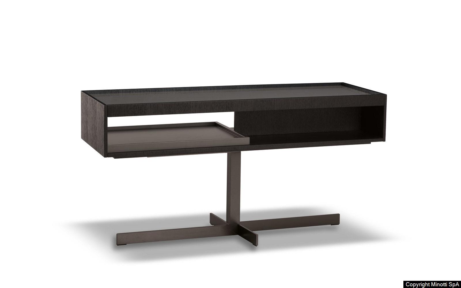 The Close side tables fit perfectly in the space between the backrests of the Yang sofa, offering practical surfaces: any useful object is within reach or tidily stored in the compartment below, while relaxing comfortably on the sofa. The simple metal base ends with a cross-shaped floor base in refined satin-finish Bronze. The upper part has a compartment with a removable tray that can be accessed on both sides and comes in two versions: structure in open pore Moka lacquered oak, a glossy Clay-colored lacquered top with inside tray in a matt Clay lacquered finish, or with a matt Clay lacquered frame and top and inside tray in oak with an open pore Moka lacquered finish. In addition to the side tables which come in various sizes, Close also includes a console table, a desk and some bedside tables.
