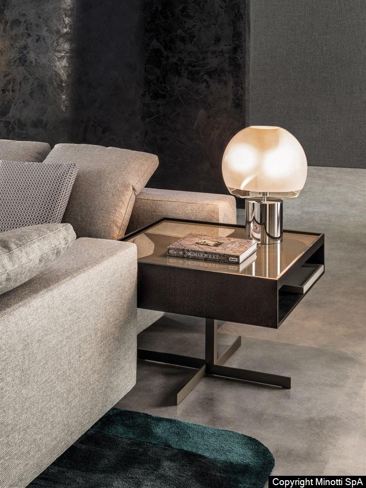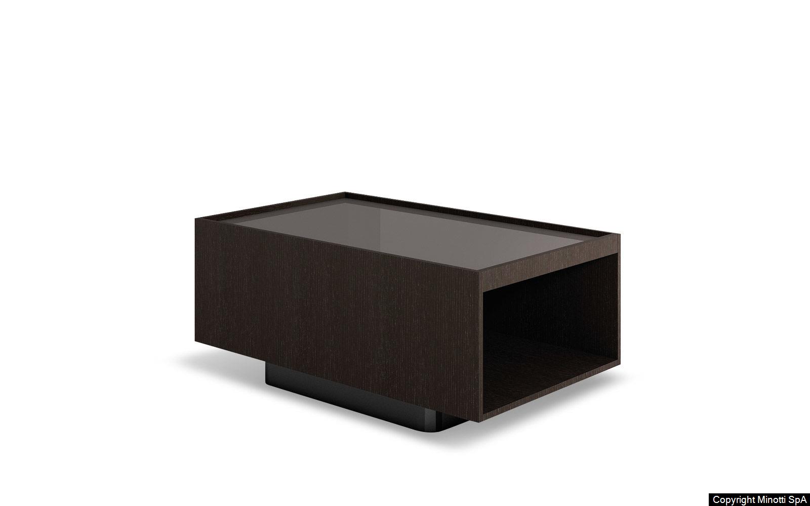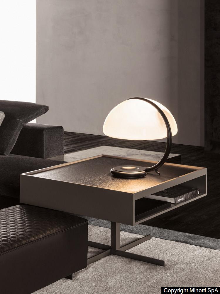 The Close side tables fit perfectly in the space between the backrests of the Yang sofa, offering practical surfaces: any useful object is within reach or tidily stored in the compartment below, while relaxing comfortably on the sofa. The simple metal base ends with a cross-shaped floor base in refined satin-finish Bronze. The upper part has a compartment with a removable tray that can be accessed on both sides and comes in two versions: structure in open pore Moka lacquered oak, a glossy Clay-colored lacquered top with inside tray in a matt Clay lacquered finish, or with a matt Clay lacquered frame and top and inside tray in oak with an open pore Moka lacquered finish. In addition to the side tables which come in various sizes, Close also includes a console table, a desk and some bedside tables.
