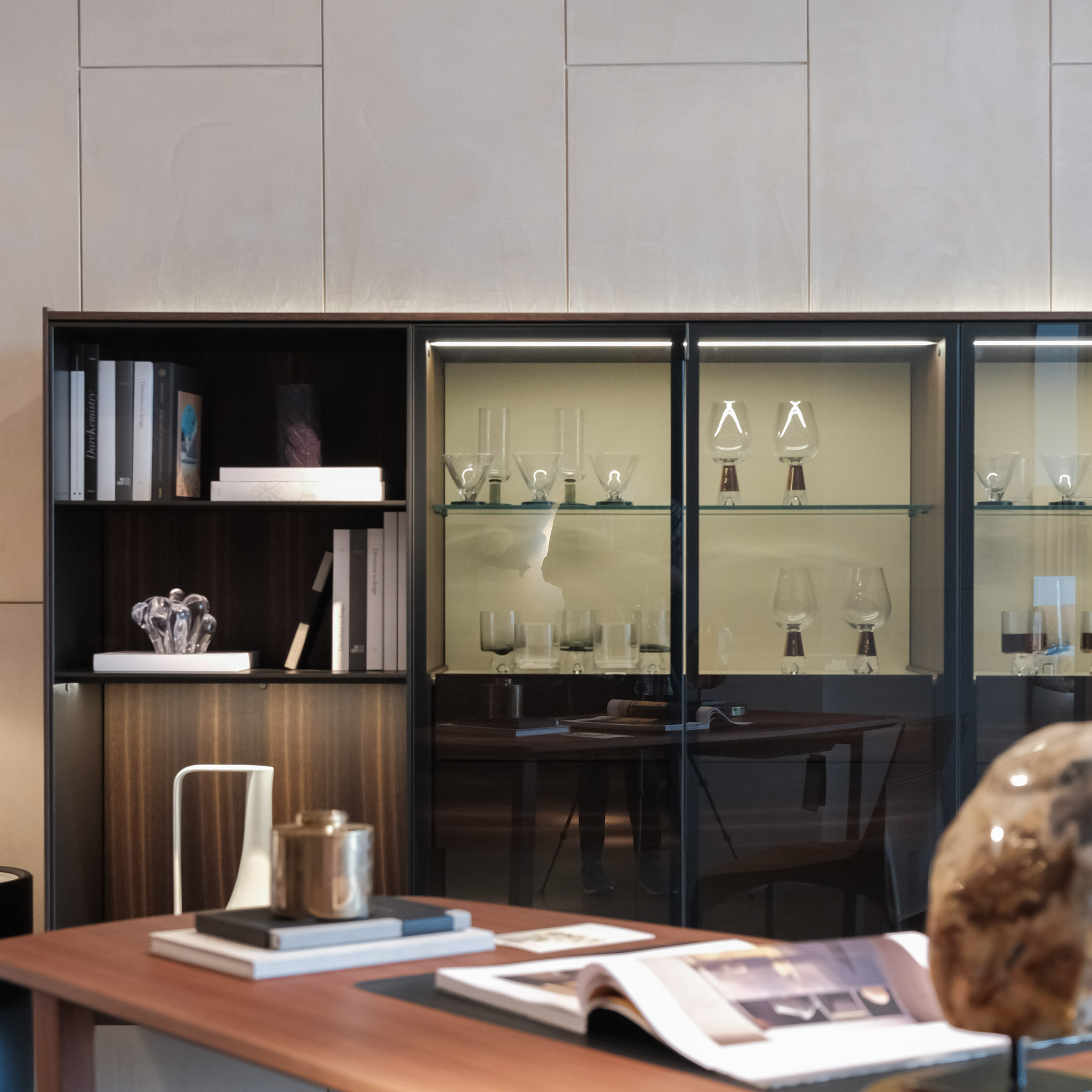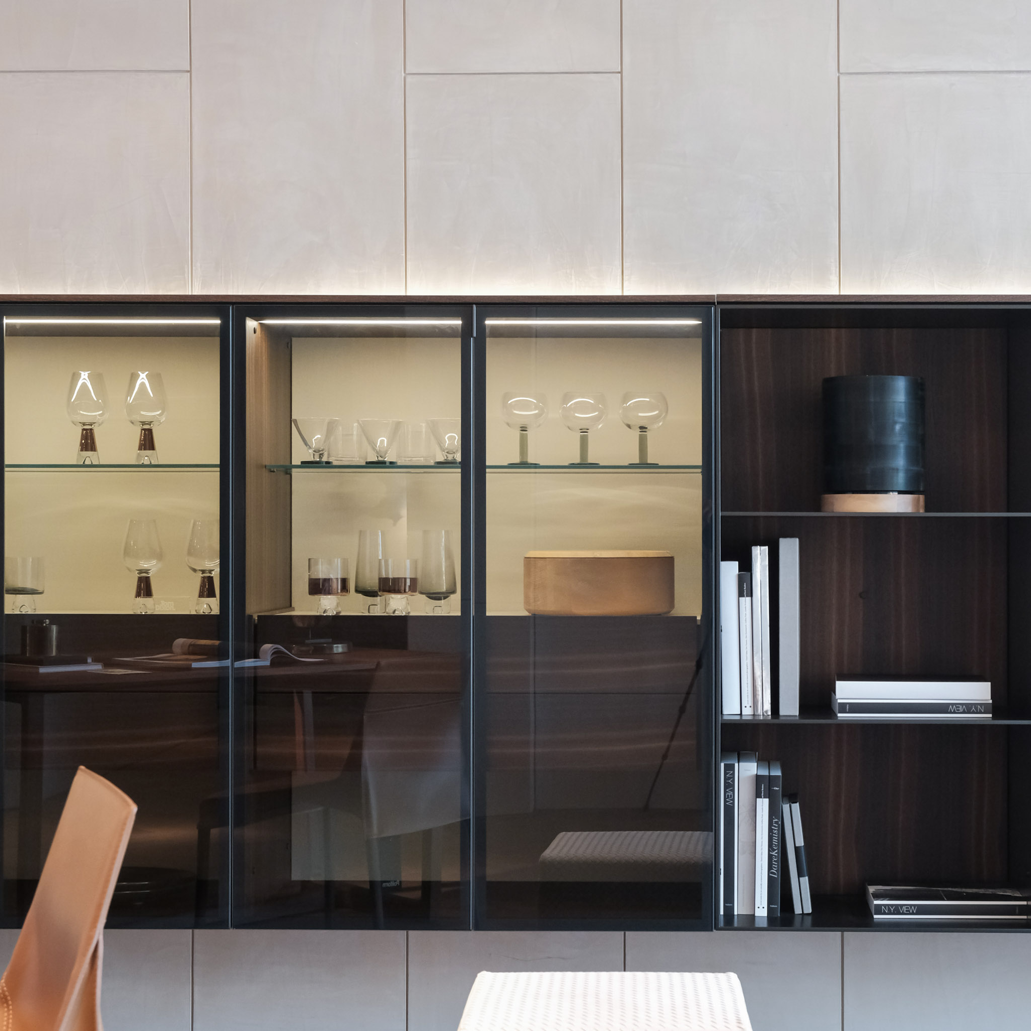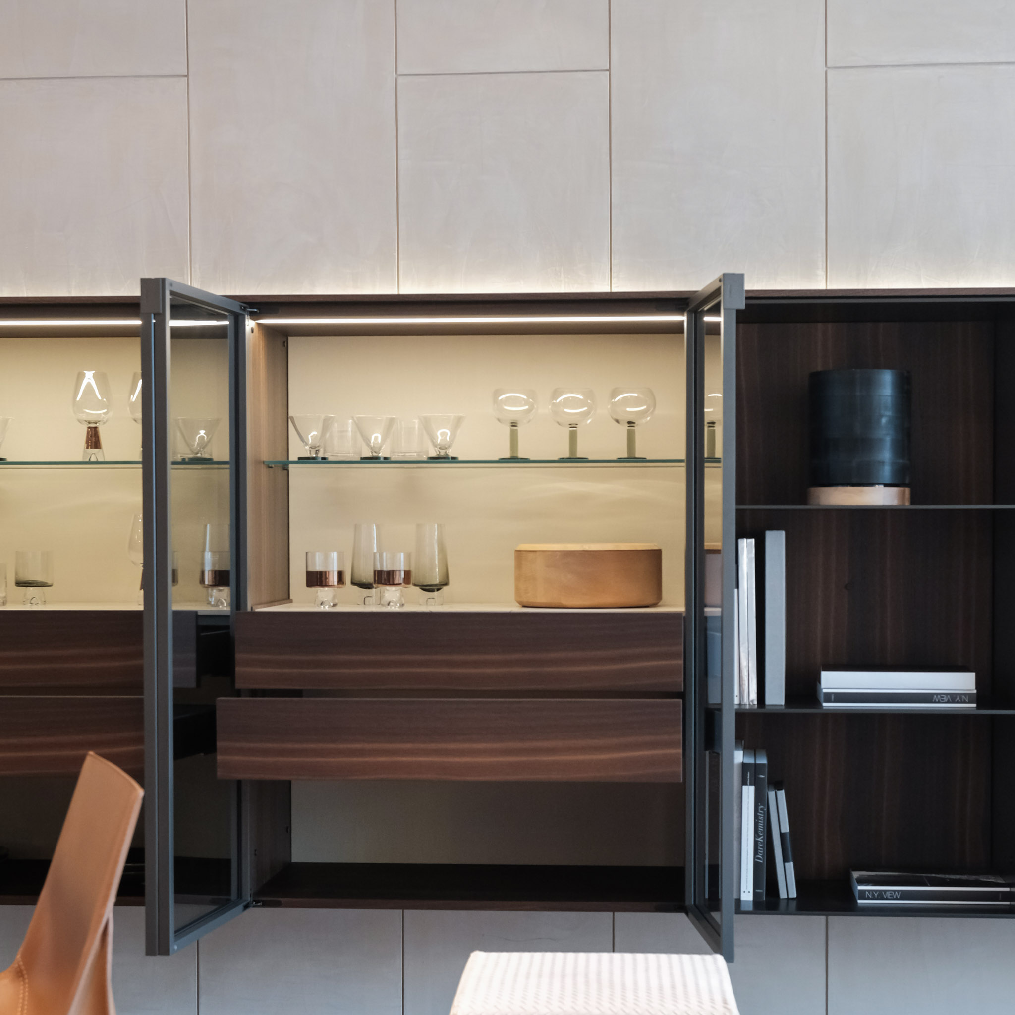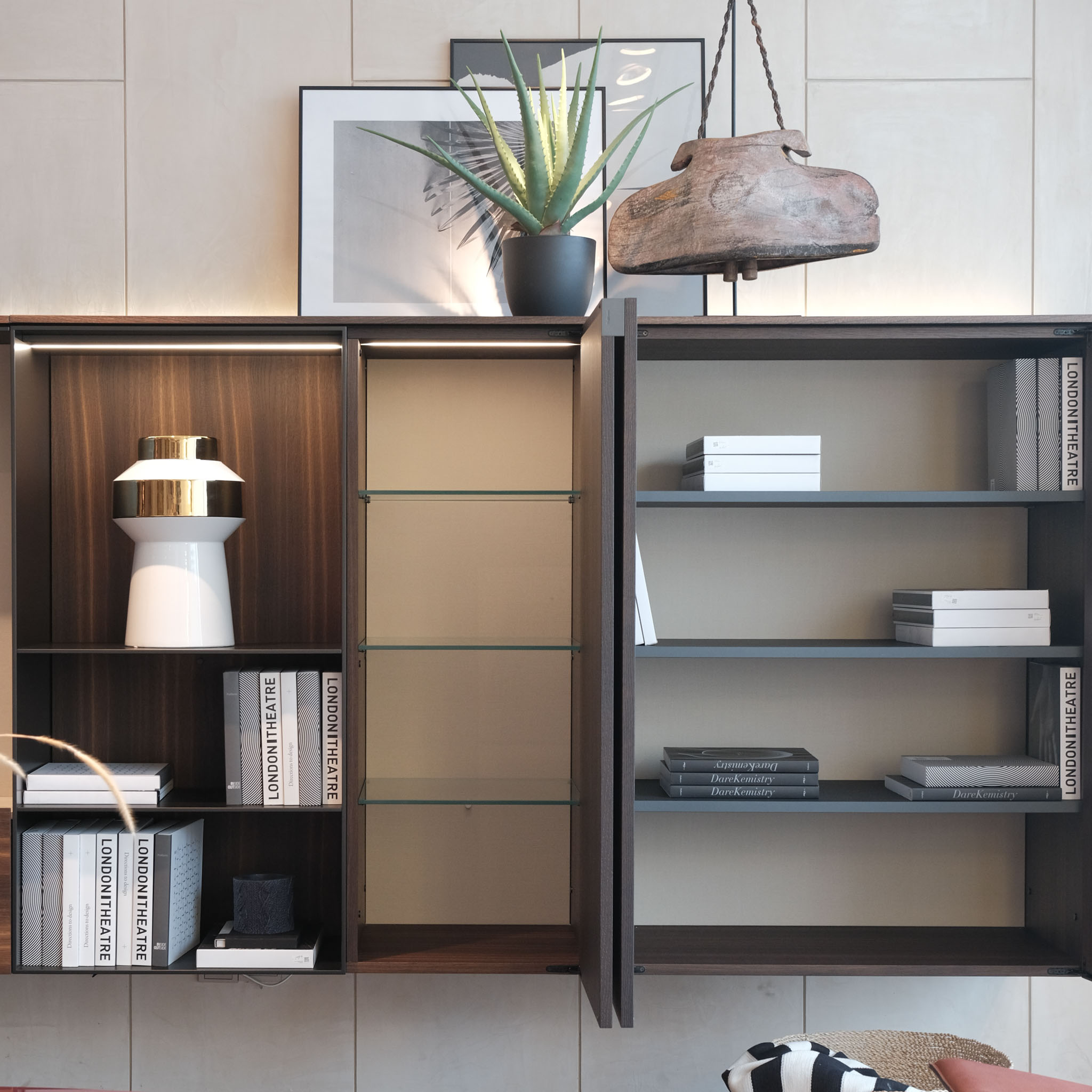Structure: Glass Doors: 3050 Glass Fume, Glass Shelf: 1000 Clear Glass, Wooden Doors: Spessart Oak, Storage Unit/Wooden Shelf: Ardesia Mel., TV Portal Upper Shelf/Living Open Storage: Mat Bronze 23, Frames/Top Profile/Handles: Ardesia, Drawers Top Inner Equipment: Mat Zecevo Marble