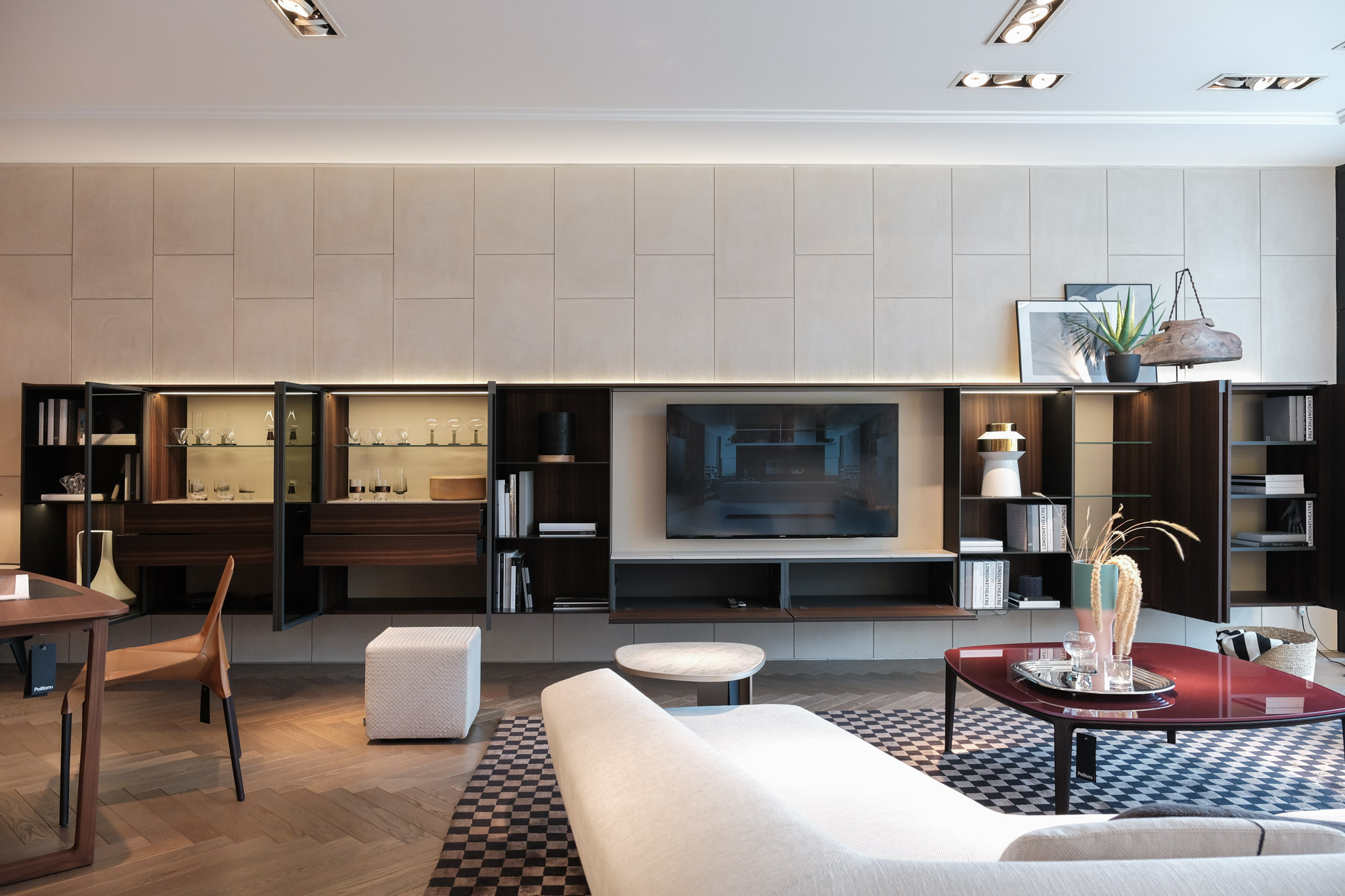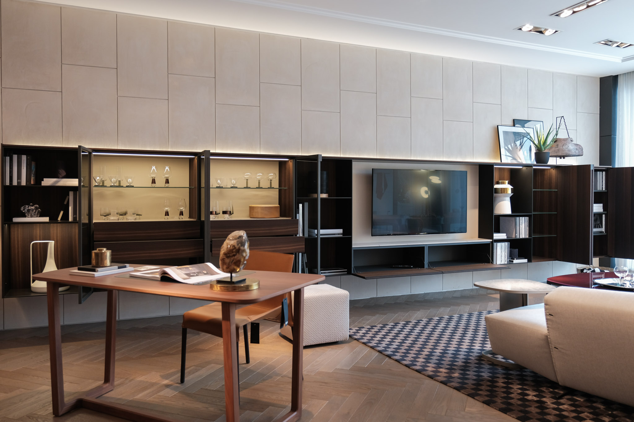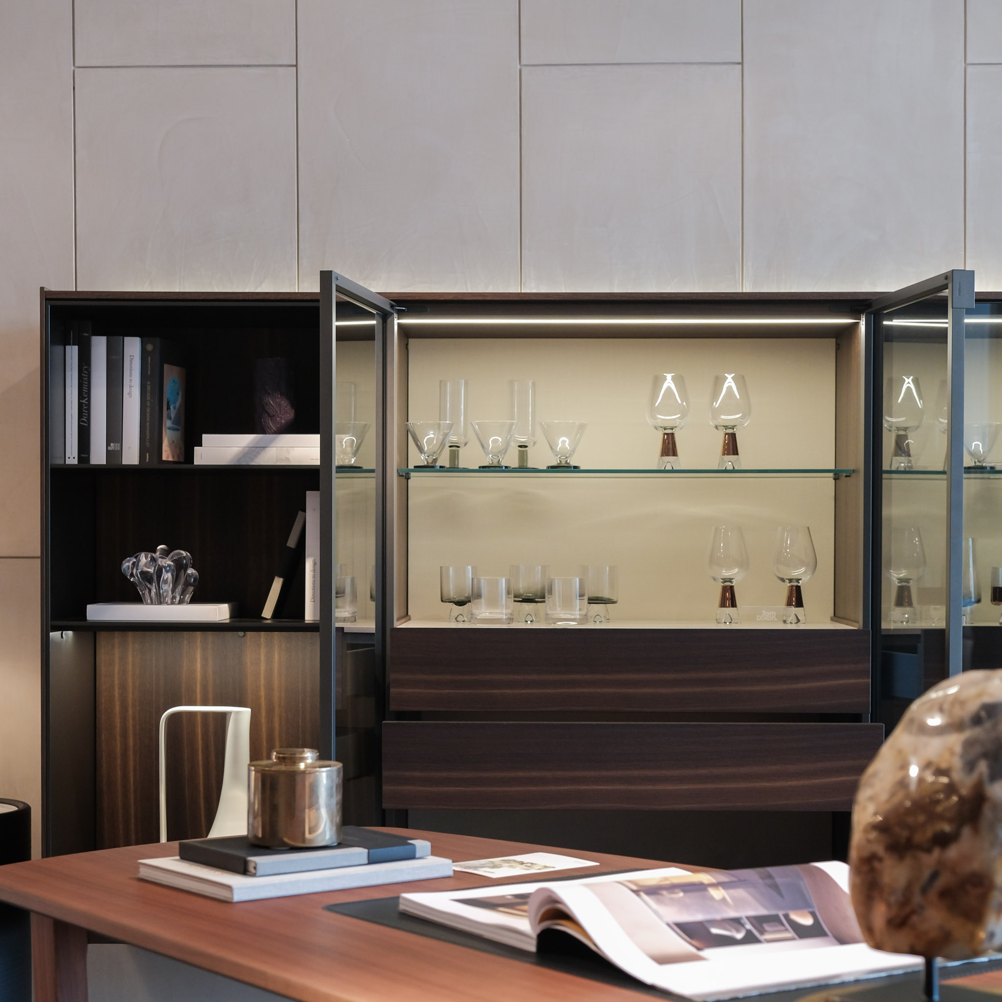 Structure: Glass Doors: 3050 Glass Fume, Glass Shelf: 1000 Clear Glass, Wooden Doors: Spessart Oak, Storage Unit/Wooden Shelf: Ardesia Mel., TV Portal Upper Shelf/Living Open Storage: Mat Bronze 23, Frames/Top Profile/Handles: Ardesia, Drawers Top Inner Equipment: Mat Zecevo Marble