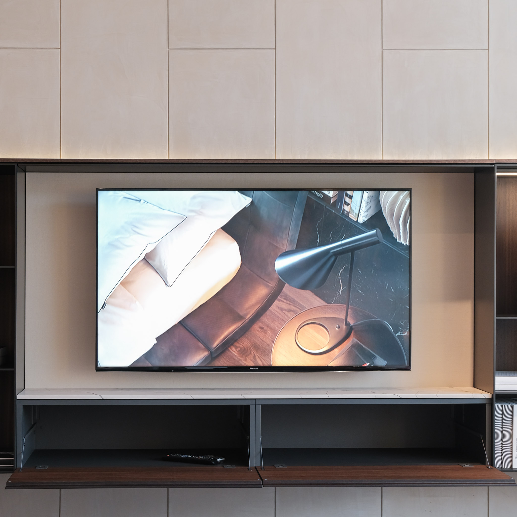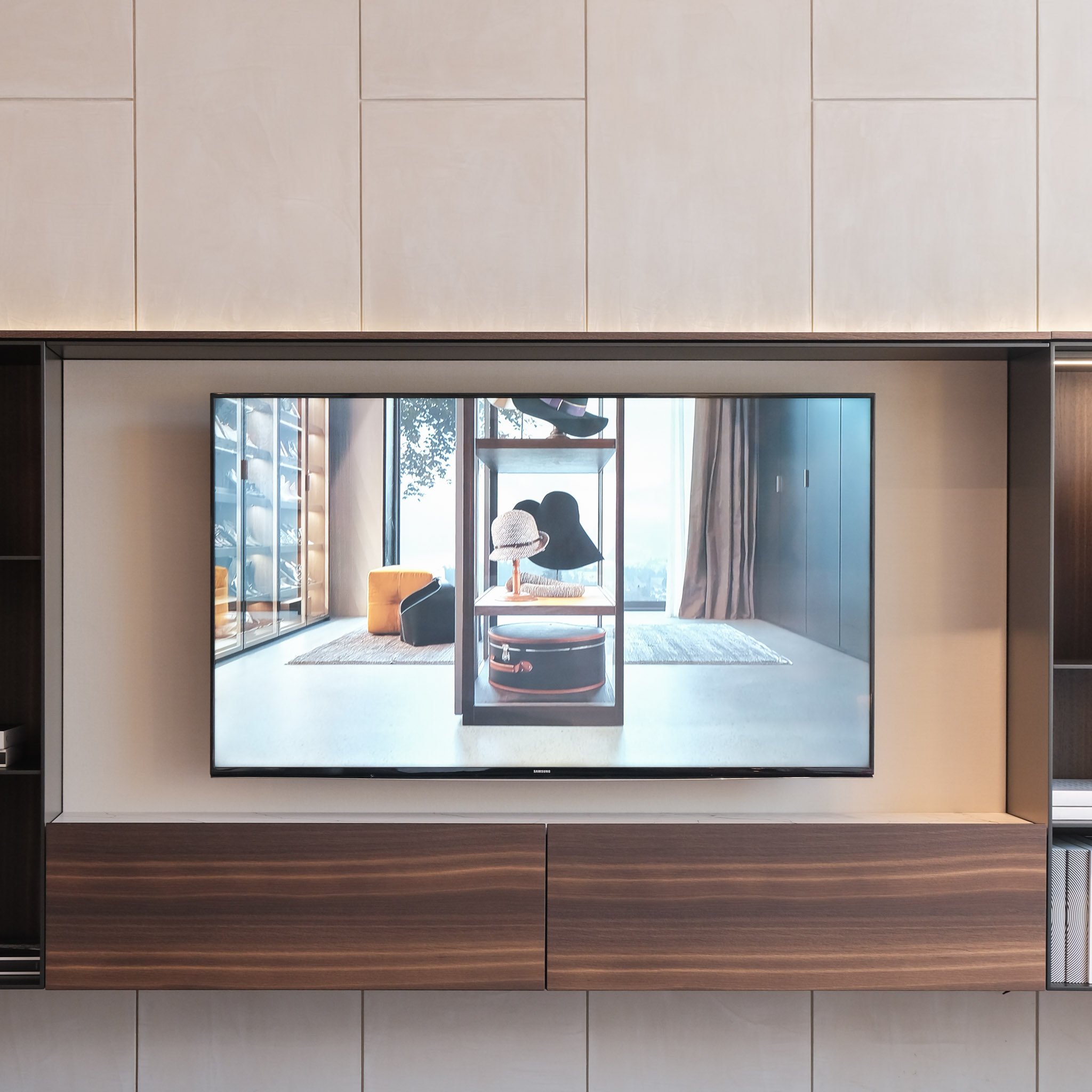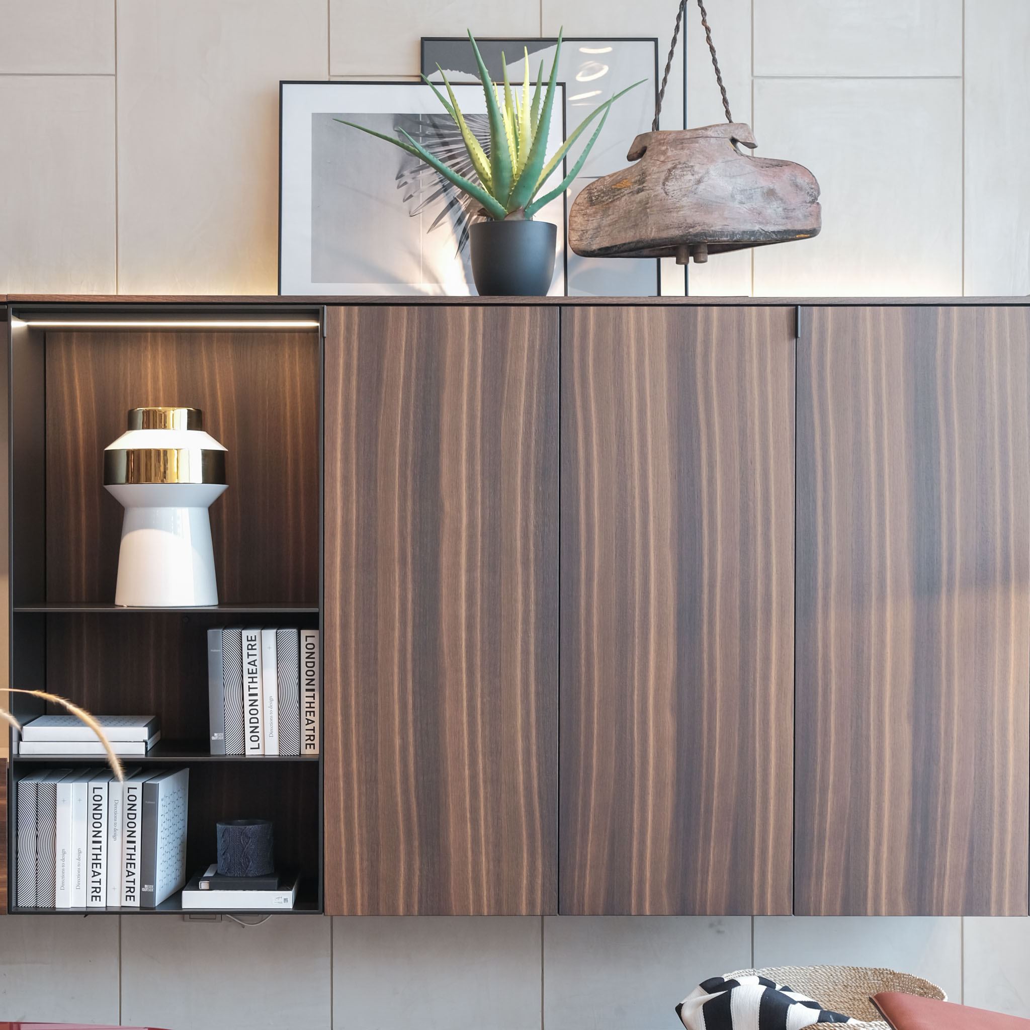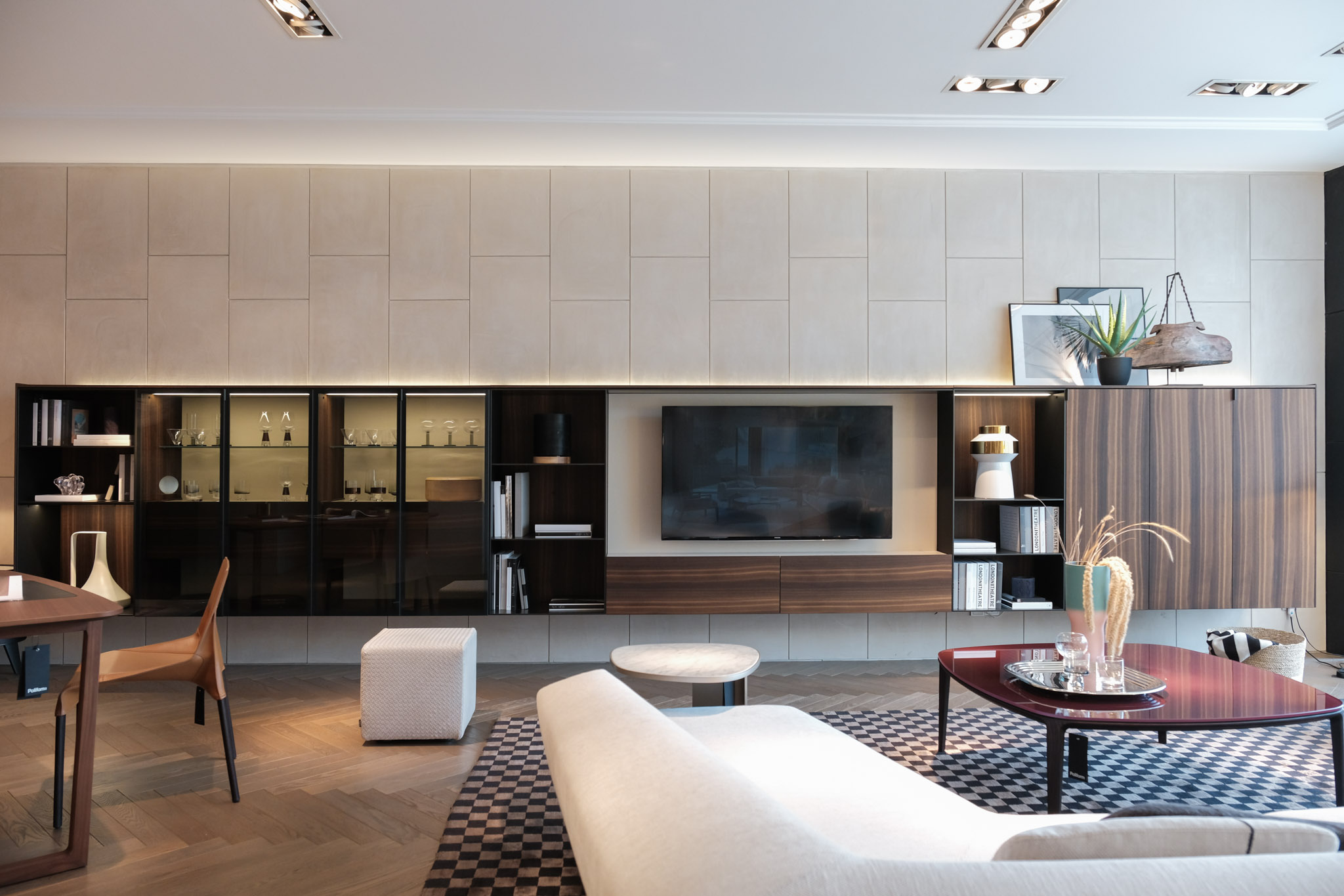 Structure: Glass Doors: 3050 Glass Fume, Glass Shelf: 1000 Clear Glass, Wooden Doors: Spessart Oak, Storage Unit/Wooden Shelf: Ardesia Mel., TV Portal Upper Shelf/Living Open Storage: Mat Bronze 23, Frames/Top Profile/Handles: Ardesia, Drawers Top Inner Equipment: Mat Zecevo Marble