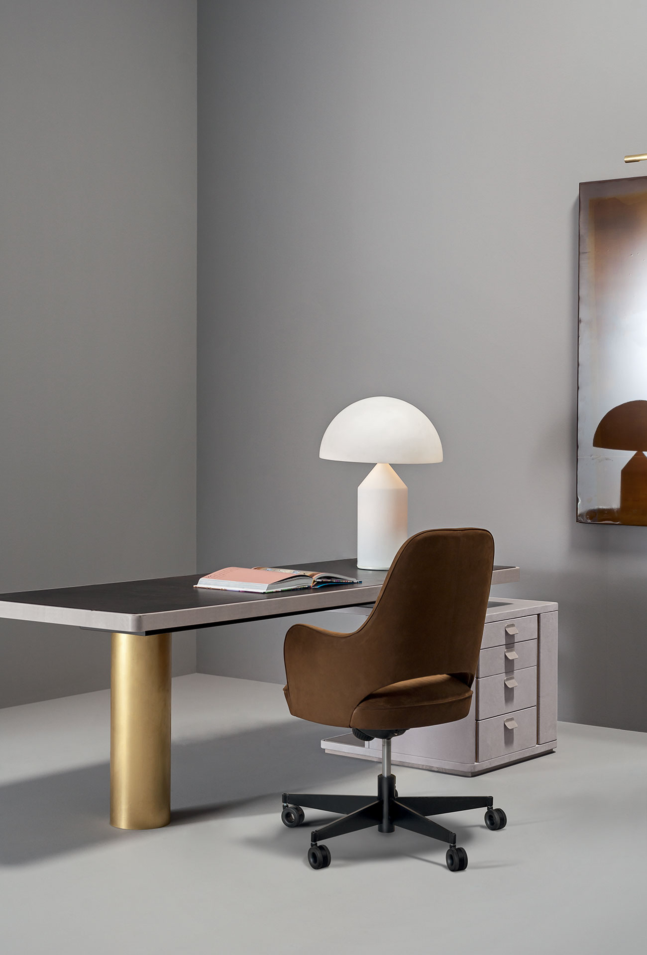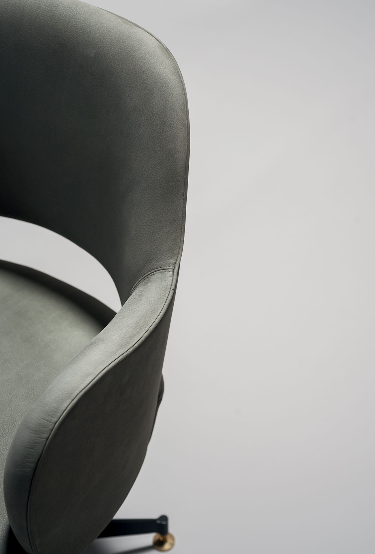 Backrest frame in curved poplar and birch plywood. Differentiated density polyurethane foam filling with acrylic fibre covers. Springing with elastic straps in covered rubber. Decorative piping in the same shade of leather or in contrast. Revolving base in black varnished metal with fixed brass feet or with wheels.