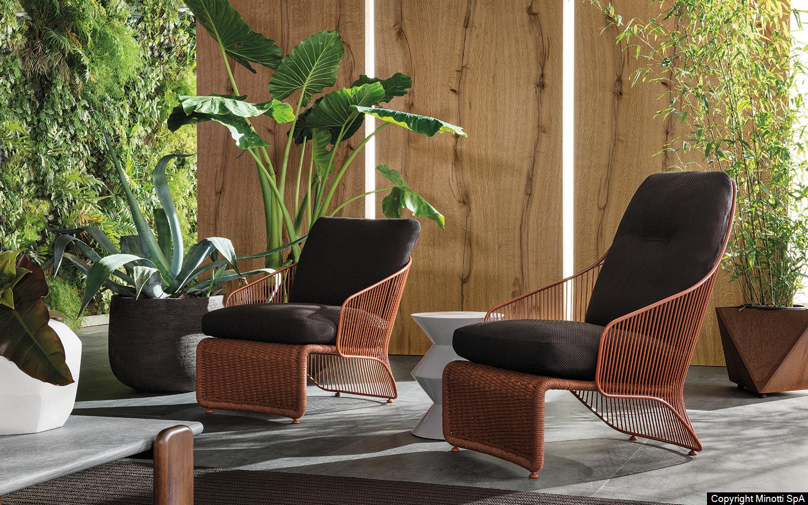 The Colette “Outdoor” armchair is available in two heights and can be paired with the footstool of the same name.