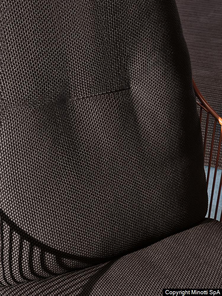 The enveloping shape of the metal backrest accommodates a soft cushion that makes the Colette “Outdoor” armchair even more comfortable. The profile of the metal structure is calendered, assembled and welded in more than 300 places. The metal structure is first sandblasted to remove any imperfections and then epoxy powder-coated to ensure optimal resistance to corrosion and weather. The structure of the seat ends at the front in a support structure wrapped in cord made from a special braided polypropylene fiber, available in four colors: Sand, Sunflower, Khaki Green and Rust. The epoxy paint for the metal structure comes in the same shades as the cord Clay, Sunflower, Khaki Green and Rust.
