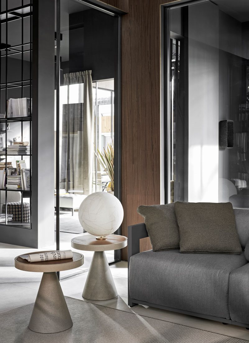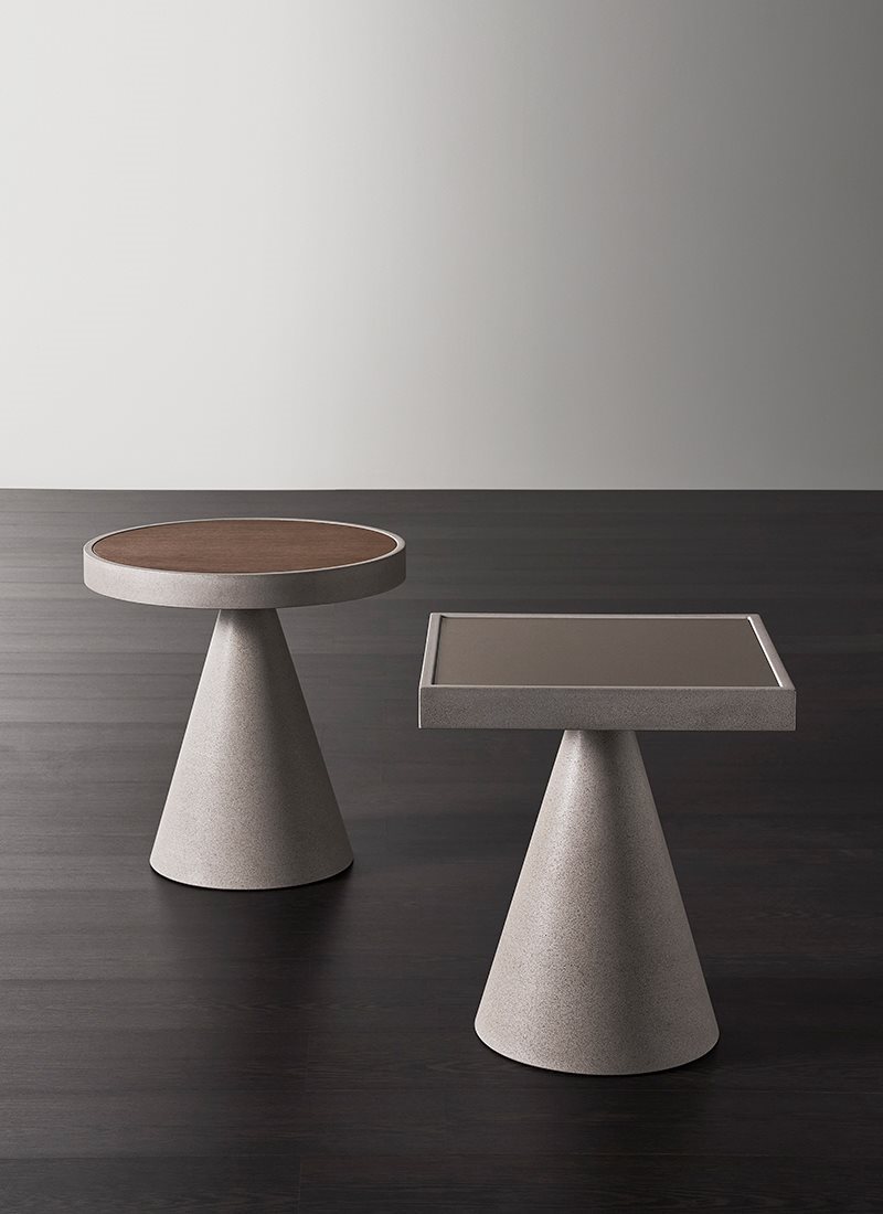Cone is a collection of coffee tables with a cone-shaped base in Ductal® concrete with a light gray finish. Made up of very fine natural mineral components and organic fibers, which make it resistant and flexible,