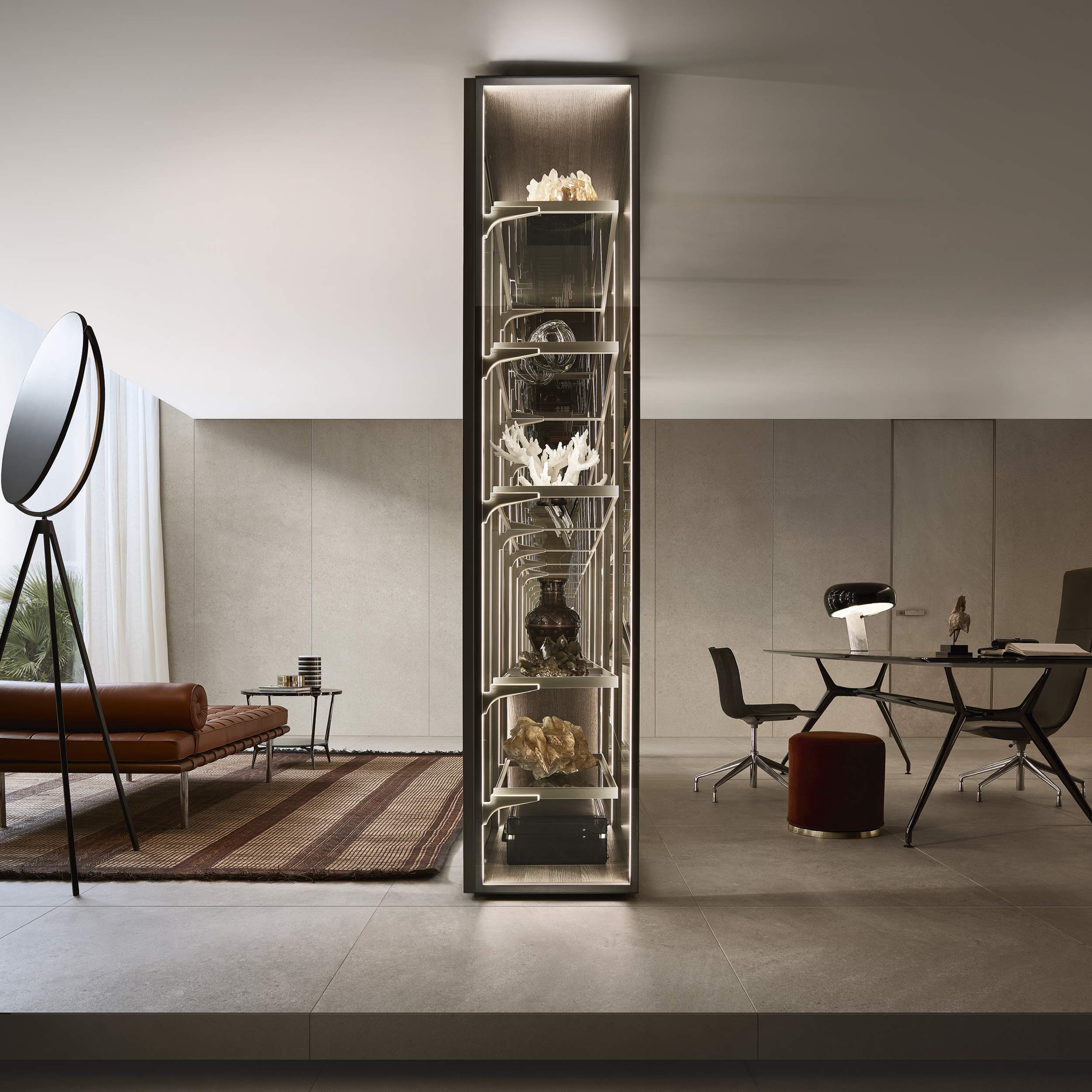 The perfect finishing of the backpanels and of the inside of the doors make Cover freestanding an ideal system also for niche solutions, also combined with integrated through-way. The internal structures are fixed directly to the uprights without visible screws, which allows a free and easily interchangeable arrangement.