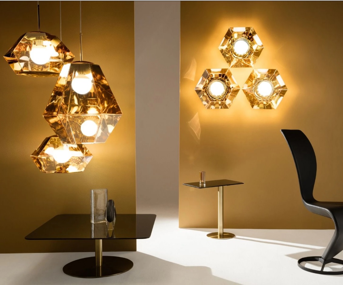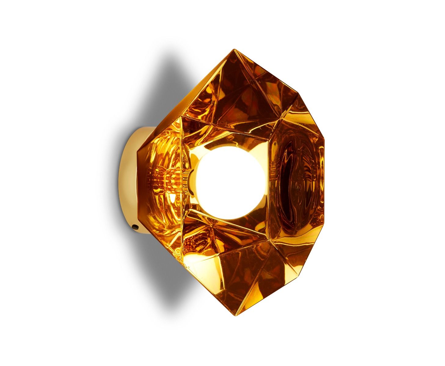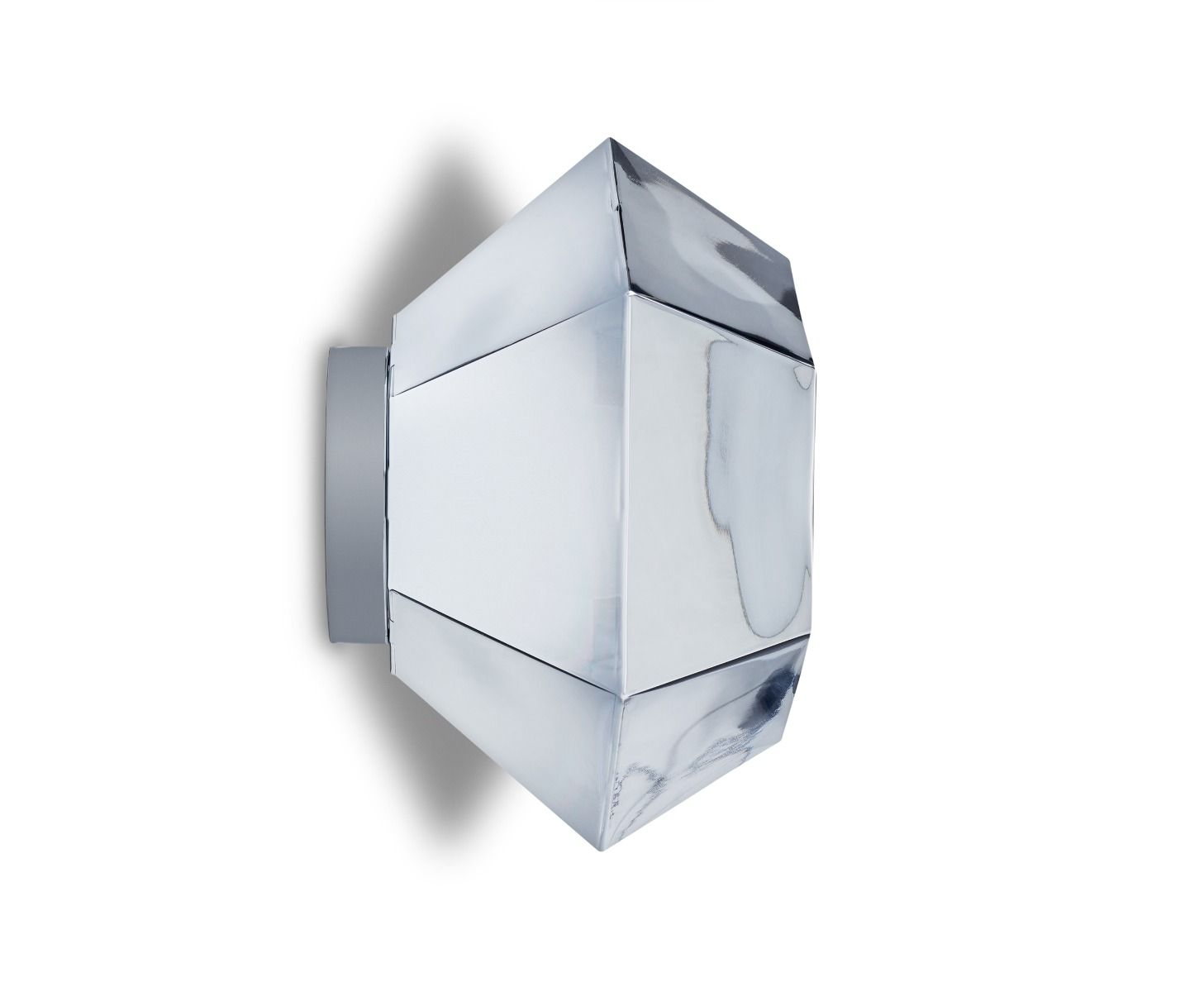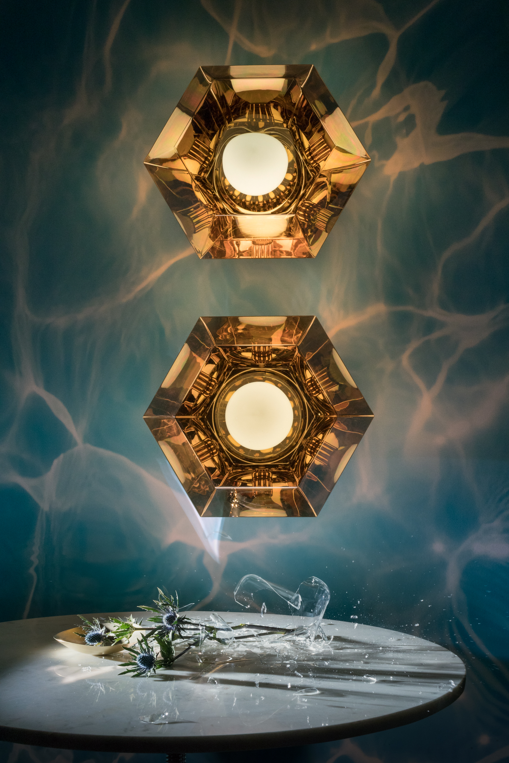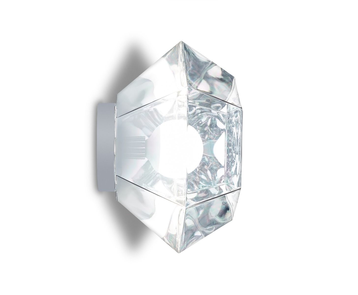 Futuristic and faceted, Cut is an exercise in optics. Its space-age mirror finish when off transforms to reveal a translucent kaleidoscopic gem when switched on. Hypnotising reflections of the luminous orb within repeat infinitely within the diamond cut, vacuum metallised interior. Available in chrome, gold, smoke and blue.