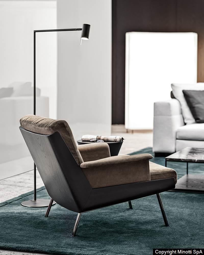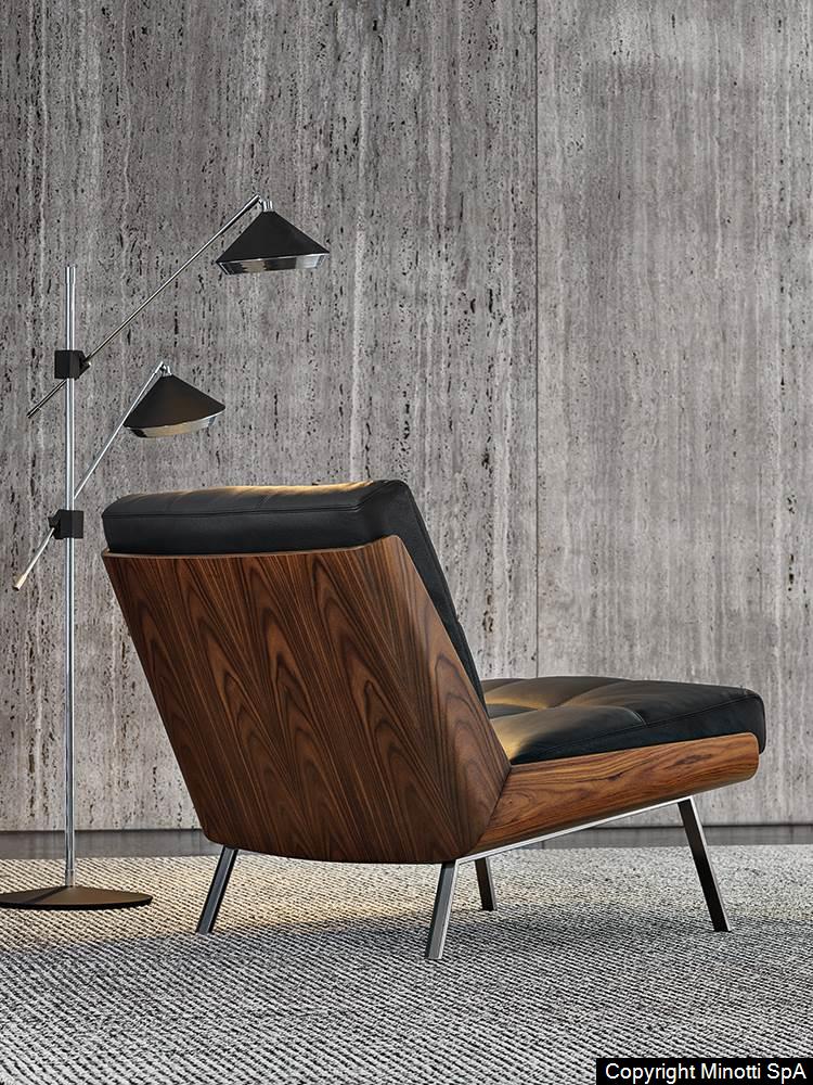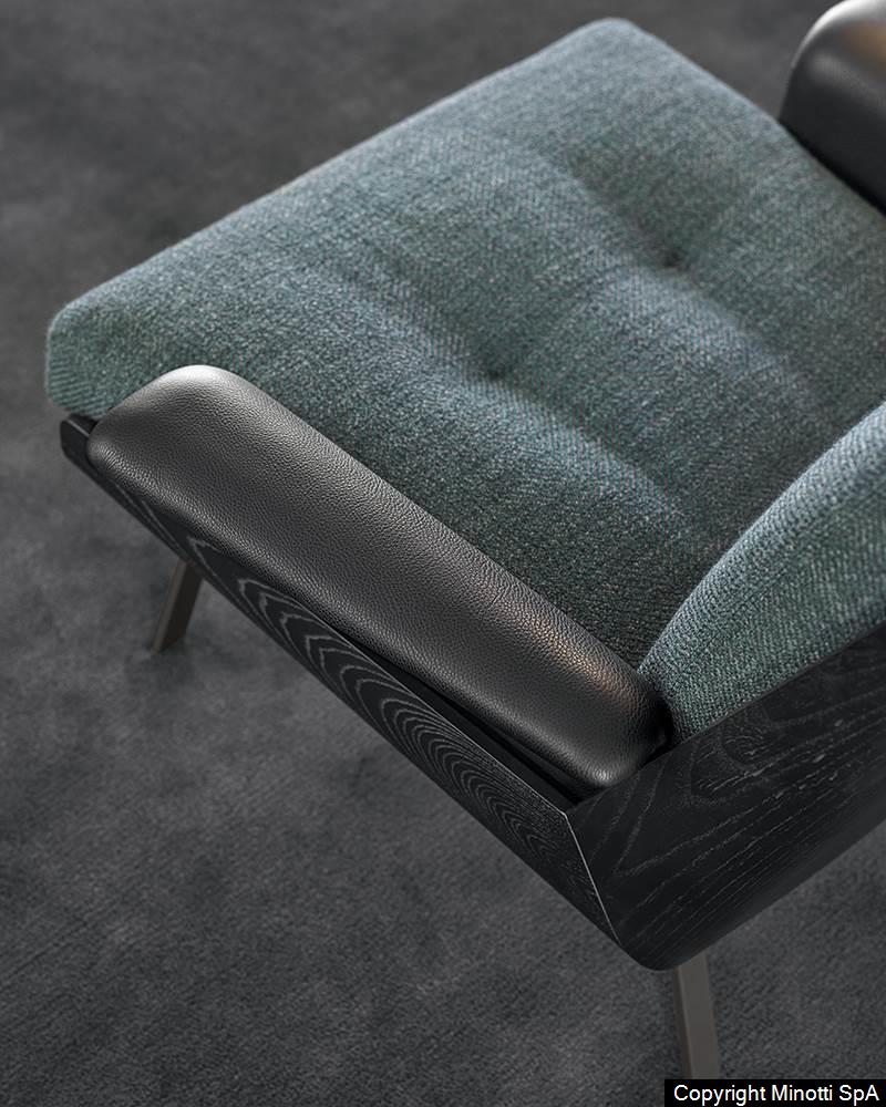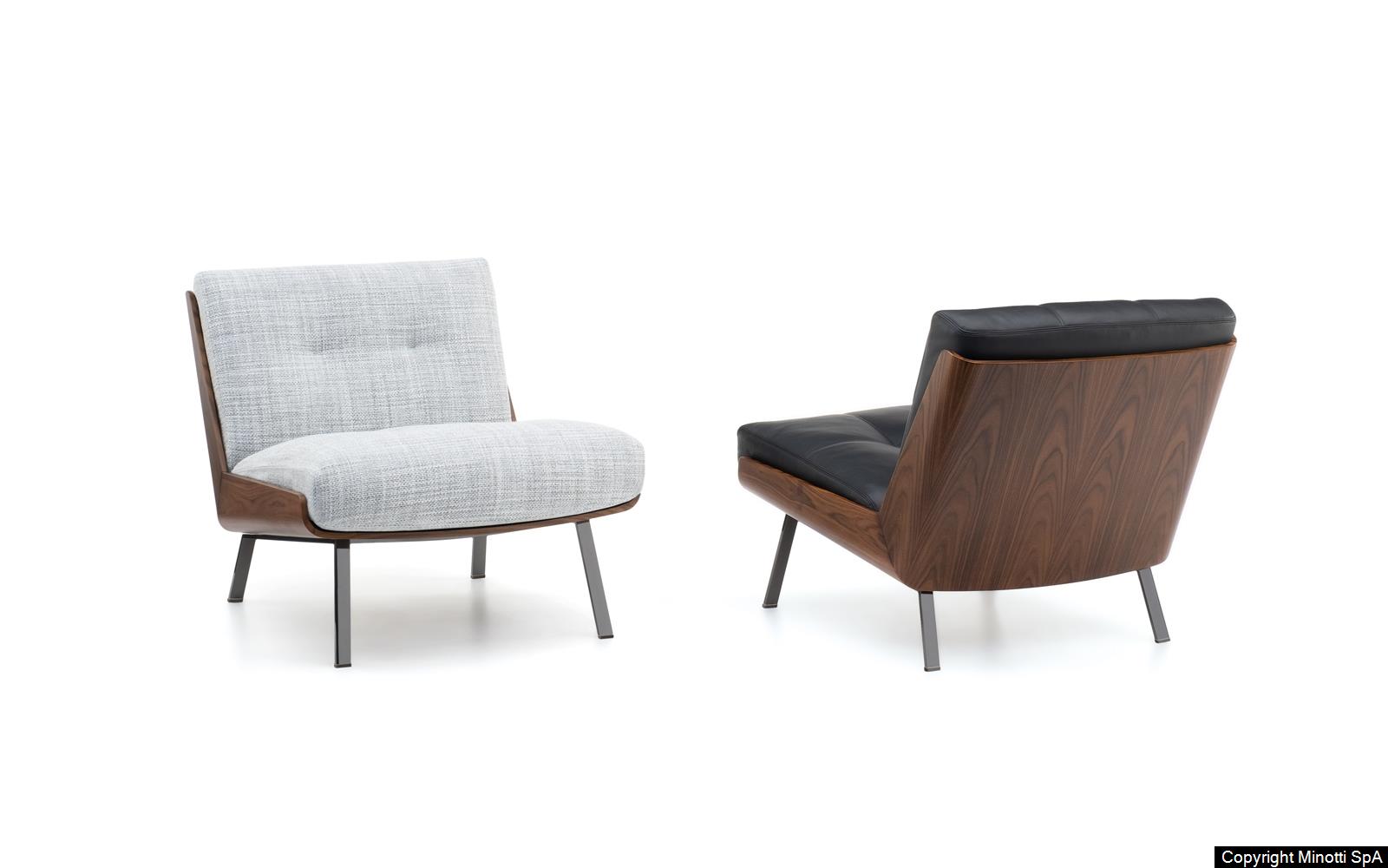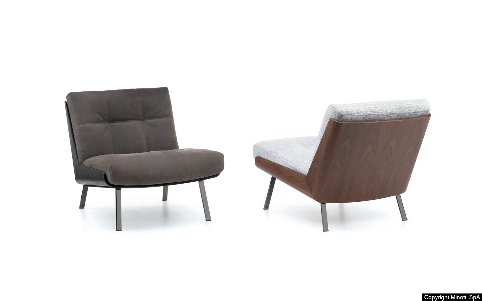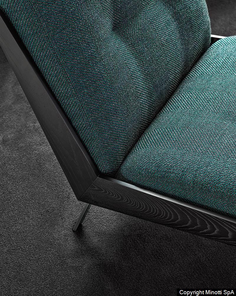 Created using sophisticated wood crafting techniques, the curved shell comprises two elements joined at a 45° angle, with a sloping backrest that guarantees maximum comfort. In palisander Santos or flamed ash veneer with Liquorice colour stain, the shell offers a snug fit for the cushions, and sits on a metal frame with legs in a Black-Nickel finish.