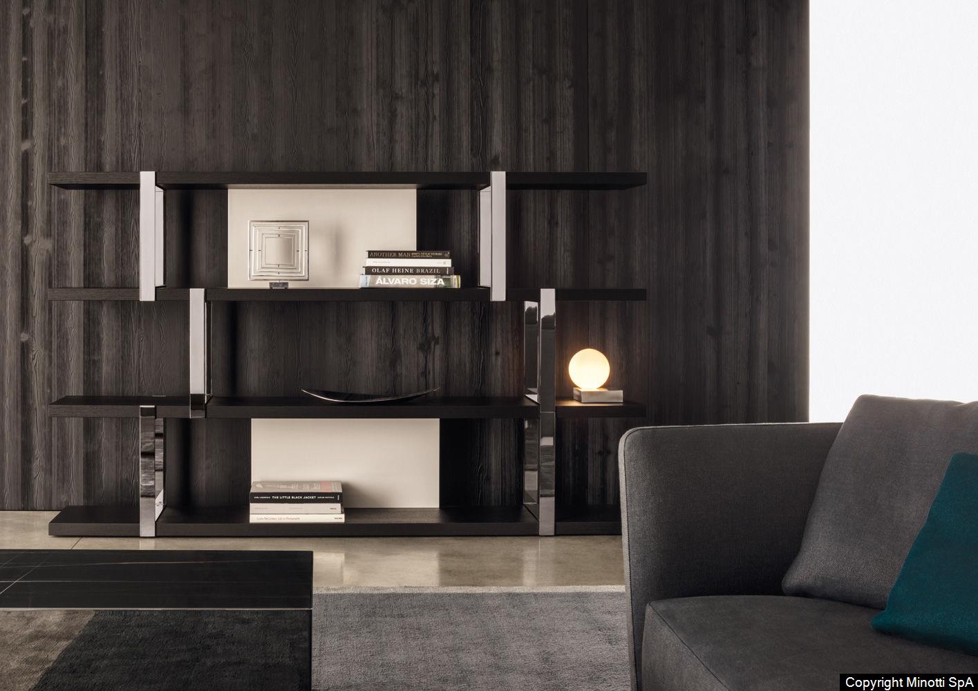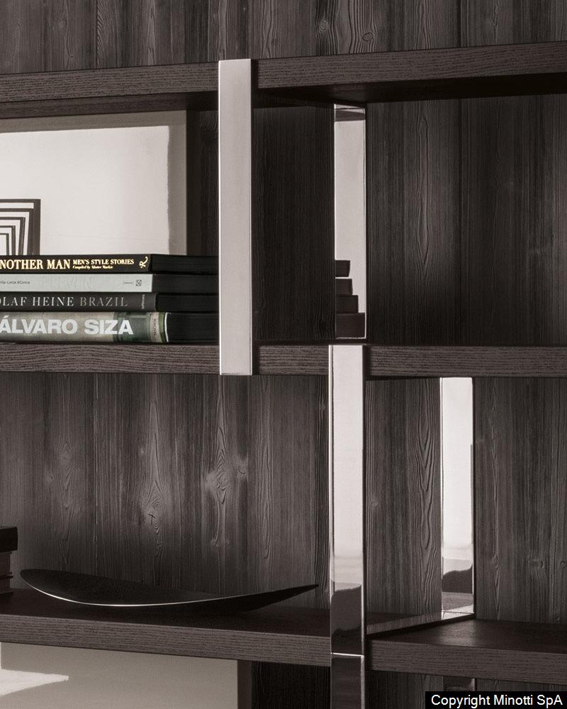 The Dalton bookcase comes in a series of new finishes that multiply the number of ways it can be used and lead the way to new stylistic interpretations. The new finishes include the possibility of having the back panels in Sucupira veneer with stained Mink finish, while the thick shelves are available in glossy Warm Grey lacquer. The vertical metal supports have a glossy bronze satin painted finish.