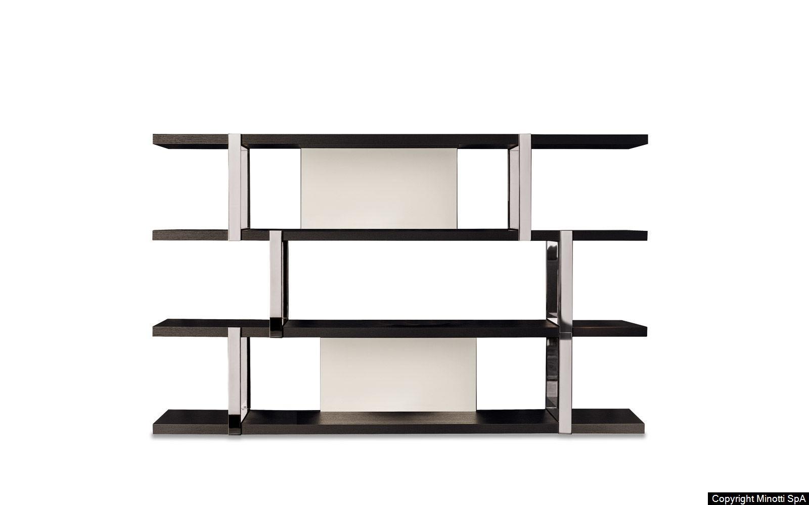 The Dalton bookcase comes in a series of new finishes that multiply the number of ways it can be used and lead the way to new stylistic interpretations. The new finishes include the possibility of having the back panels finished in Warm Grey or Granite glossy lacquer, while the thick shelves are available in black sand-blasted oak. The vertical metal supports have a bright chrome finish and, unlike the Pewter-color painted versions, do not have the “mille righe” effect finish.
