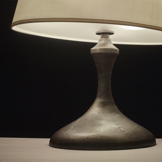 Beauty and technology Elisabeth is a table lamp with a Victorian flavor, characterized by precious materials and soft shapes that recall the profile of a woman. The lamp turns on when touched, it is in hammered bronze with oval lampshade in linen, cotton or hand-embroidered silk. LED lighting with ICOSAEDRO technology.