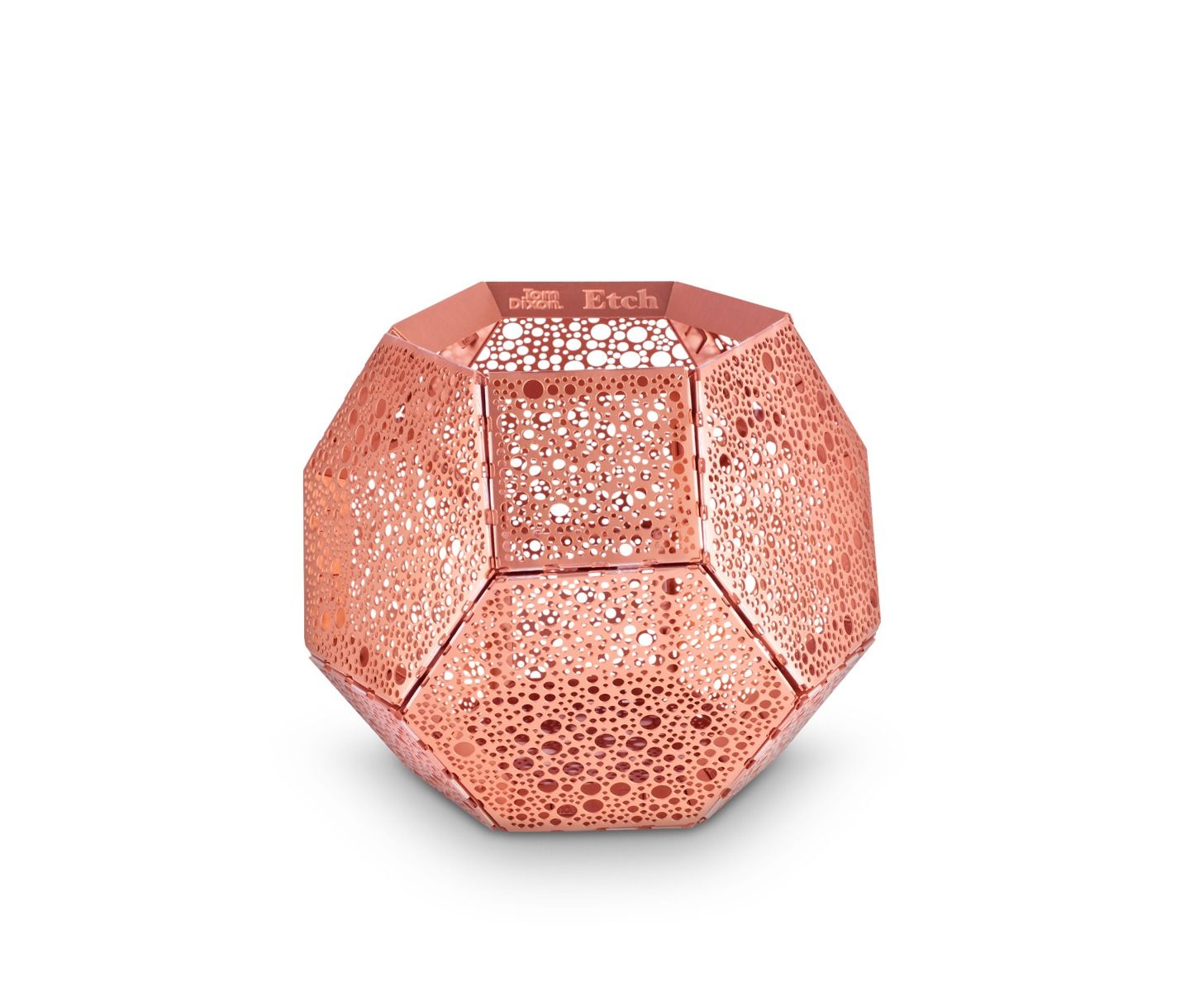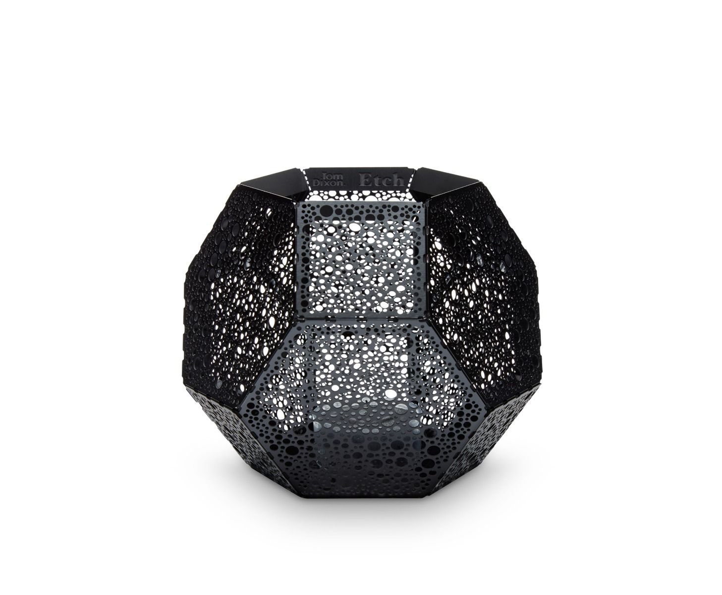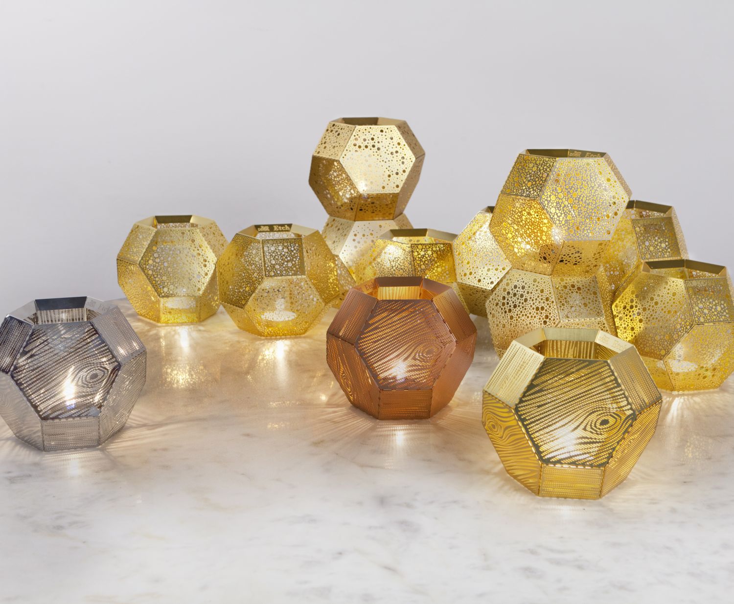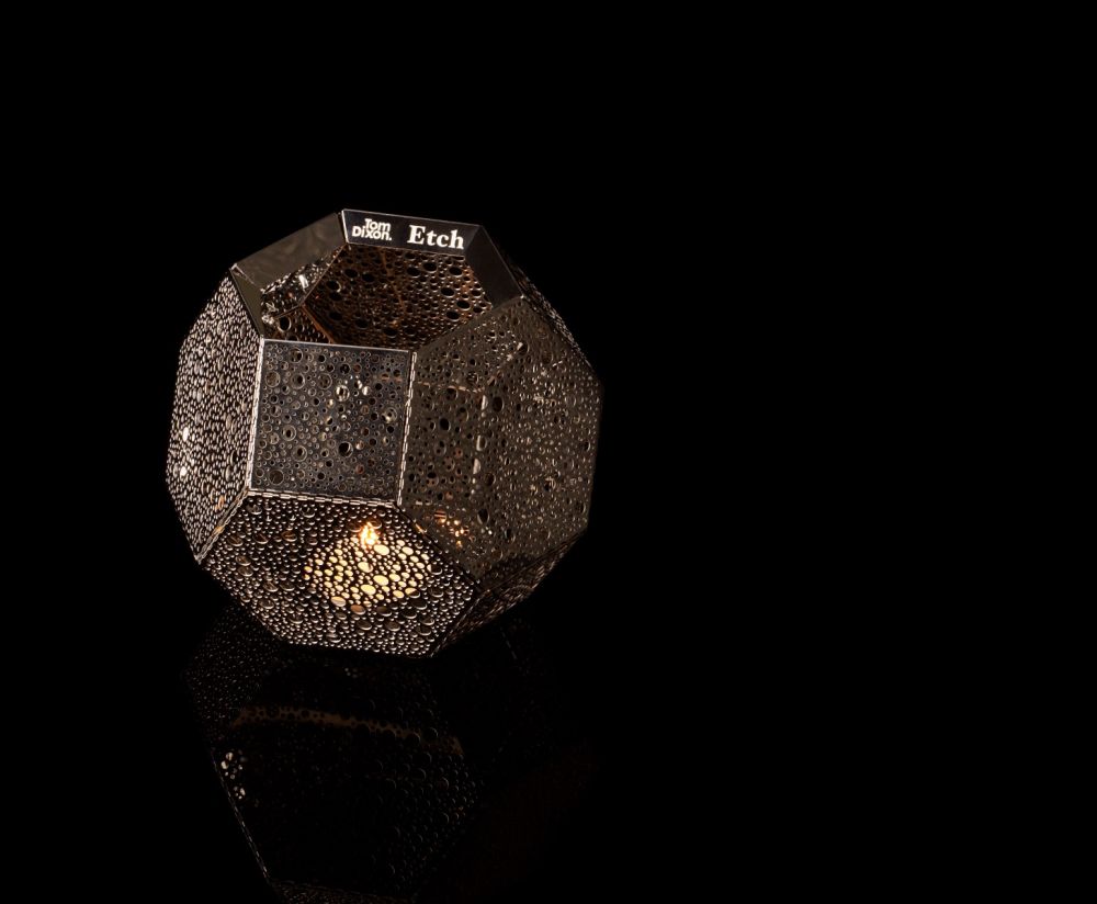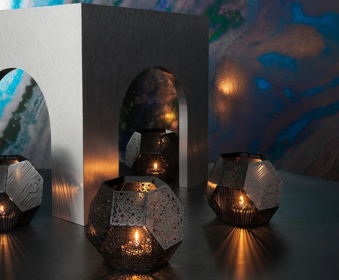 These geodesic pendants and tea light holders are formed of finely pierced flat metal sheets tabbed together like Victorian tin toys. Using digital acid etching methods, Etch is pattered for the effective filtering of light designed to cast an intricate set of shadows. The collection also features tea infusers.