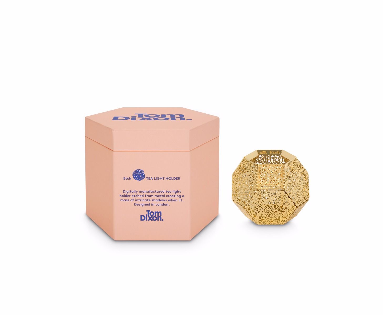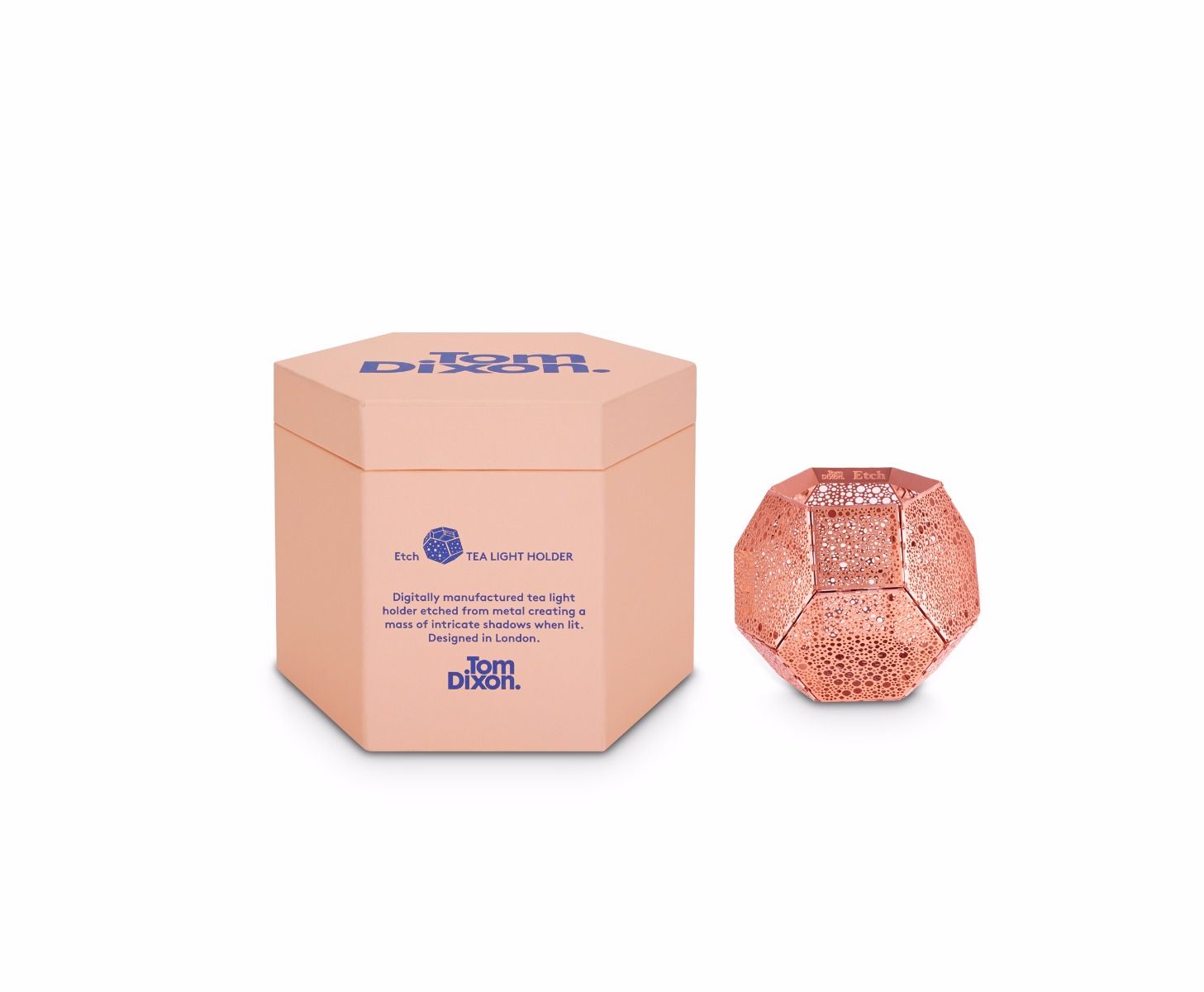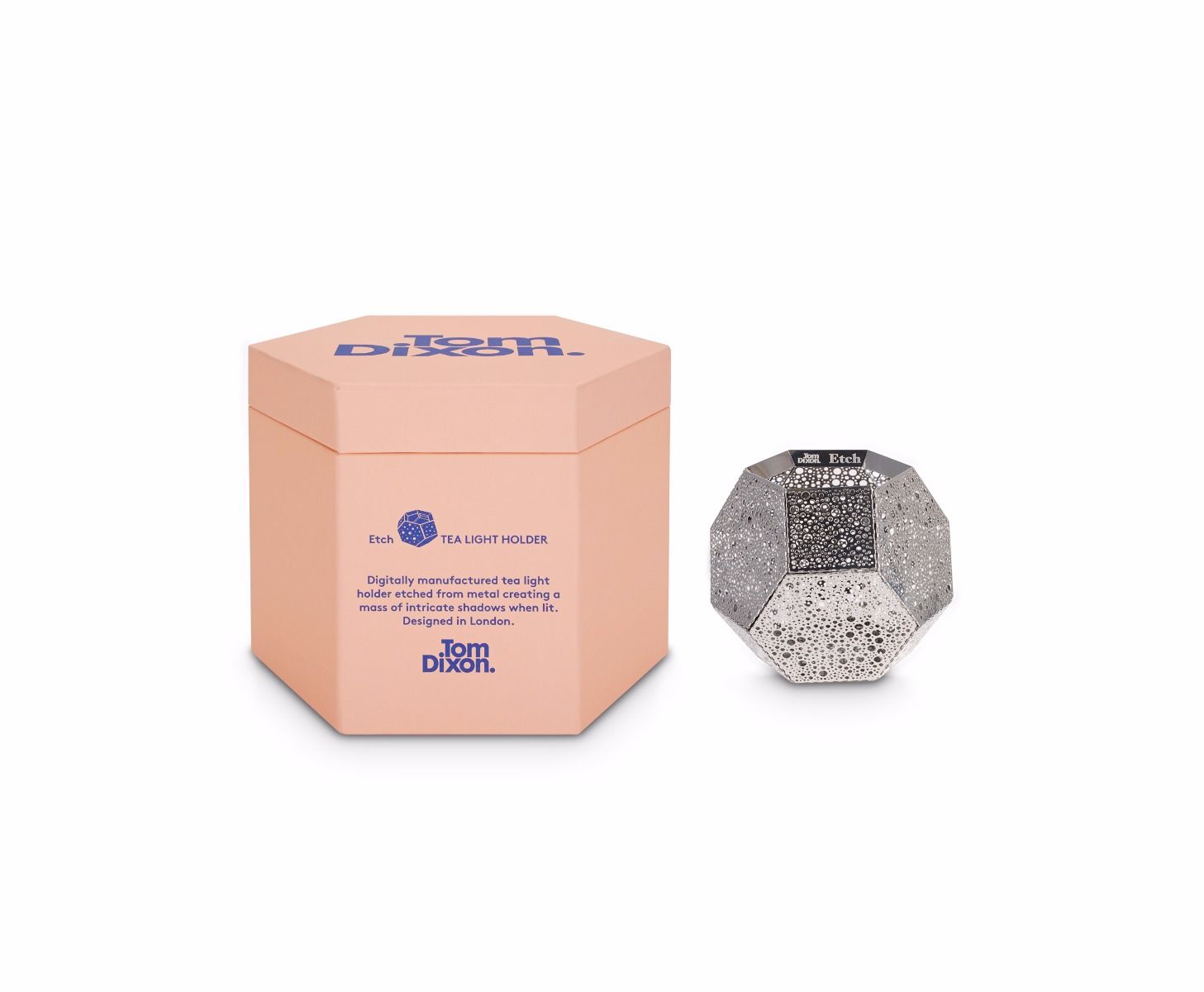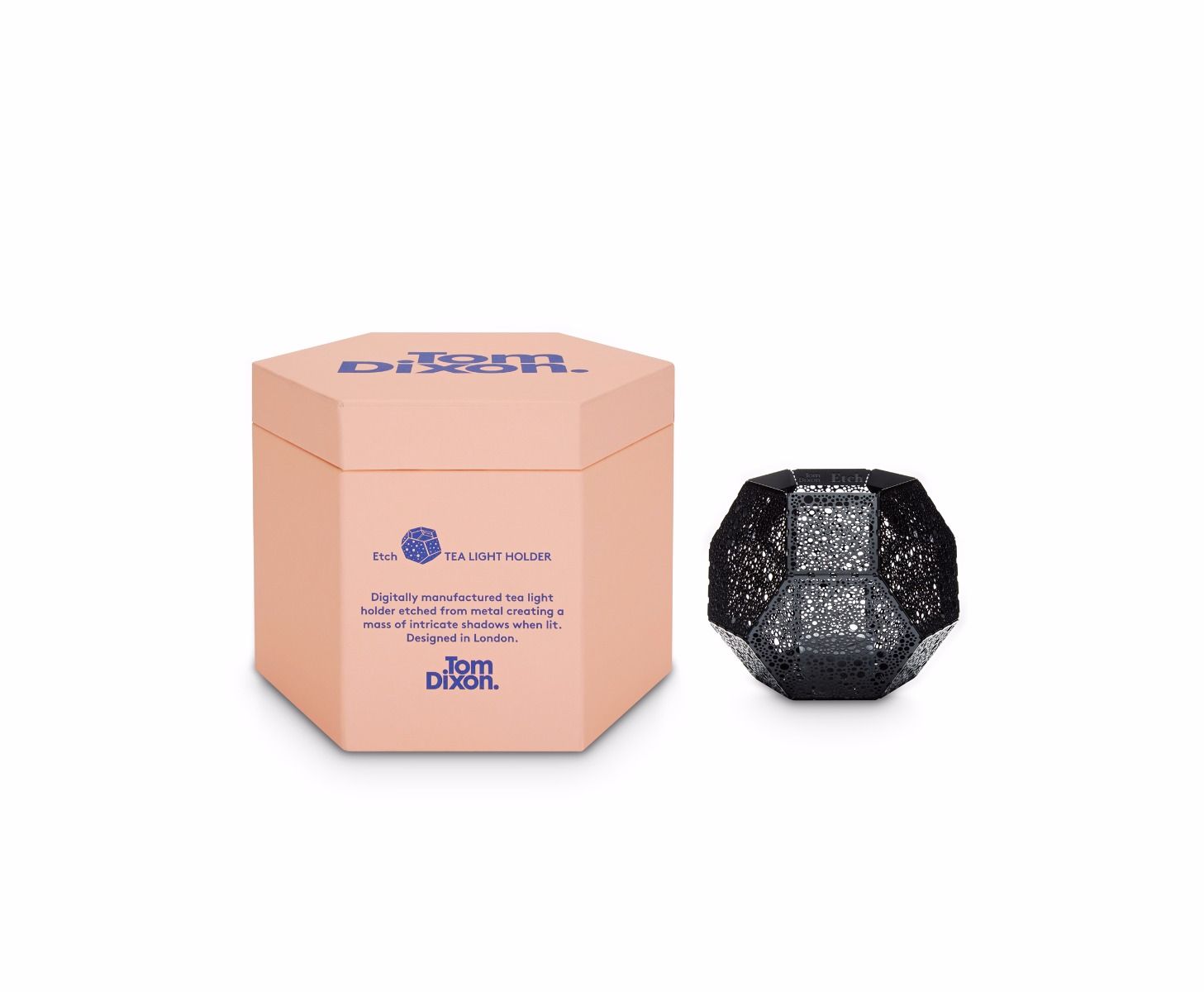 These geodesic pendants and tea light holders are formed of finely pierced flat metal sheets tabbed together like Victorian tin toys. Using digital acid etching methods, Etch is pattered for the effective filtering of light designed to cast an intricate set of shadows. The collection also features tea infusers.