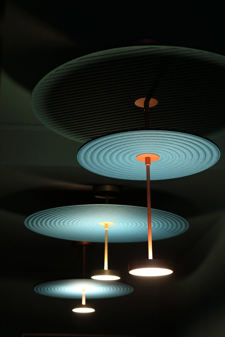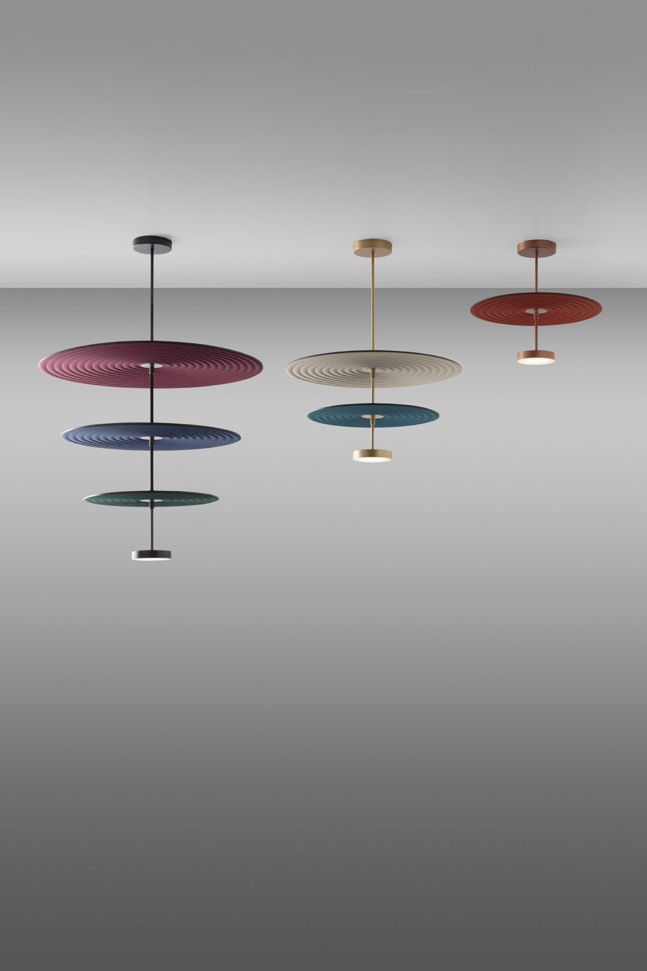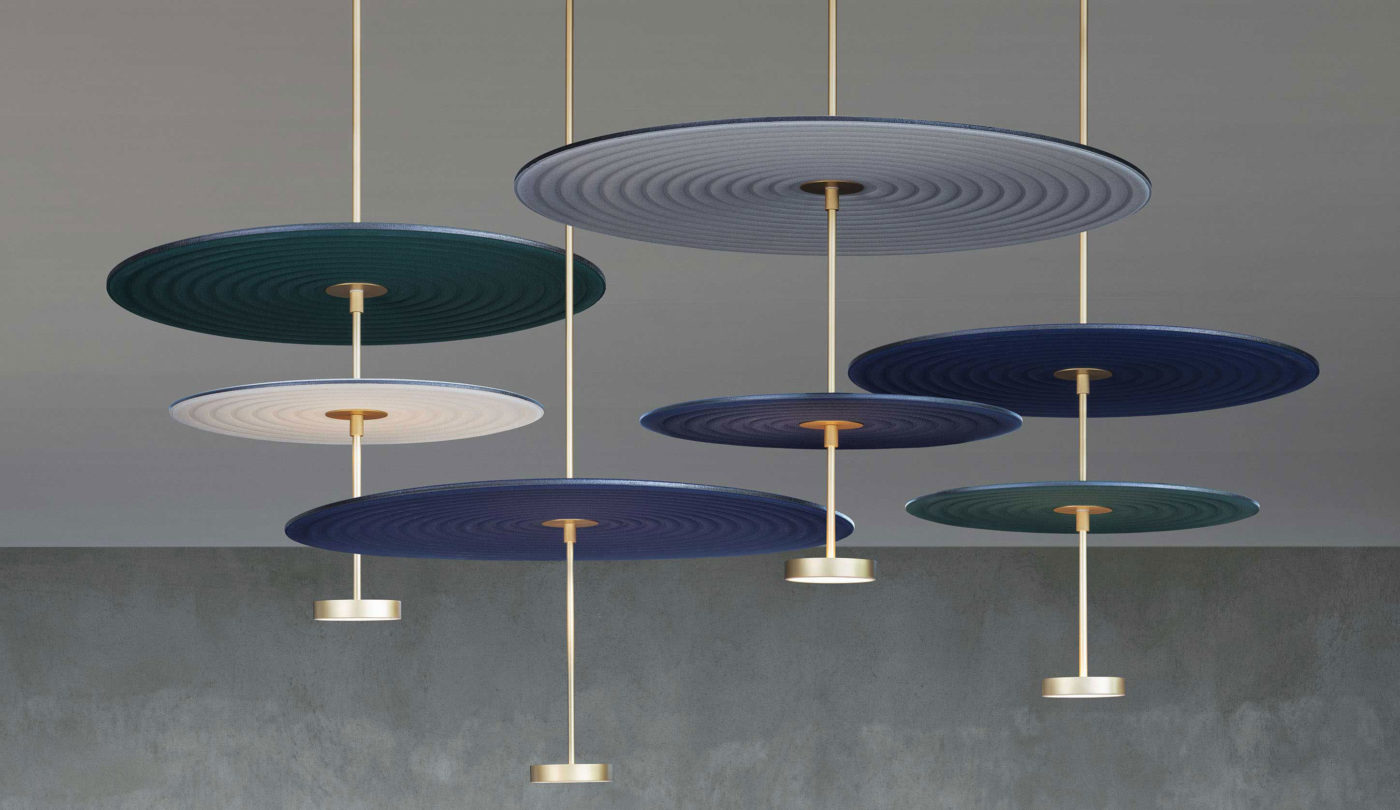 Feel comes from the combination of sound absorbing textile discs and luminous stems. The coloured discs, in matching or contrasting colours, give life to ever-changing configurations, to be suspended from the ceiling or fixed to the wall, in order to absorb noise and enjoy silence.