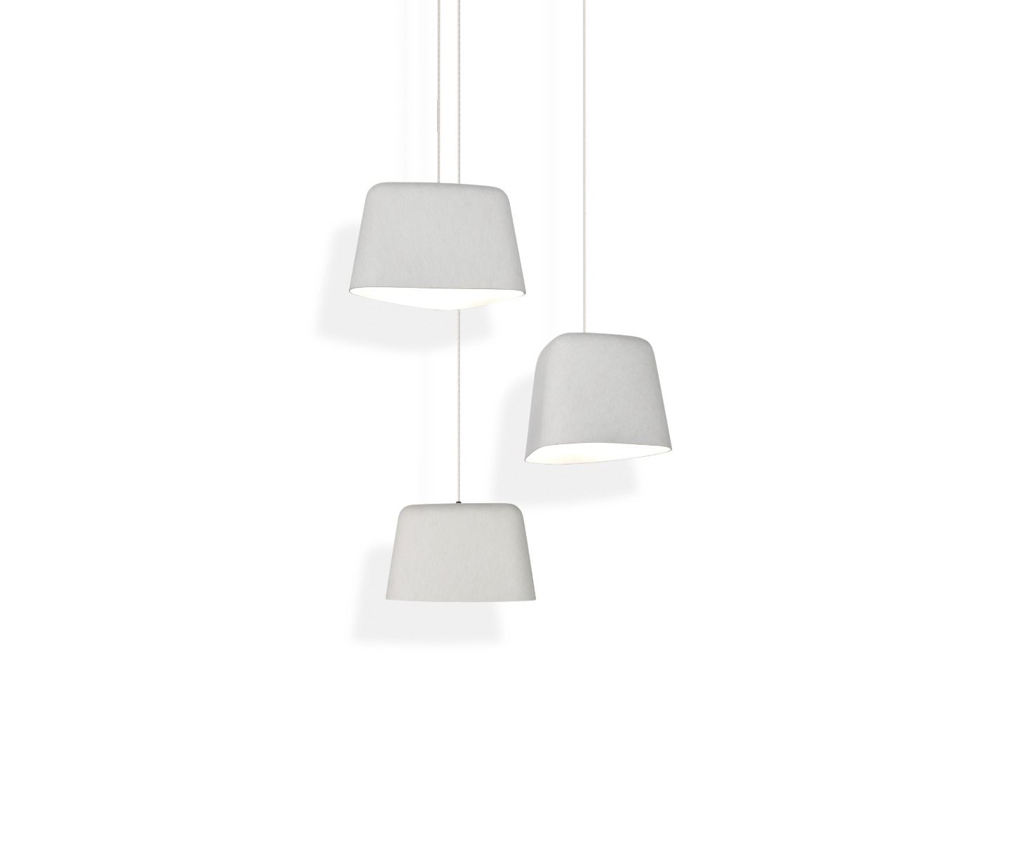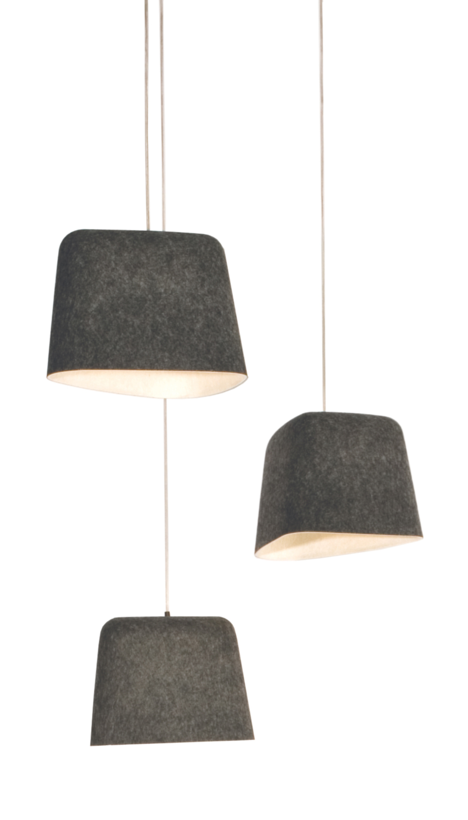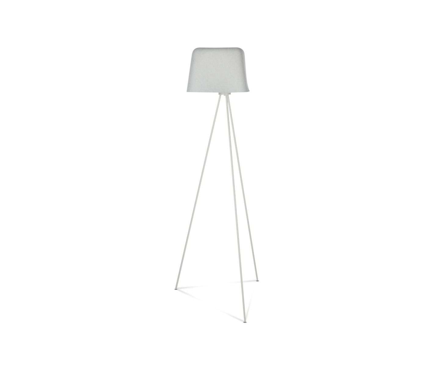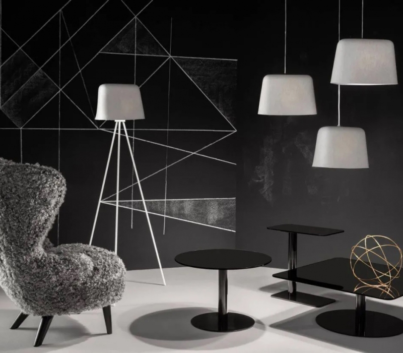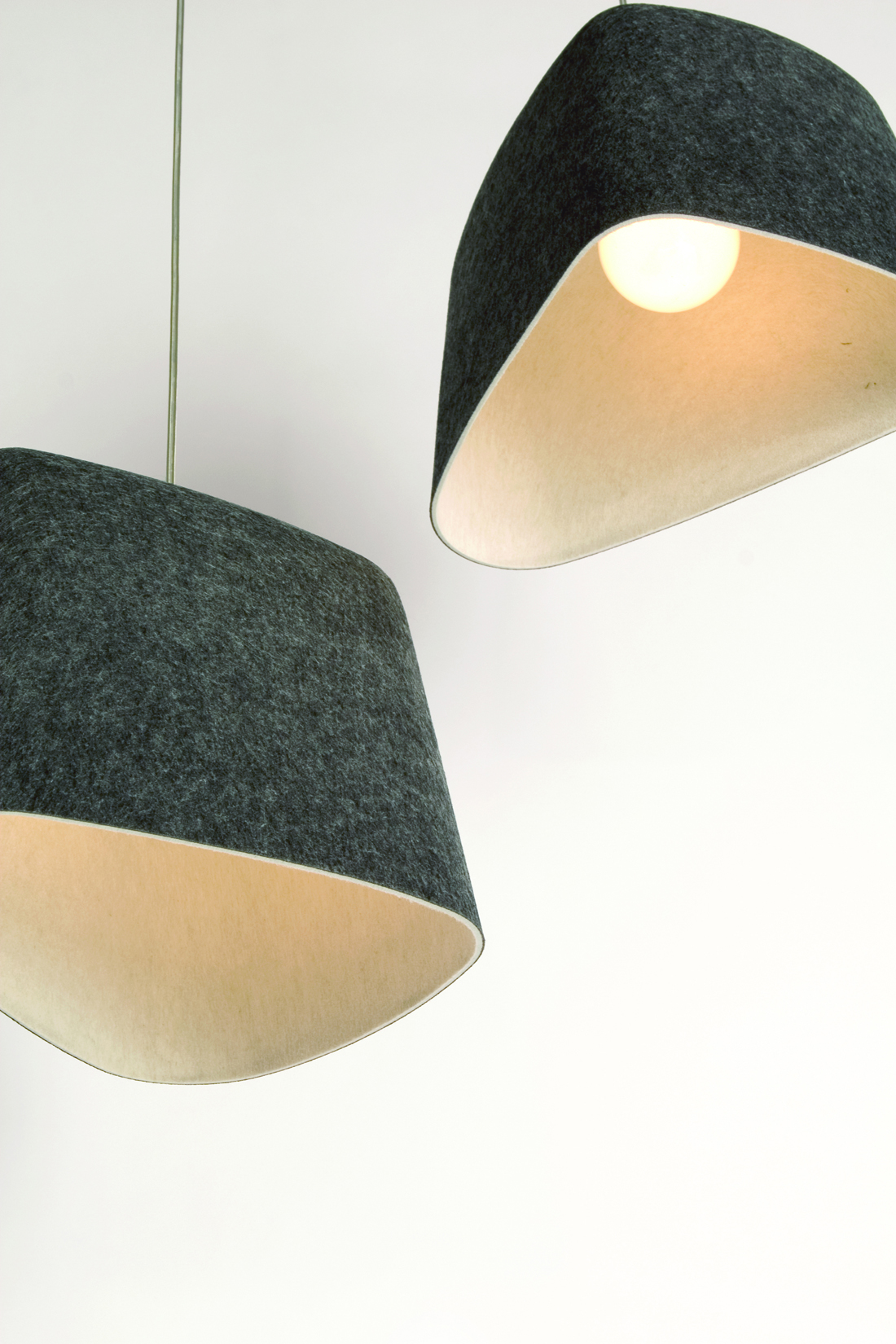 The texture and depth of Felt adds warmth to any spaces. Made from double-layered felt heat-pressed into a soft organic shape, it features a grey exterior and white interior. Available as either a pendant suspended from a slender wire or floor version on a black tripod stand.