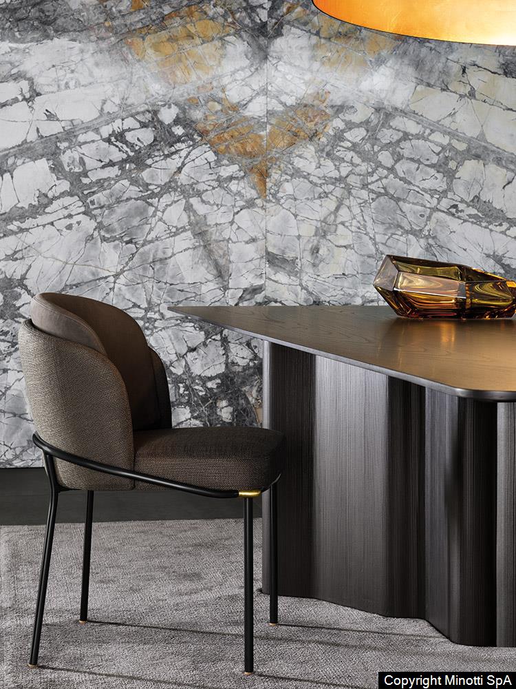 The padded structure rests on elegant, slender legs in matt Black painted metal tubing, embellished with details in polished Gold, Light Bronze or Black-Nickel finish.