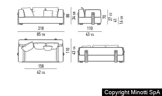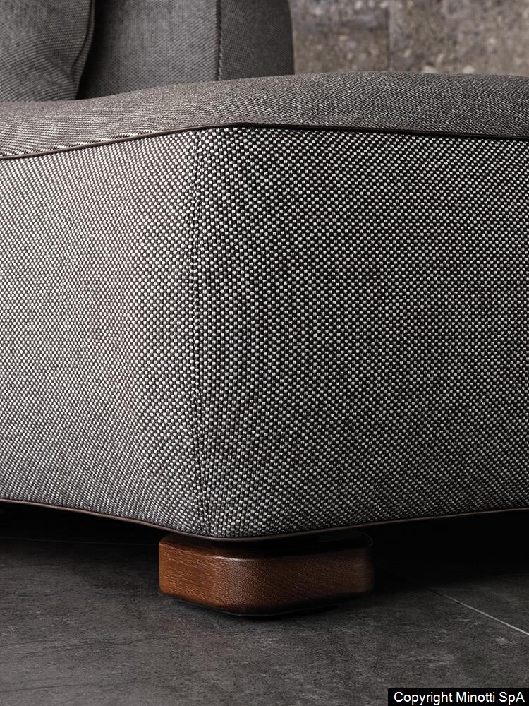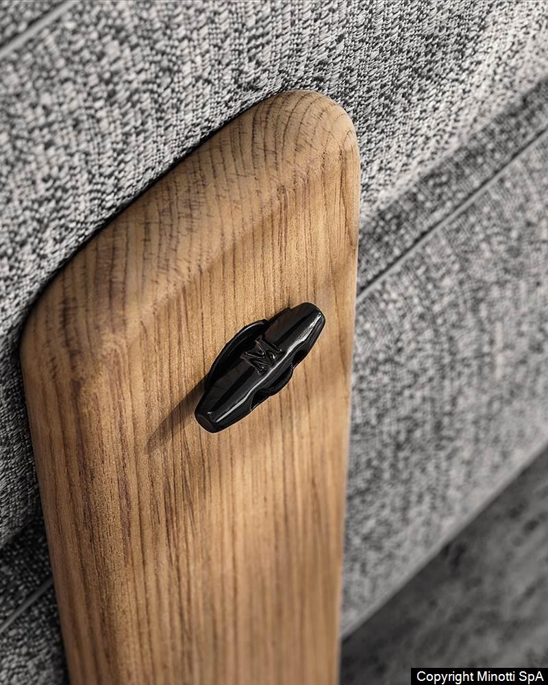 The backrest cushions are attached to the wooden rear supports thanks to refined Pewter coloured metal frog fasteners, allowing for the quick release of the cushions and consequently an easy removal of the coverings.