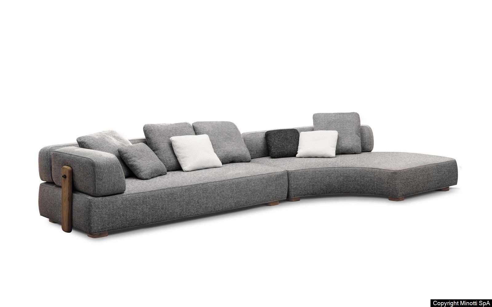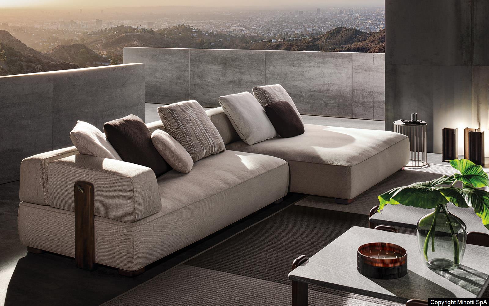 The seating system presents itself as a carefully-designed collection of soft and geometric volumes, defined by profiles in eco-leather suitable for outdoor use, available in four colours – Light Grey, Dark Grey, Brown and Sand.