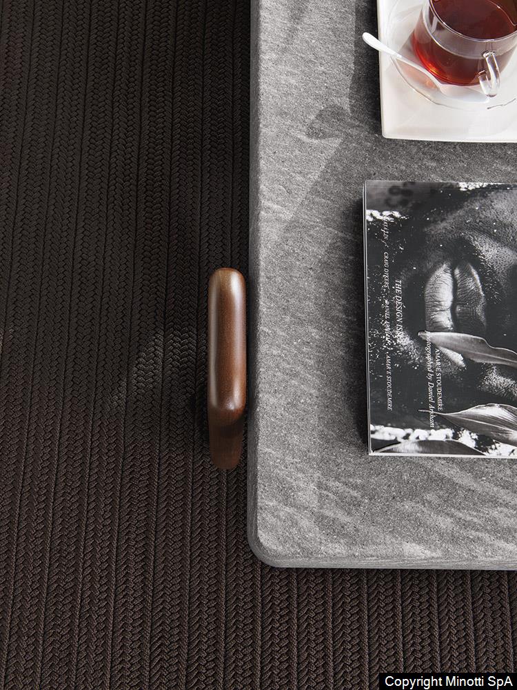 The Florida coffee table features feet in solid natural teak wood and a top with shaped edge in Pietra del Cardoso, in a brushed finish. Due to its mineral composition, Pietra del Cardoso is exceptionally compact and extremely weatherproof.