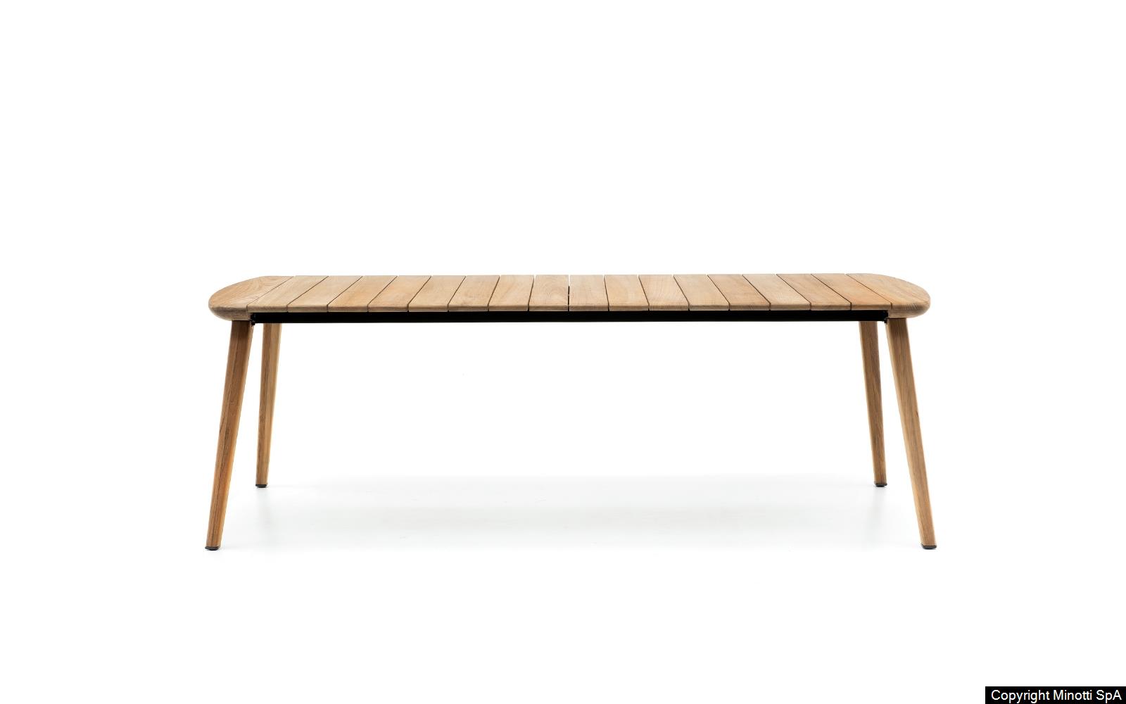The design of the Fynn Outdoor dining table spontaneously originates from the design of the chairs and armchairs, for an outdoor space in harmony with the seats. Smooth, soft to the touch, with no rough edges, the structural and lateral parts of the table reiterate the elongated and slightly curved design of the wooden armrest, which characterizes the family of seats.