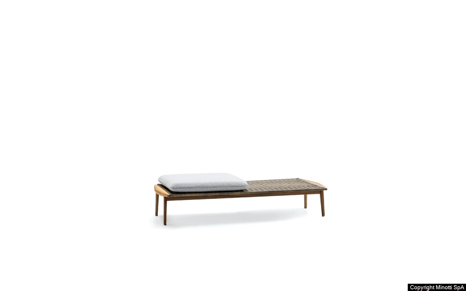 The bench completes the family. Its cushions sit on a frame interwoven with wicker-effect cords in Mud colour.