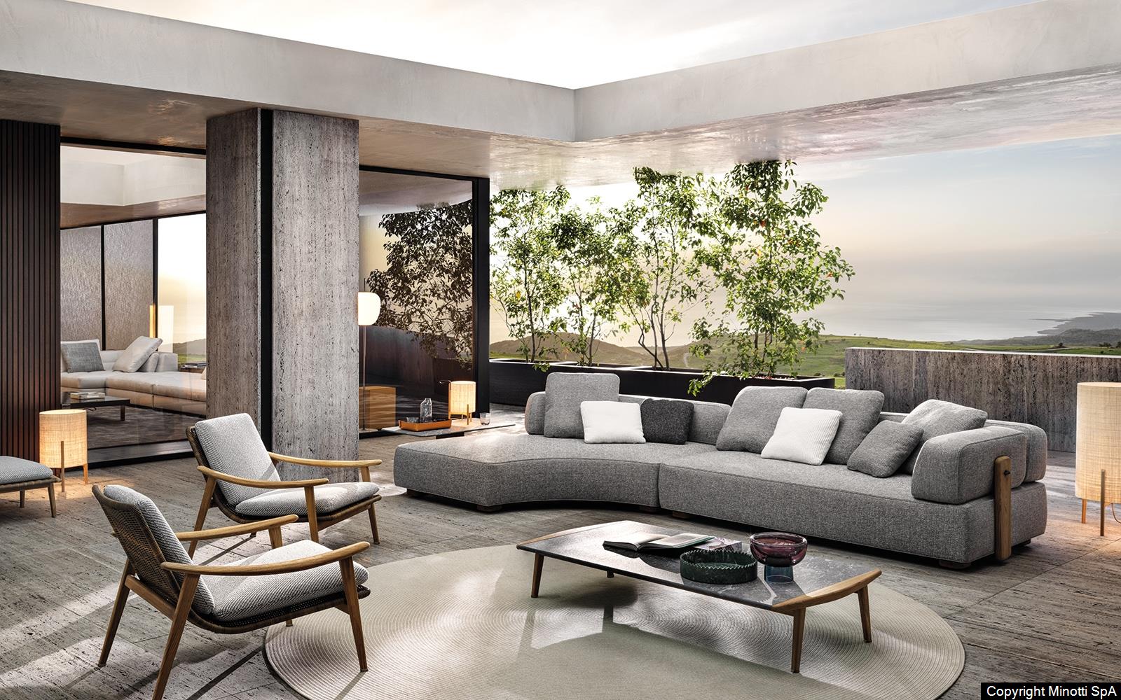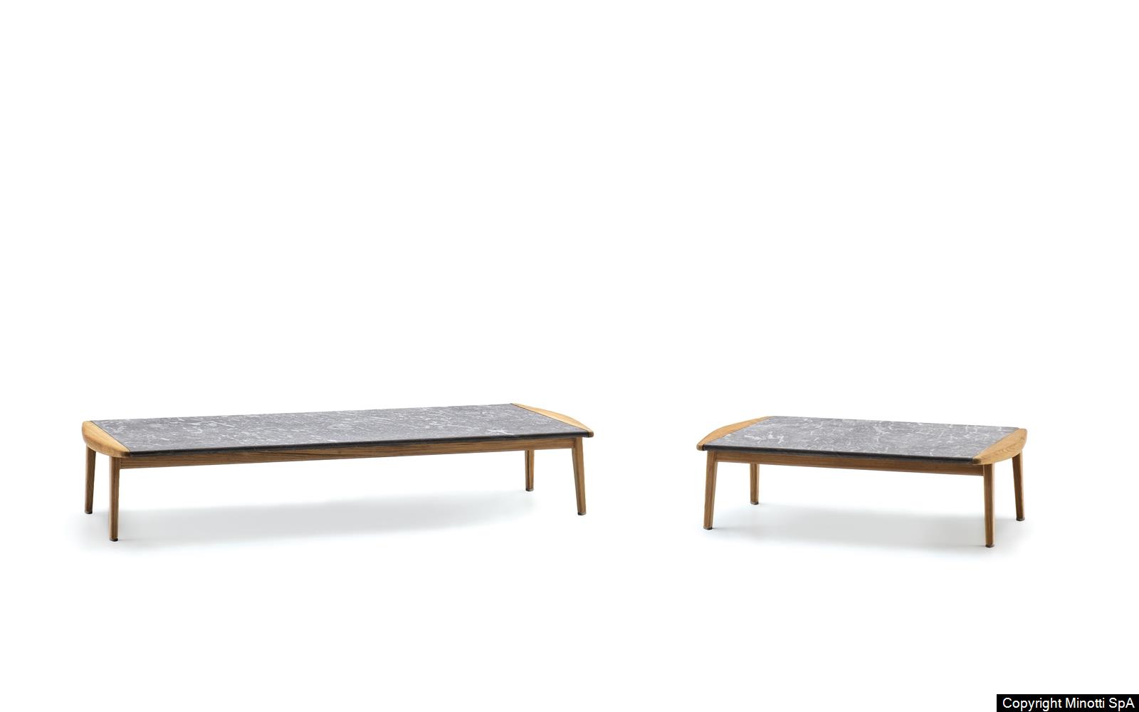 The coffee tables also share the same line as the wooden armrest, which designs a slight curve also found in the rounded sides of the top. The central part of the coffee table is enhanced by the presence of the top in Pietra del Cardoso, creating a sophisticated combination of materials.
