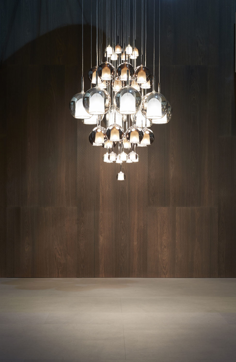 Glo is an icon of our collection, a glass sphere enhancing the glare of light, in a game of reflections back and forth between the lamp and the space or among the very lamps.