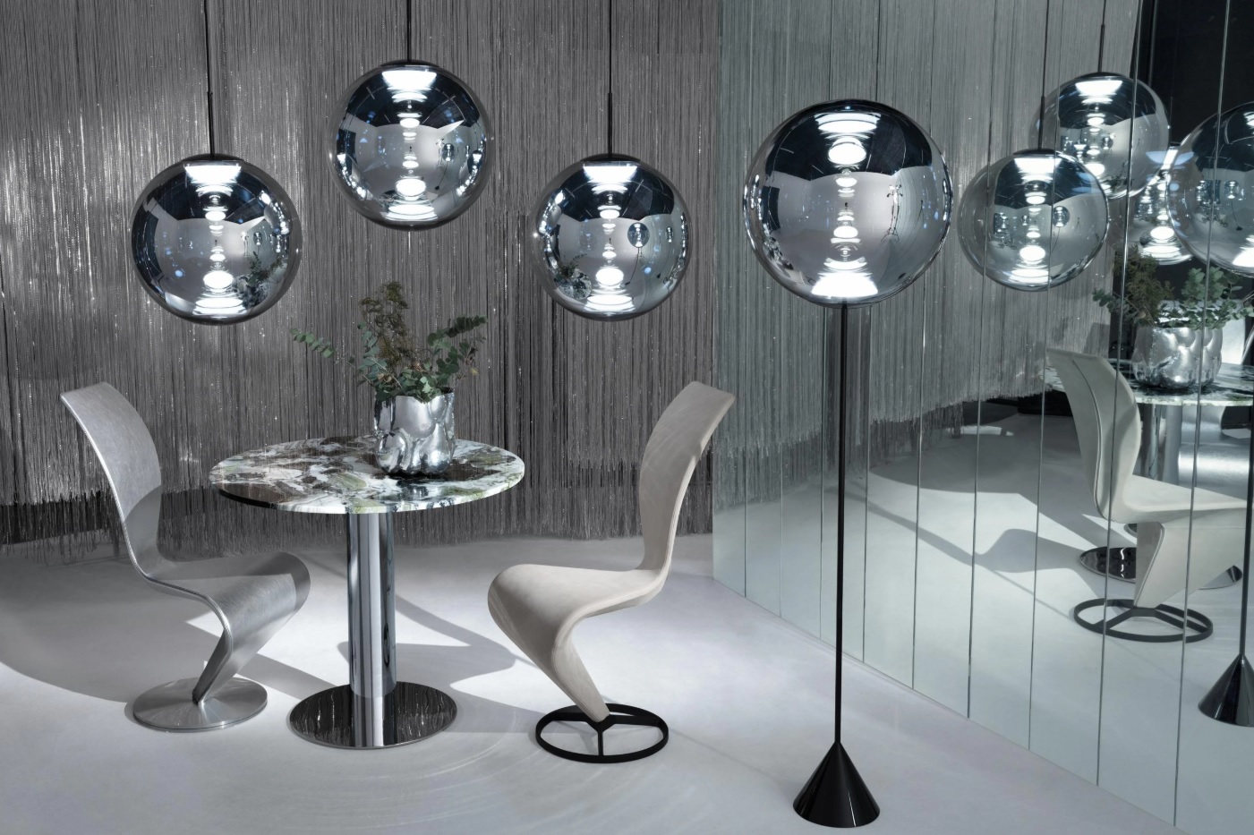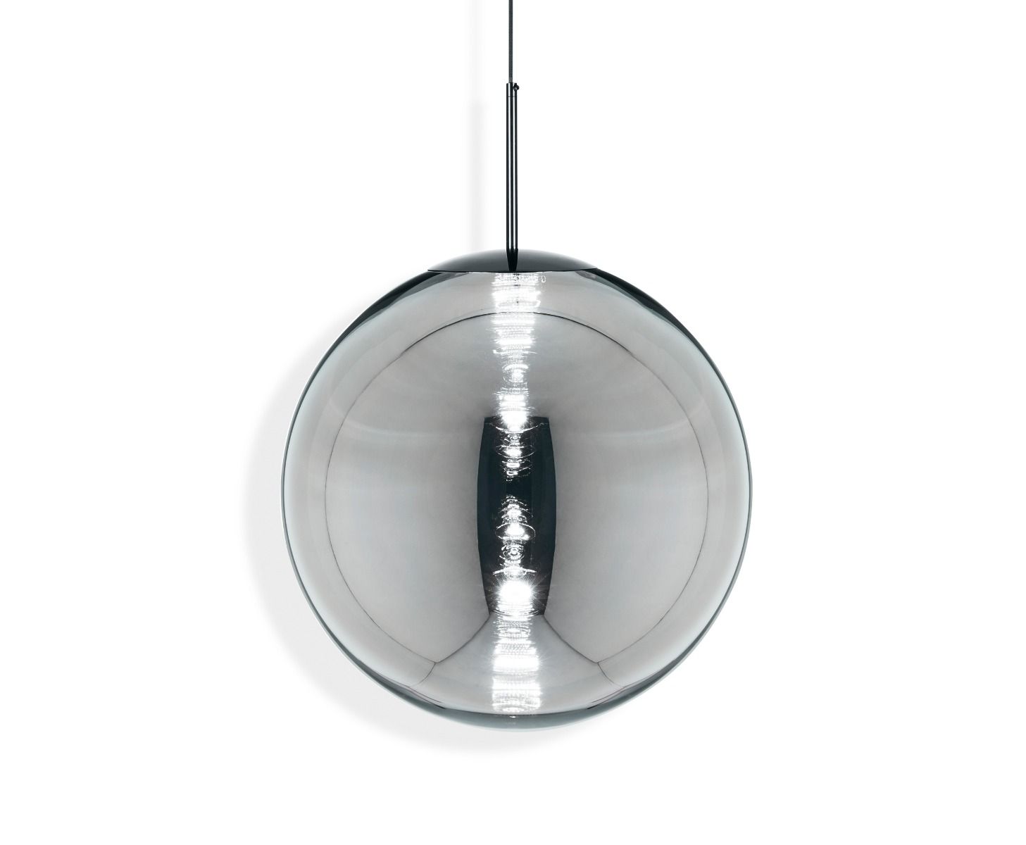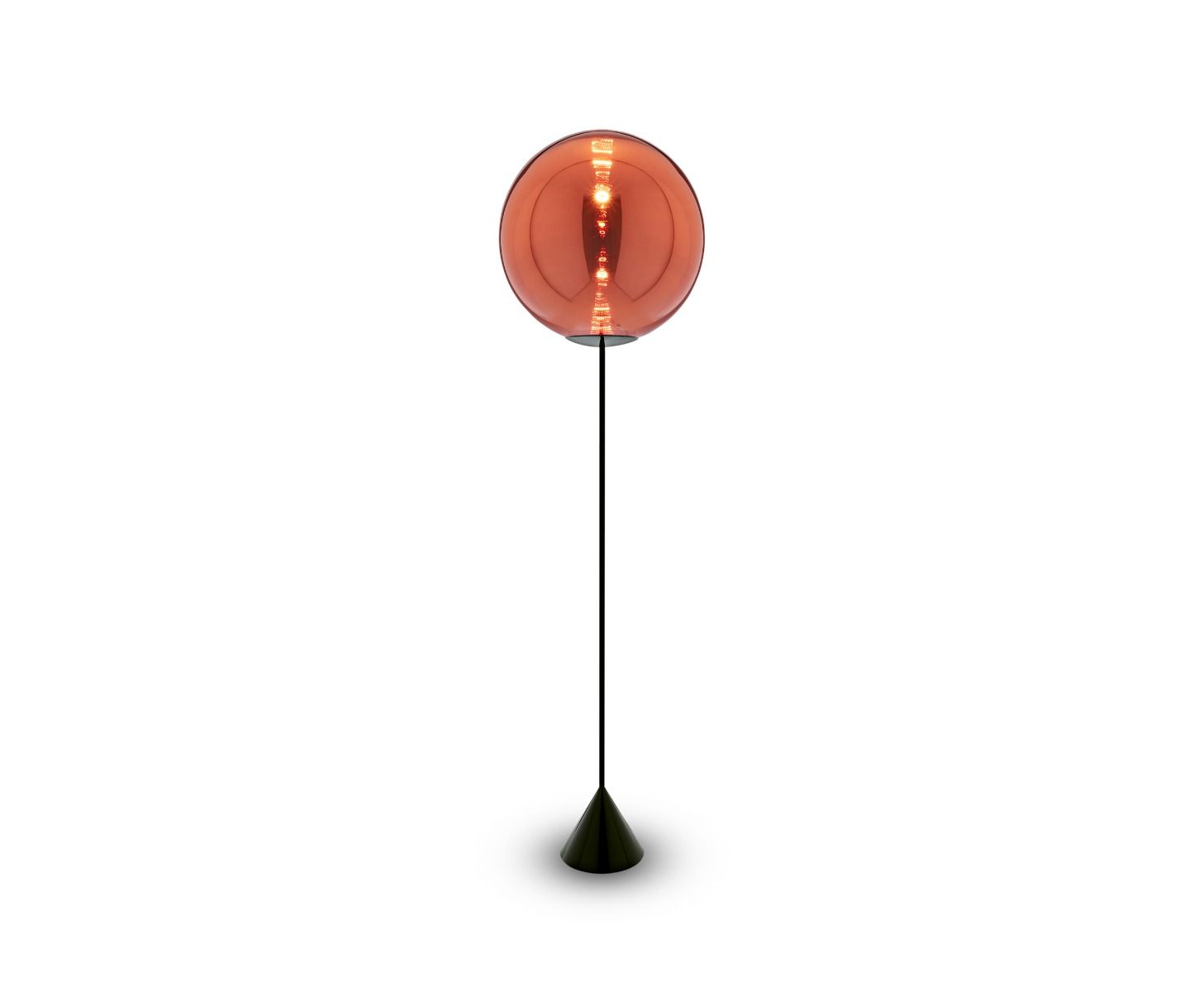 A spherical orb, highly mirrored and perfectly reflective during the day, when switched on reveals a multiplicity of internal reflections from the integral LED. Reminiscent of ancient witch balls, hollowed spheres of coloured glass which were used to ward off evil spirits, Globe is available in copper and chrome finishes in pendant form, as well as two floor lights.