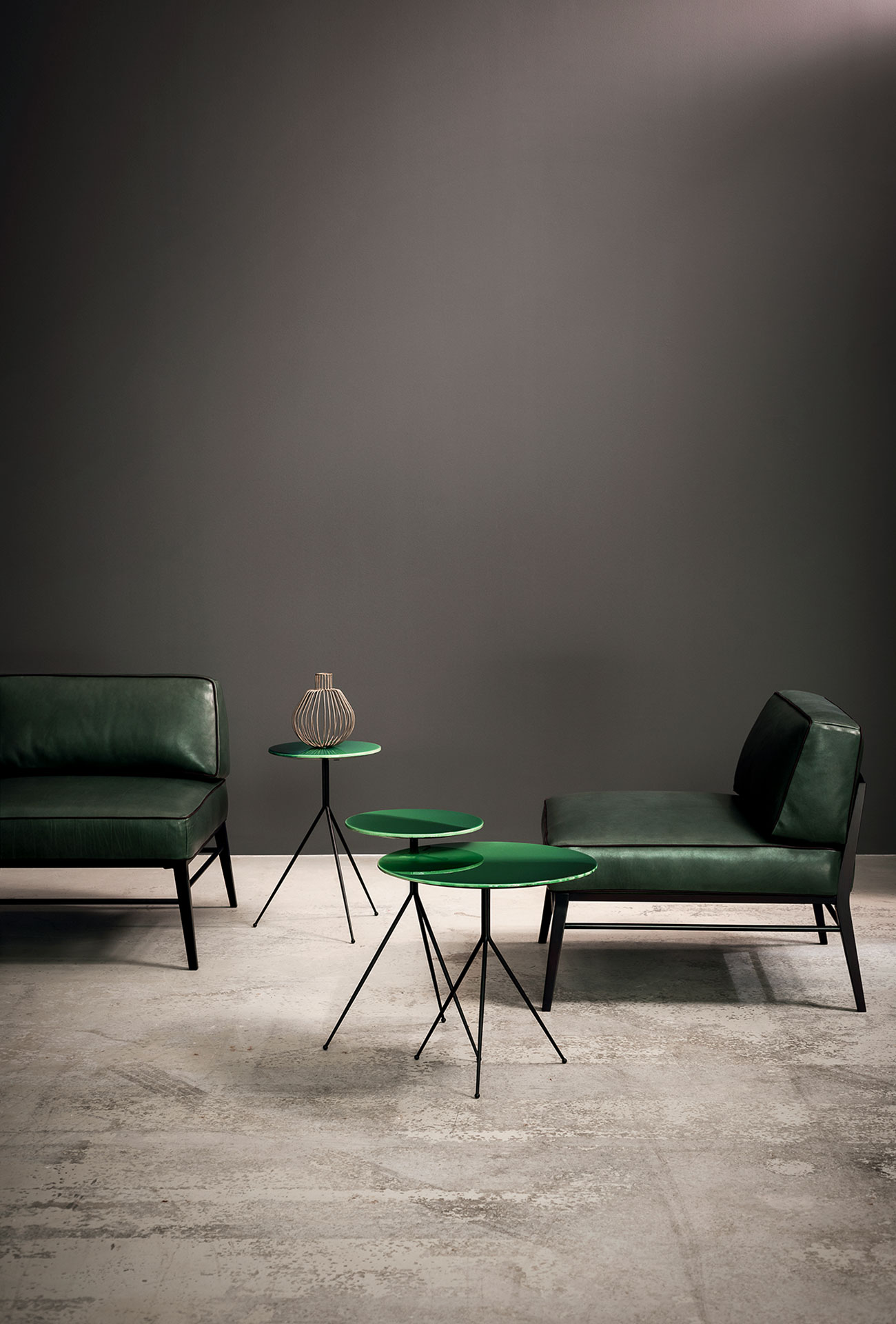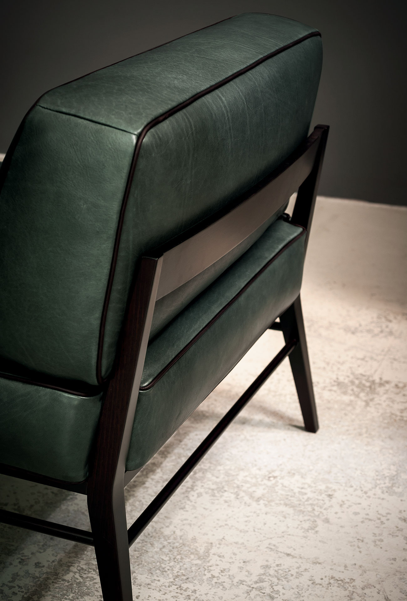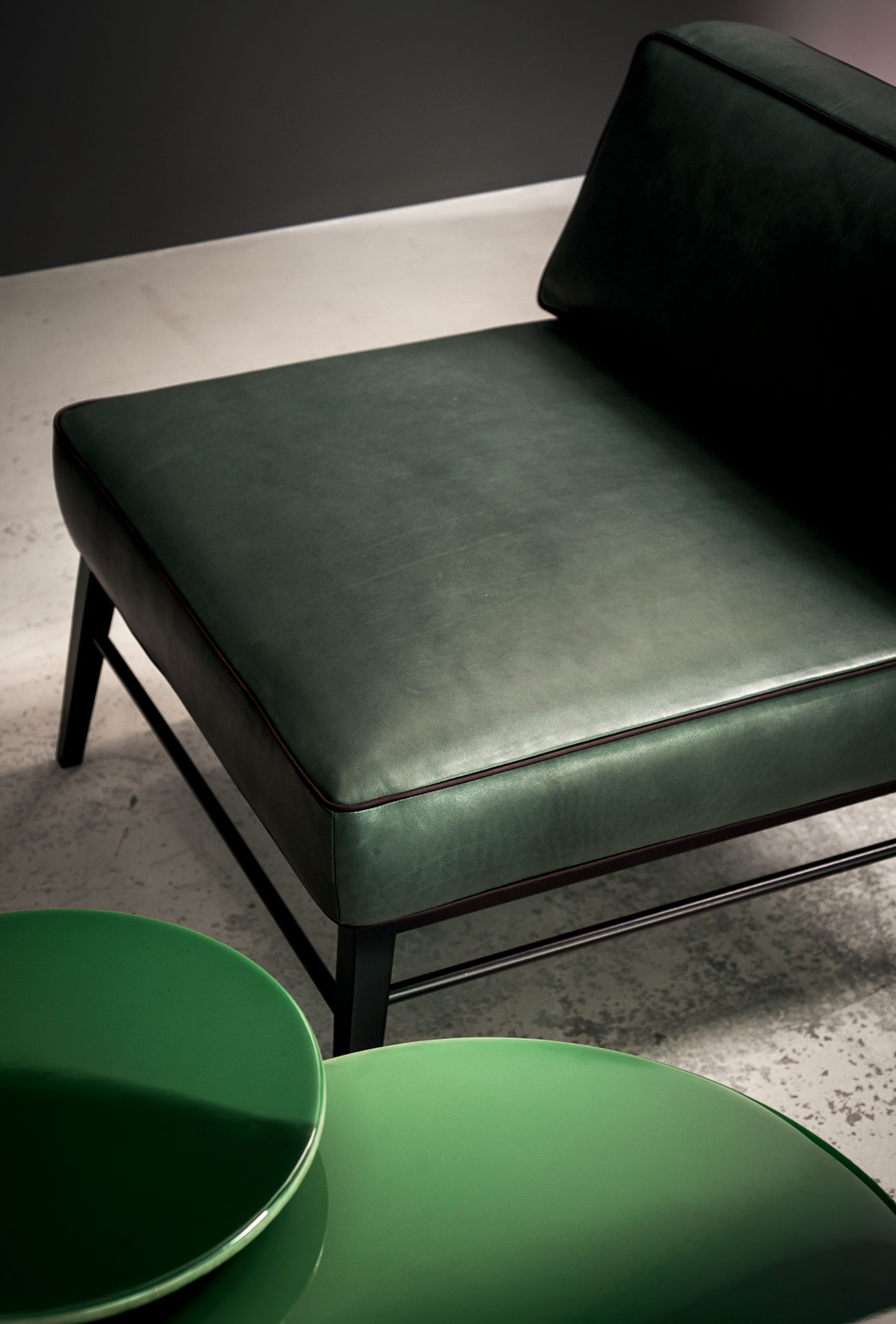 Frame in dark walnut-stained beech or in semi-gloss black lacquered.‎ Cushion with insert in differentiated density polyurethane foam with acrylic fibre covering.‎ Springing with woven elastic straps of covered rubber.‎ Decorative piping in the same shade of leather; upon request, it is possible for the decorative profile to be in the other shades of leathers shown in the catalogue.‎