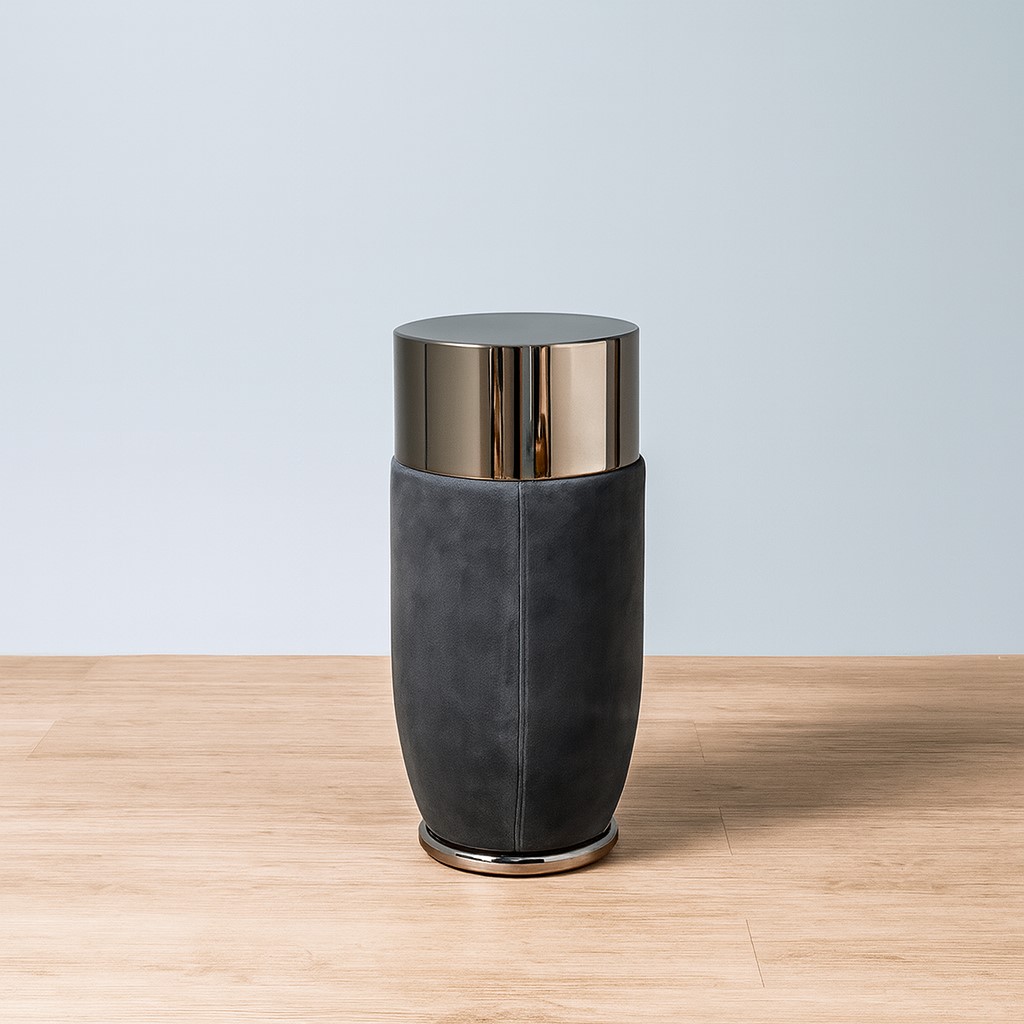 Small bar table with an extractable ice bucket in stainless steel for bottles and glasses. Base, top, and column with shaped metal tray in the finishes: Black Rose gold, bright shaded brown, bright light gold, matt Champagne gold, bright chrome, bright black chrome, matt satin bronze, bright pink gold, matt pink gold. Fiberglass structure covered in leather or fabric from the catalogue.