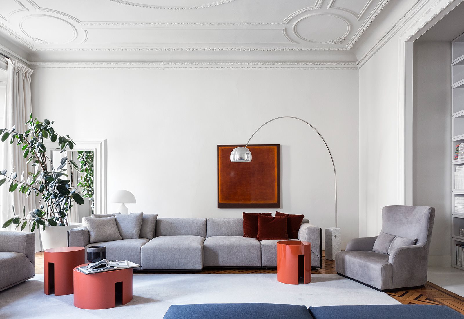 Collection of low tables showing a rigourous shape. The frame is in wood, finishes include glossy or matt lacquer, resin and saddle leather.