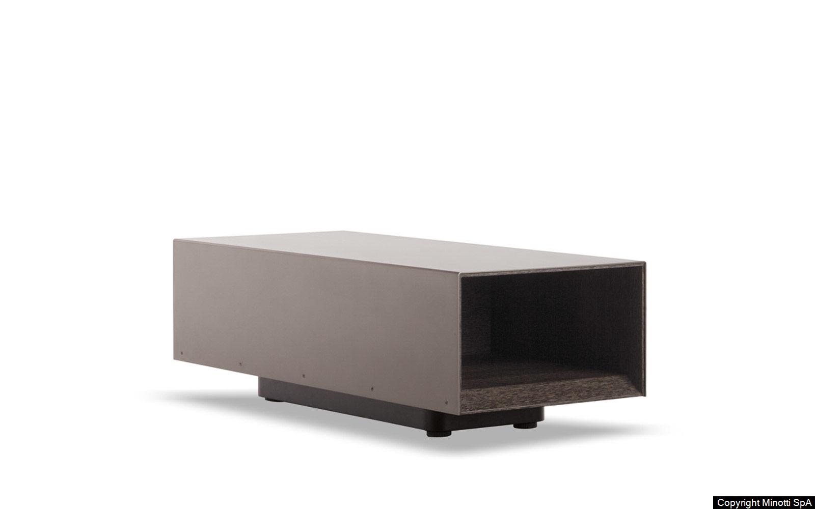 The Gray coffee table was designed specifically to complement the Freeman seating system. Open on two sides, the outer sheet metal structure features a bronze satin finish, while its interior is clad entirely in exotic Sucupira veneer, stained Mink color, for a stunningly elegant effect. The open compartments can be equipped with the optional Gray Trays, that are lined in Sucupira veneer with stained Mink finish. Thanks to its size, the Gray coffee table fits neatly between two seating elements or alongside the sofa.