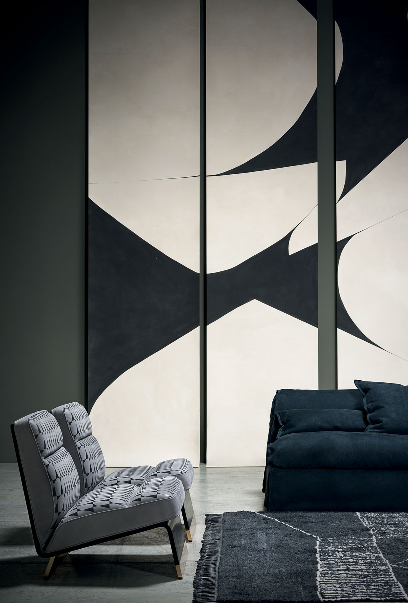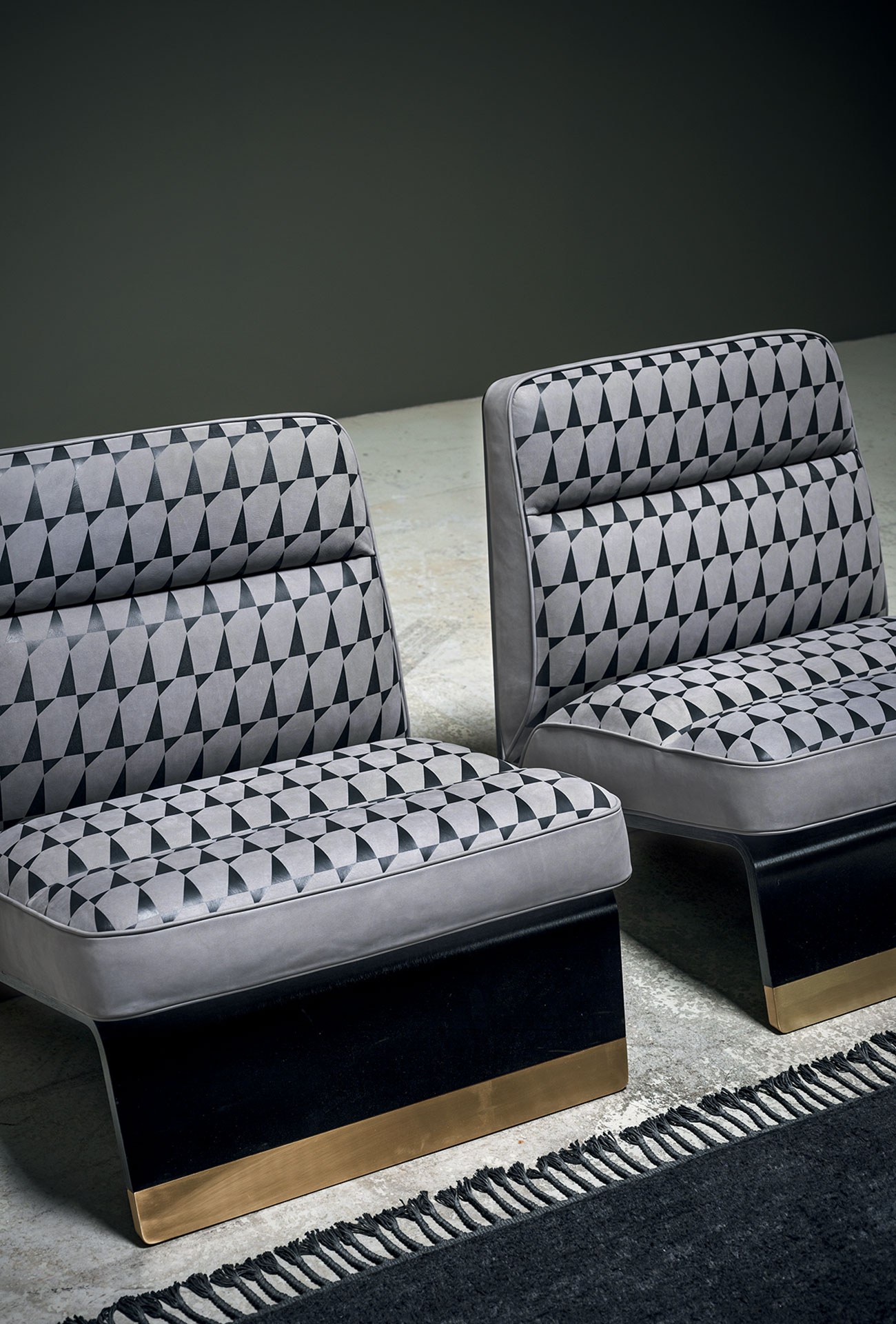 Frame in ash veneered beech plywood with borders in satin-finished brass, in hand-finished burnished metal or in satin nickeled metal, with matte paint. Differentiated density polyurethane foam filling with acrylic fibre covers. Available in 4 versions. Colours and Texture combinations not changeable.