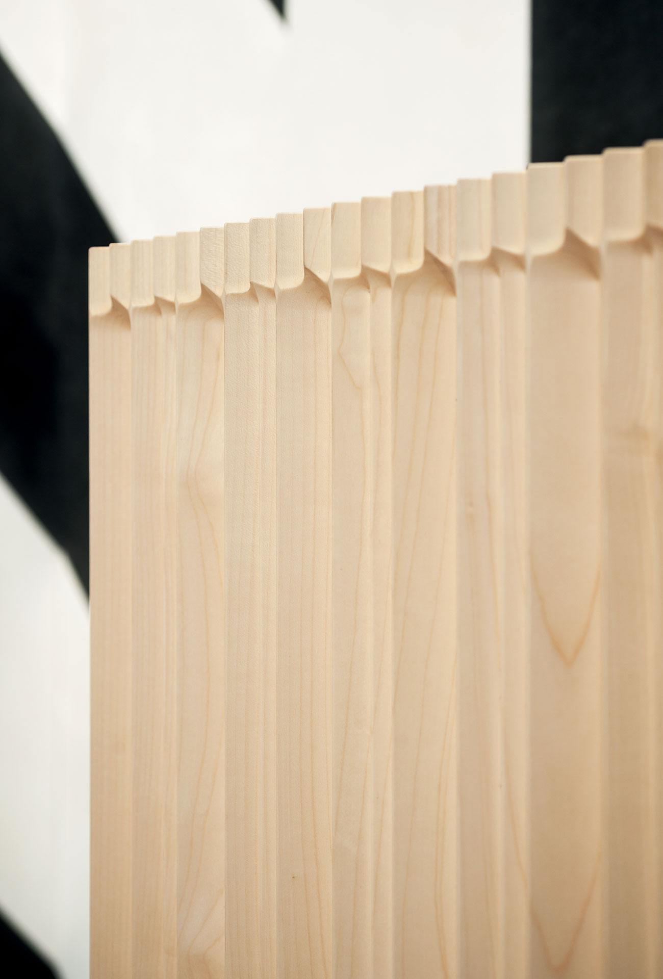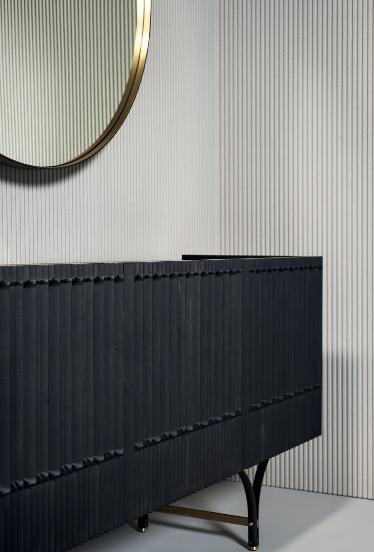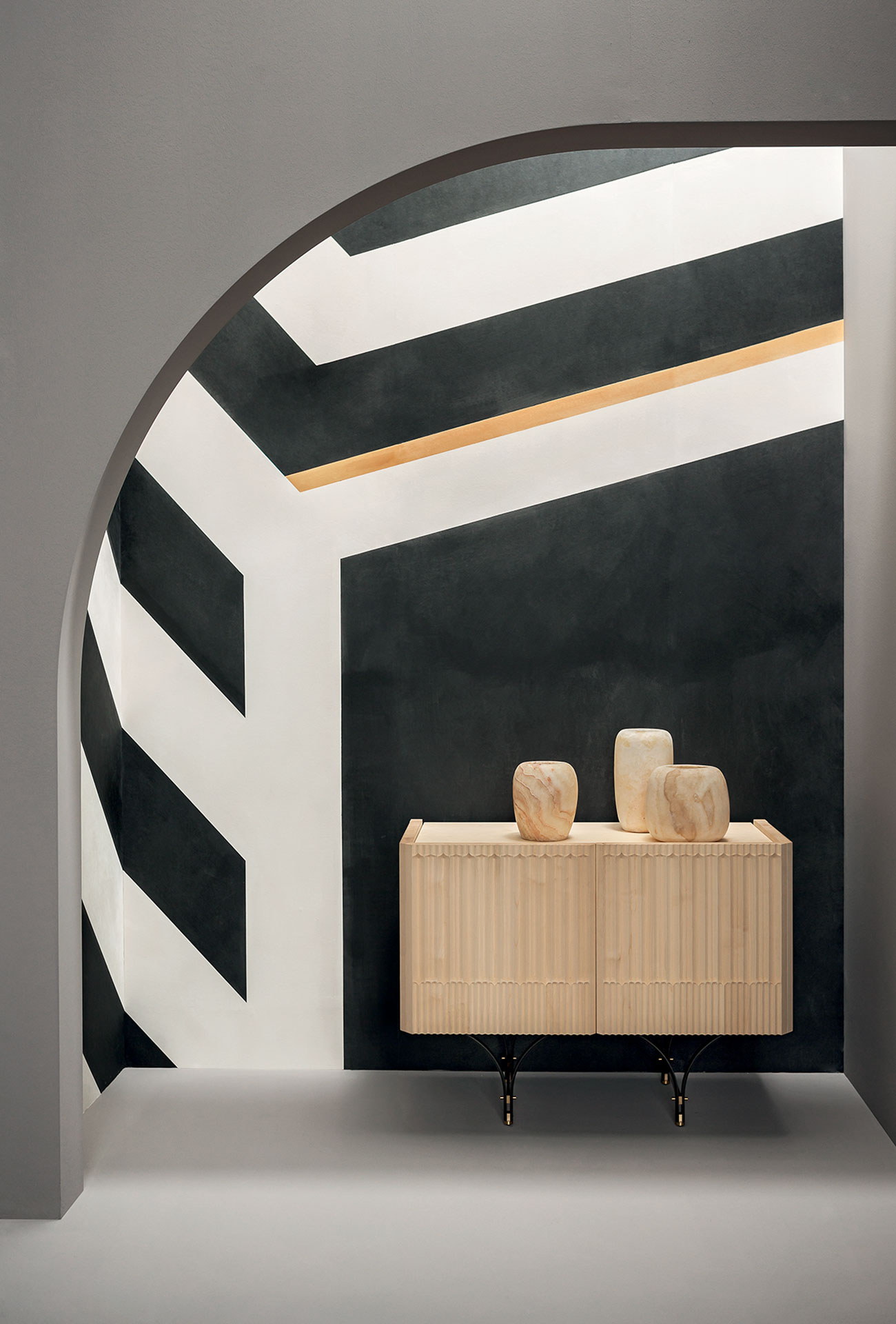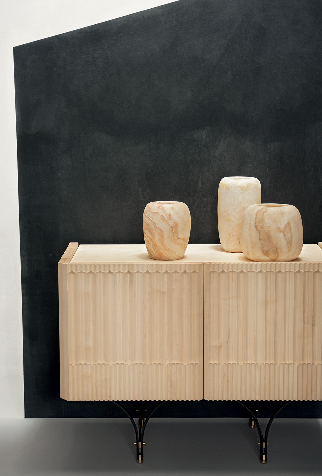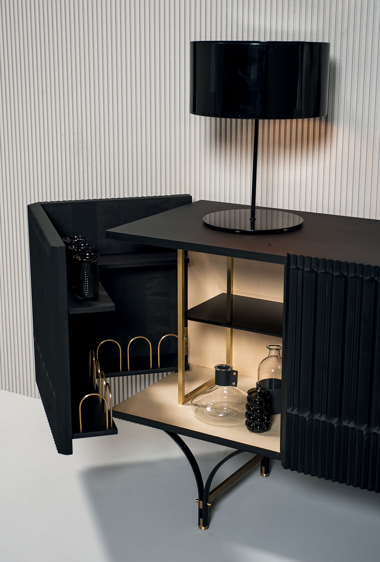 Bar cabinet. Structure in birch plywood. Veneering in natural maple or maple dyed with black aniline. Inner part in contrast to the outer part, dyed with black aniline or in natural maple. Doors in modelled solid maple wood, with small decorative arches in brass. Inner shelf in black, paste-dyed glass. Base in black-stained metal with feet and bars in satin brass.