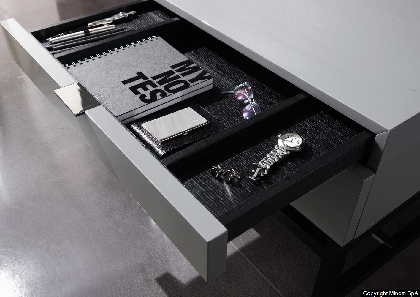 Aesthetically speaking, Harvey’s charm arises from an original combination of three materials: glossy lacquer, stained ash in Moka and Black-Nickel metal accents, the cleverly-sized pieces and the balance of proportions.