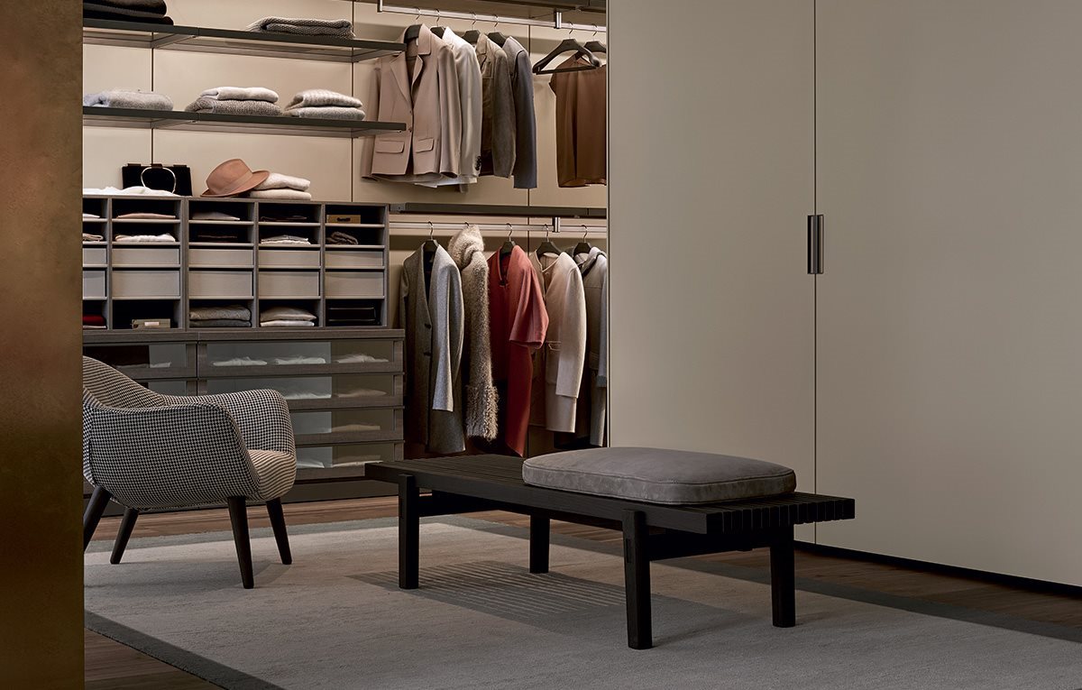 A system based on the free modular nature of all its many elements. Benches, chests of drawers, consoles, storage units with a wide range of functions which, taken individually, perfectly adapt to residential projects and, as a system, they are ideal for hospitality projects. The benches stand out for the slimline distinguishing elements of the top, covered in fabric, leather or stringed leather.