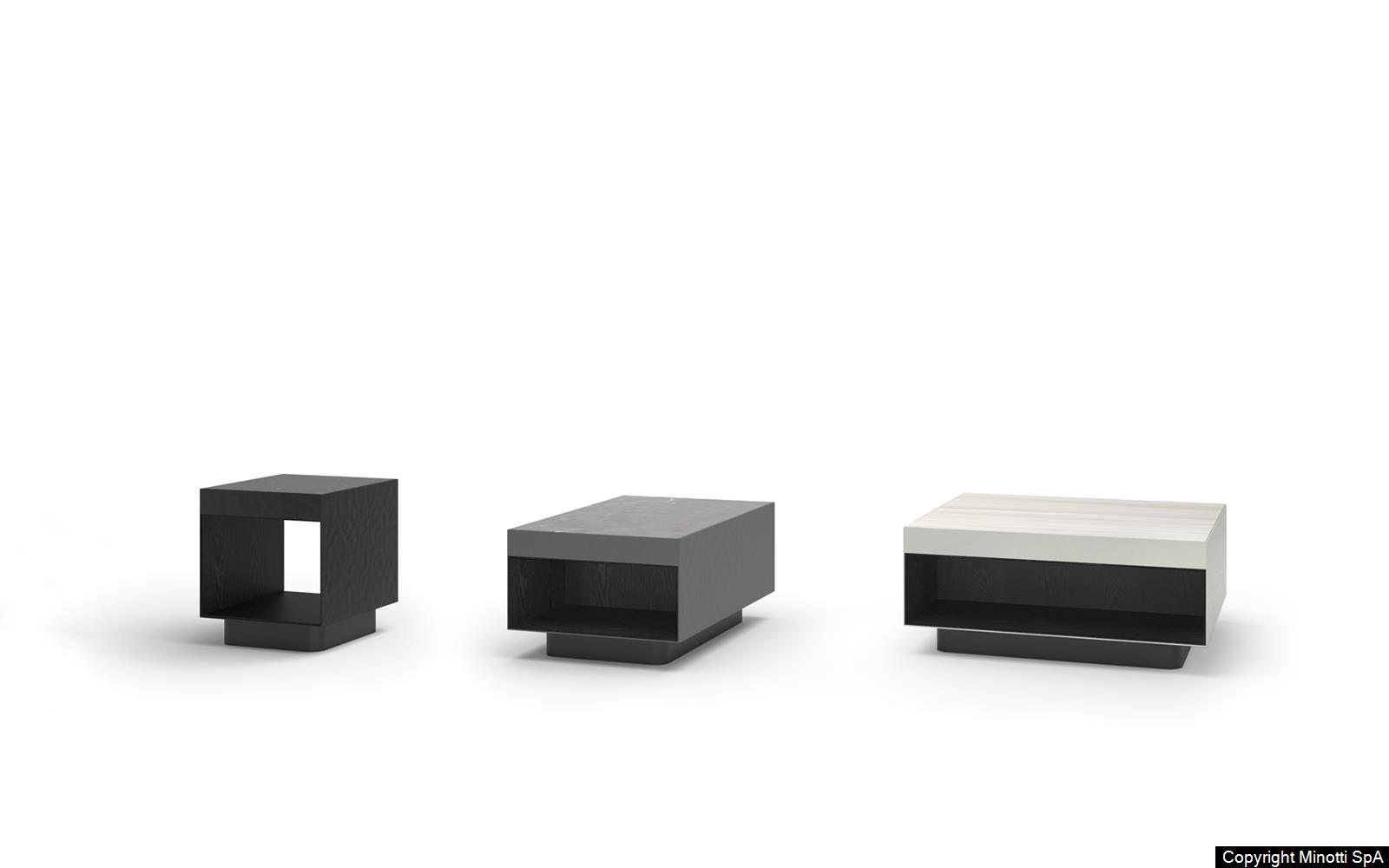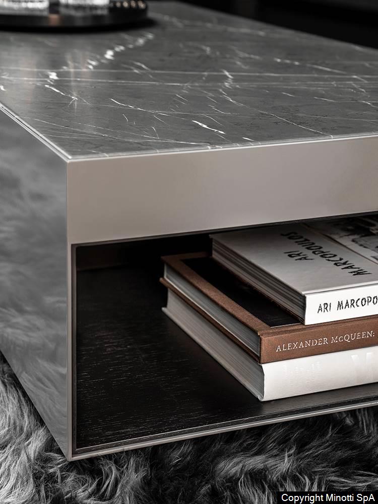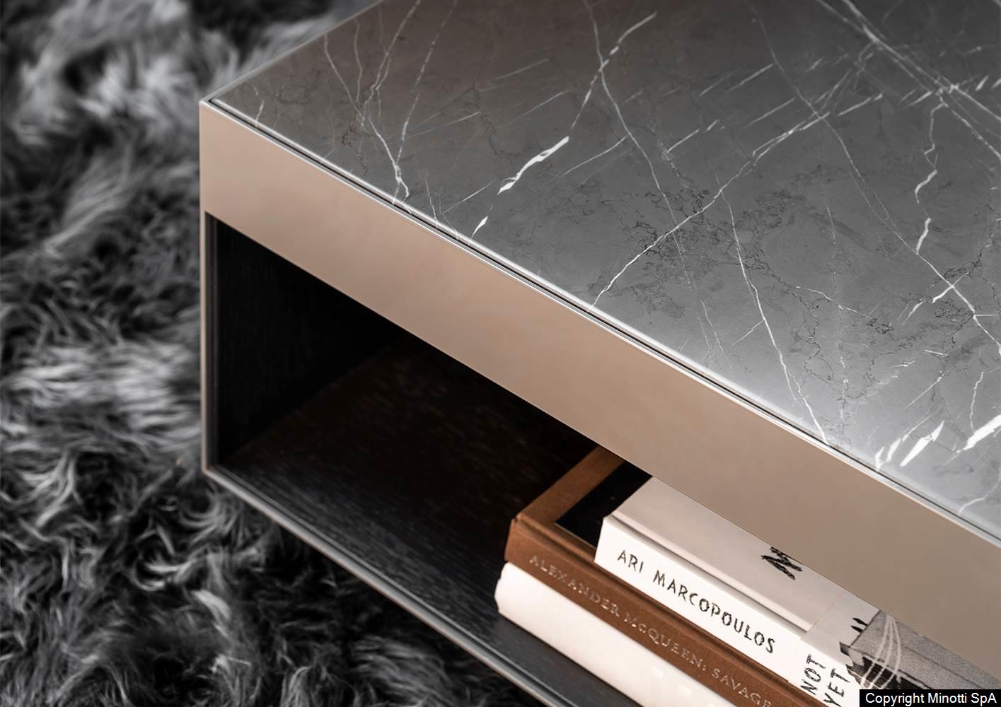Hope occasional tables include solutions with a section open on both sides or with one or more open compartments ideal for magazines or other items. The complex process used to couple the metal outer frame with the wood-covered inner structure adds a note of warmth and underscores the intrinsic prestige of Hope occasional tables.