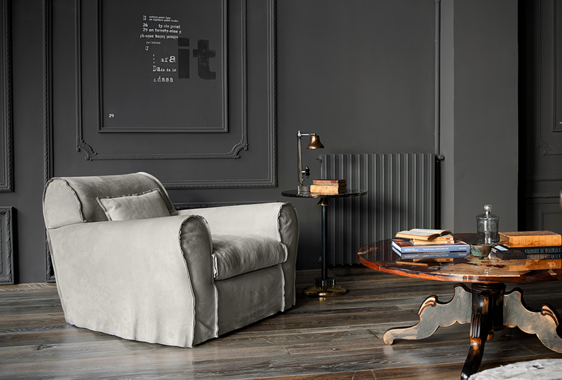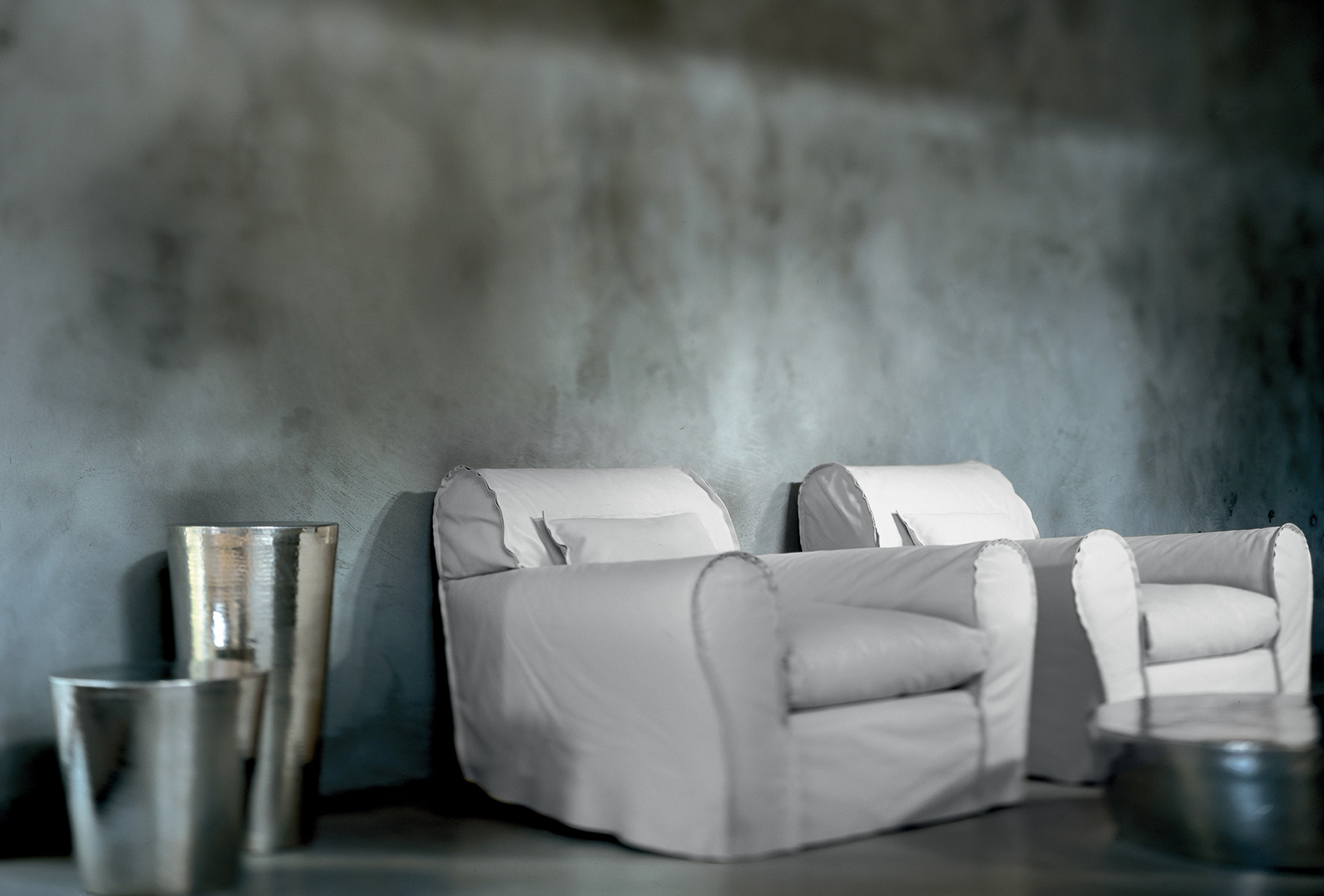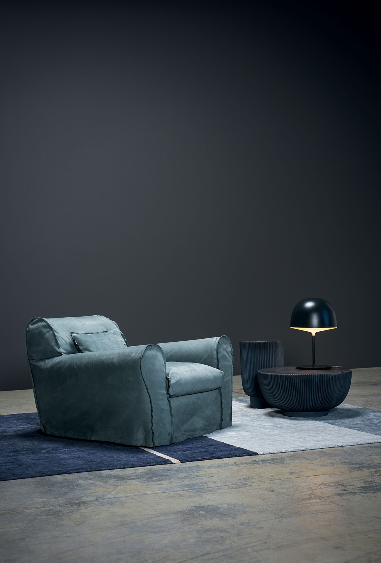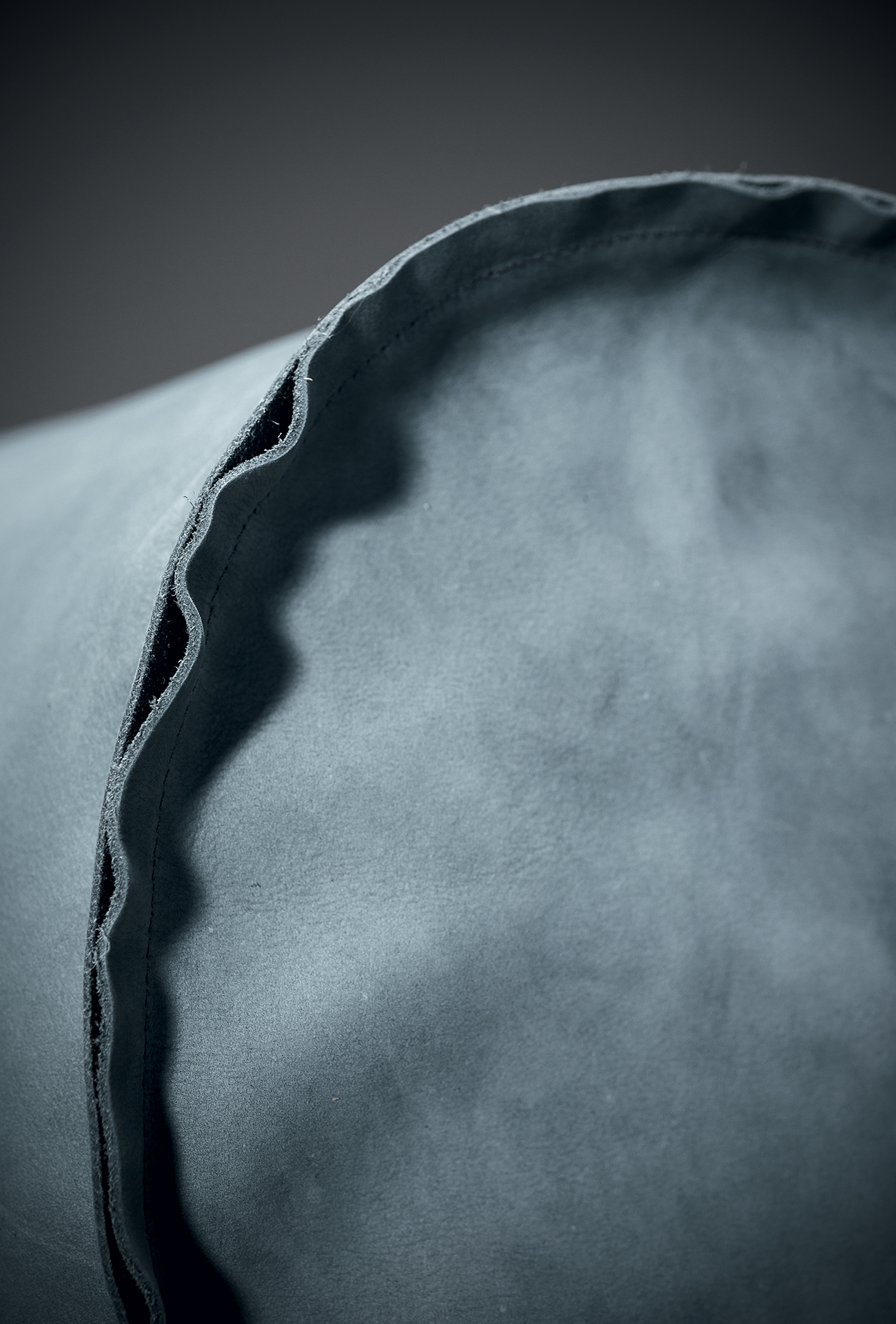 Frame in double-panelled pine and poplar. Base in walnut-stained beech. Padding in differentiated density polyurethane foam and cover made with acrylic fibre. Spring base with cross-woven, coated rubber elastic straps. Seat cushions and lumbar support in memofil with viscoelastic chips. Leather upholstery with sharp edge stitching. Available in all soft leathers.