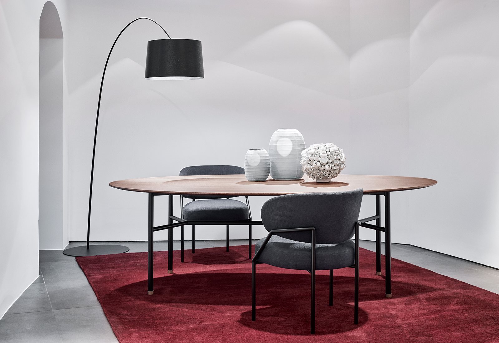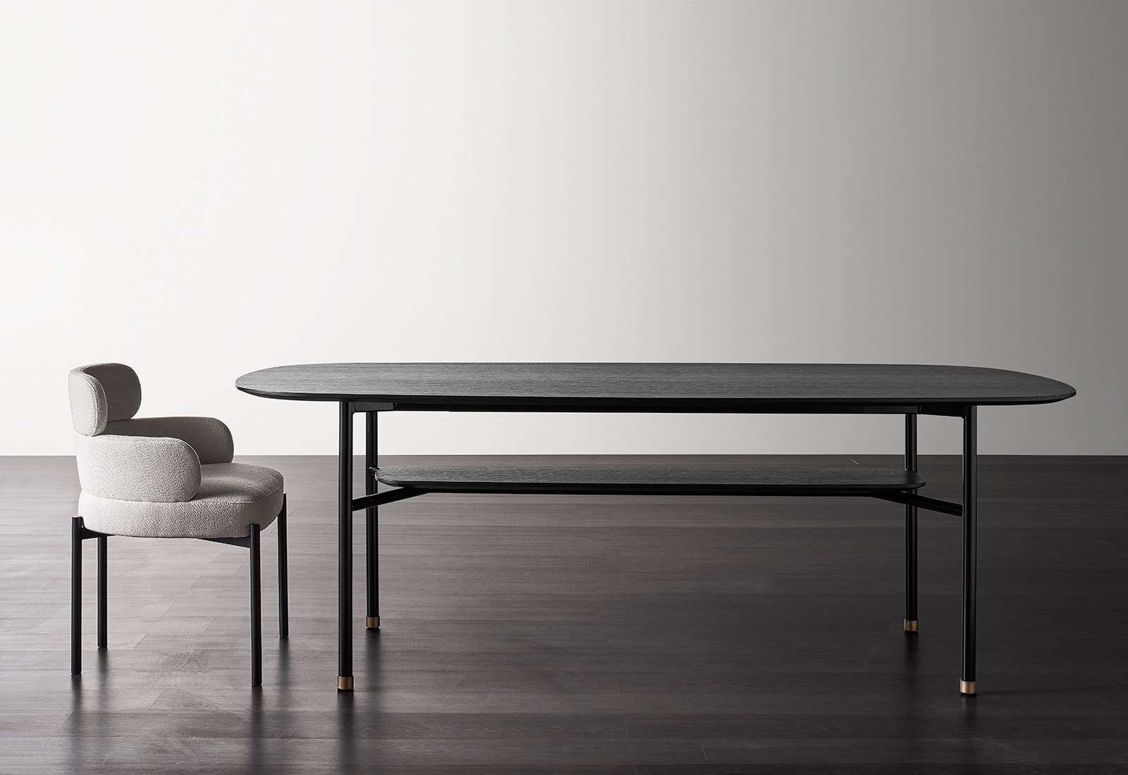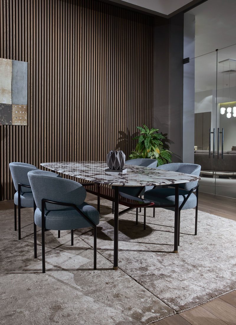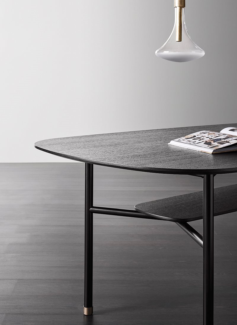 Hubert was born from the desire to create a simple table, defined by a very linear tubular iron frame that supports different types of top, with various shapes and sizes. The tops may be round, oval or rectangular, these last ones slightly rounded as a cuttlefish bone. Hubert offers wide possibilities of composition and, in its graphic cleanliness, offers the gracious possibility of a double top or a small brass tip in the frame.