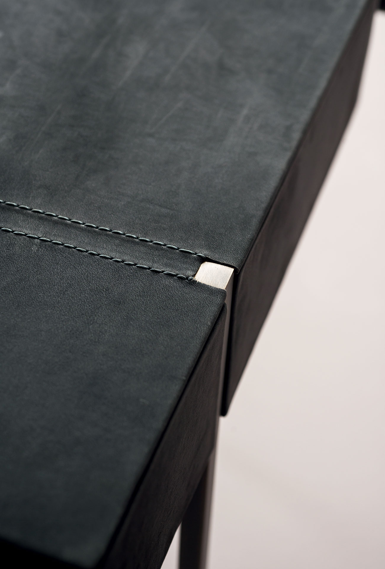 Base in satin brass-coated metal, in hand-finished burnished metal or in satin nickeled metal, with matte varnish. MDF structure, canaletto walnut veneered. External structure in shaped aluminium sheets covered with leather. Drawers in solid canaletto walnut.