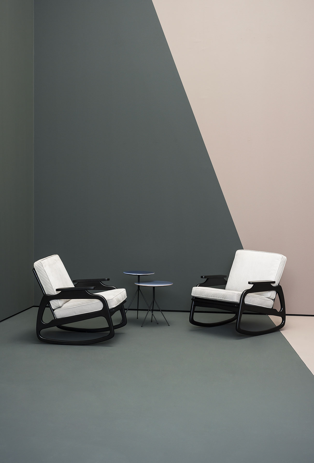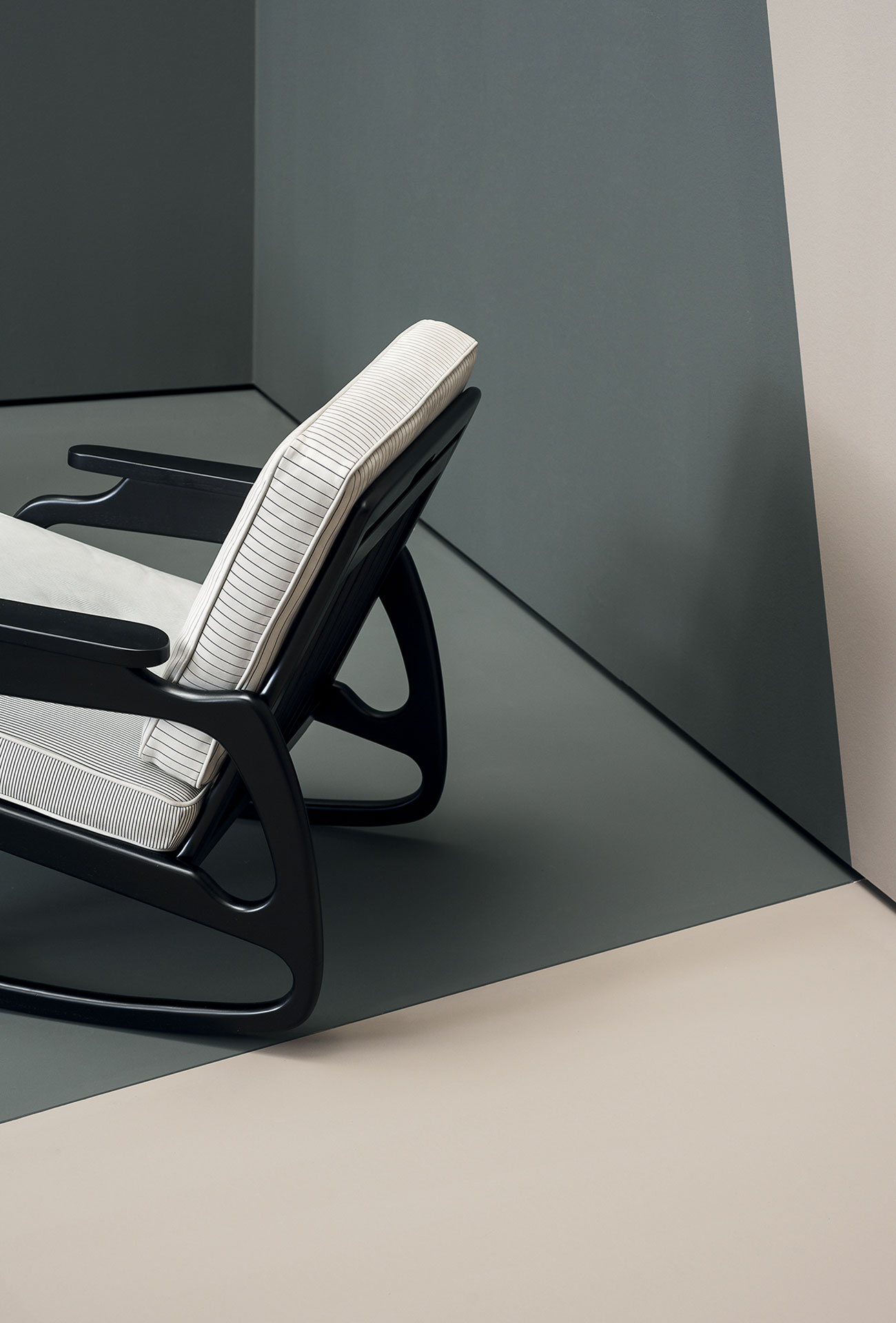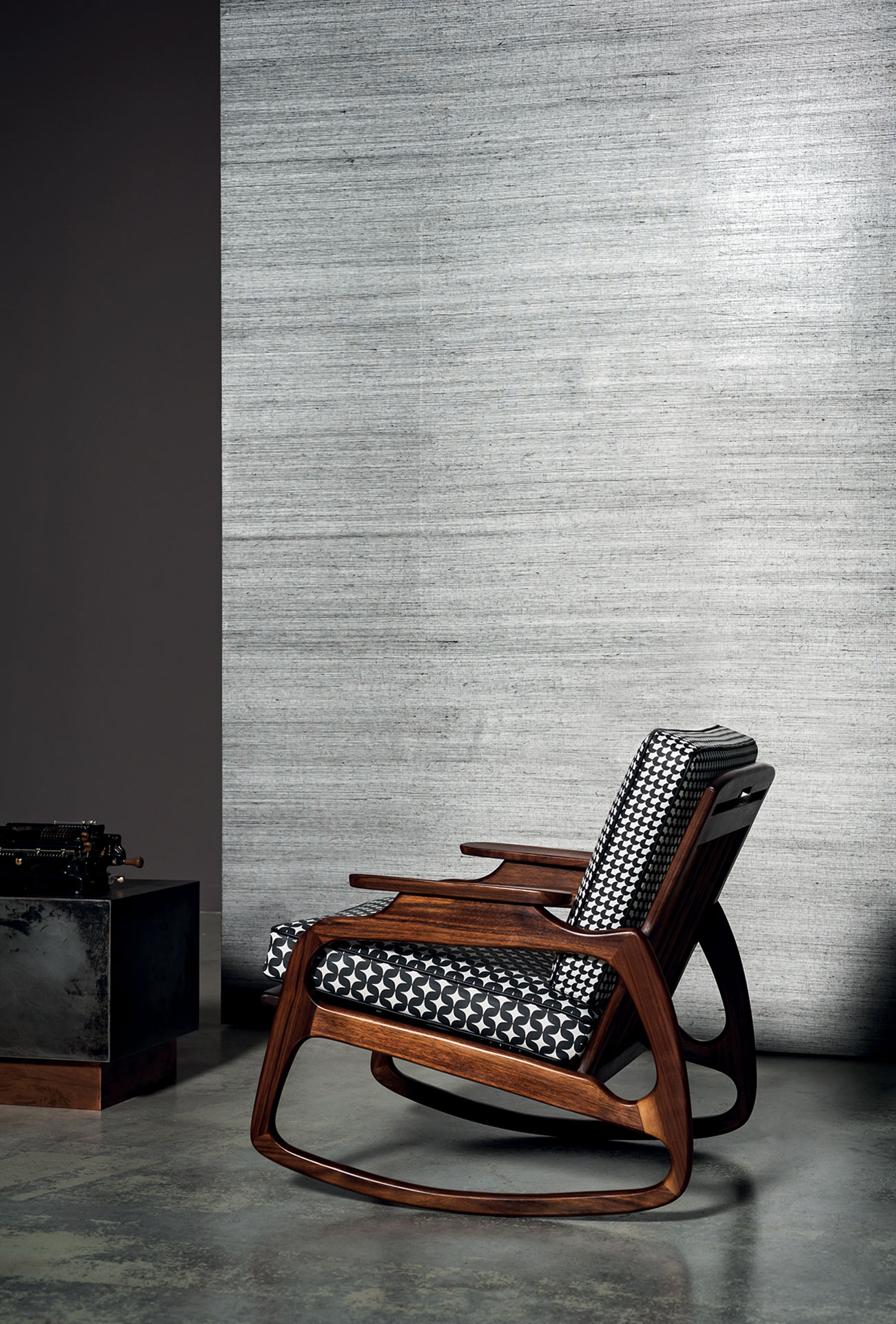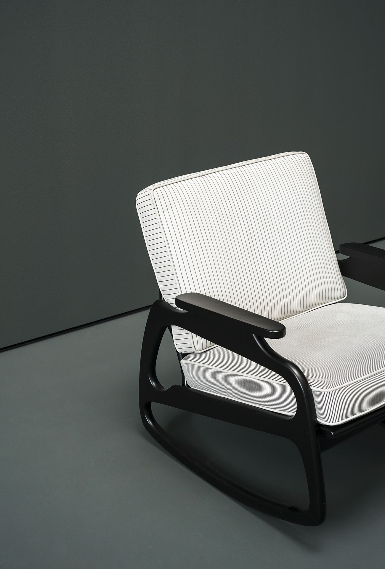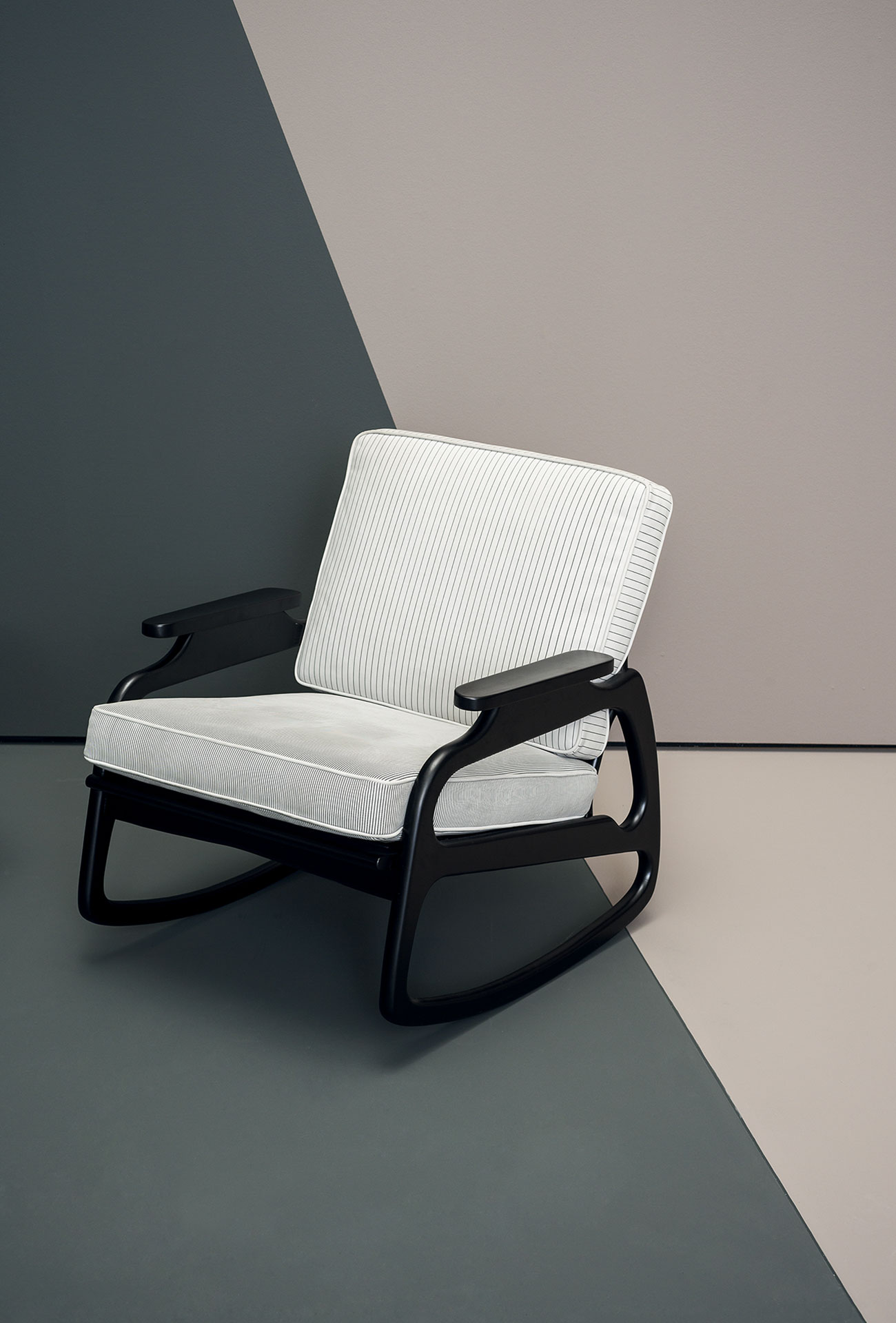 Ingrid is a rocking armchair with leather upholstery. Structure in semi-gloss canaletto walnut. Differentiated density polyurethane foam filling. Springing with woven elastic straps in covered rubber. Decorative piping in the same shade of leather.
