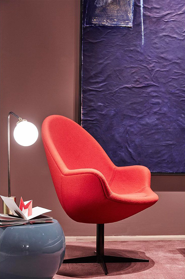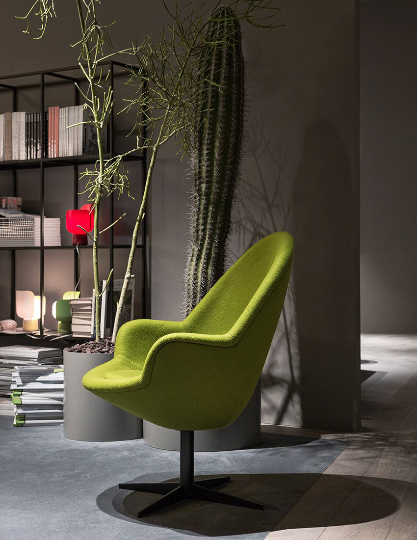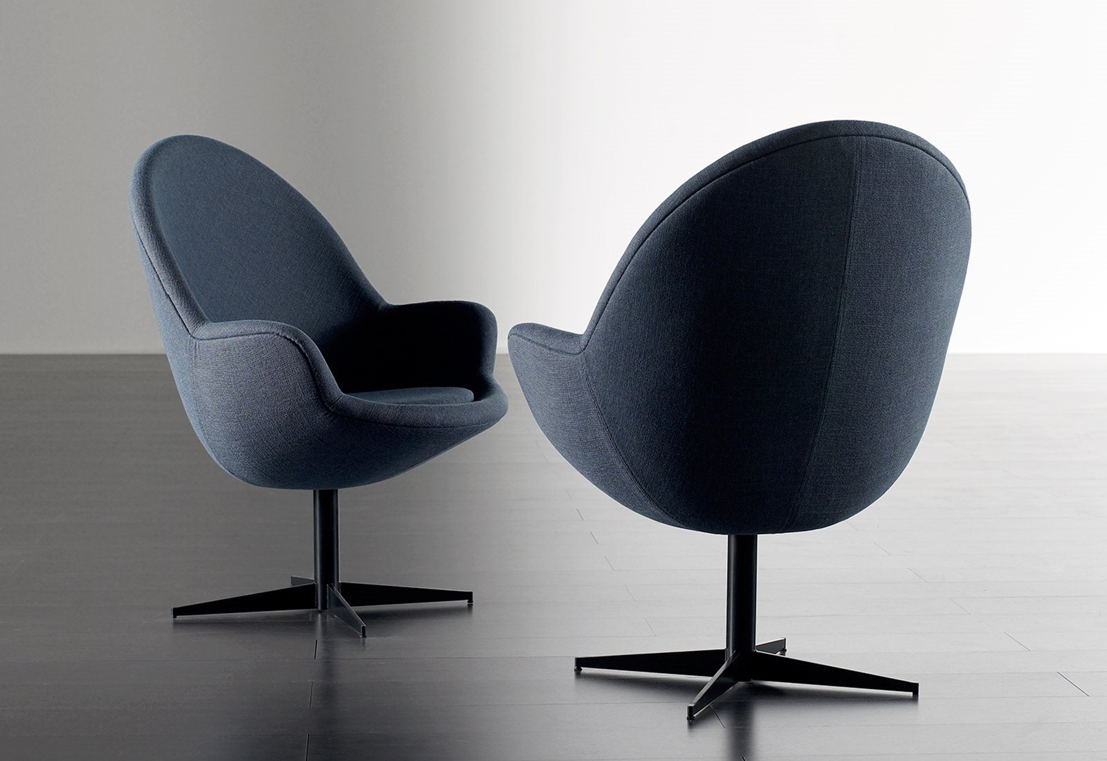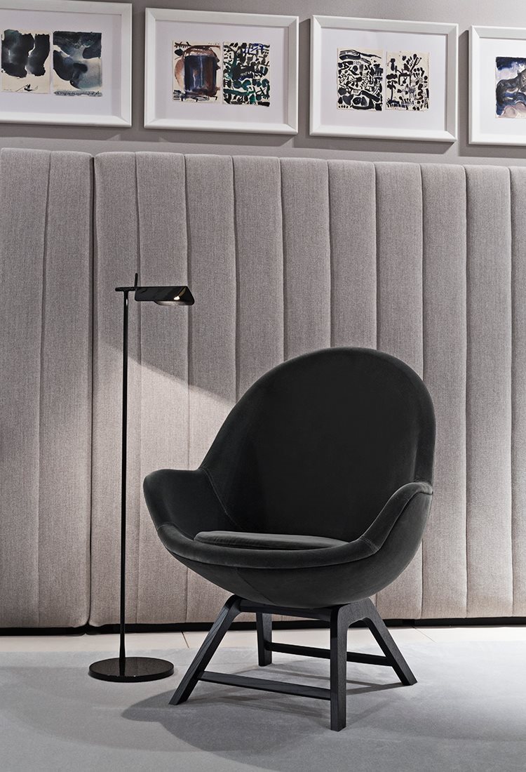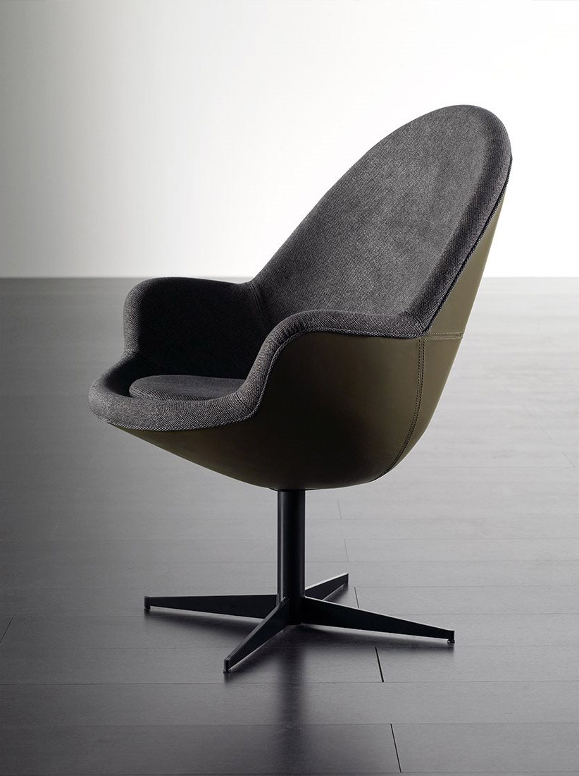 – Padded small armchair with high backrest with fixed cover and swivel metal base black matt varnished.