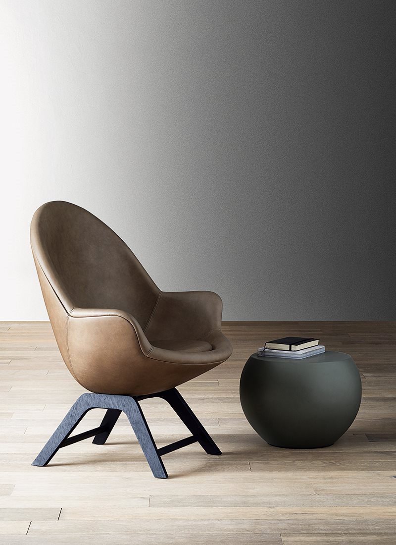– Small armchairs with a high backrest, non-removable cover in fabric or leather and stained oak base.