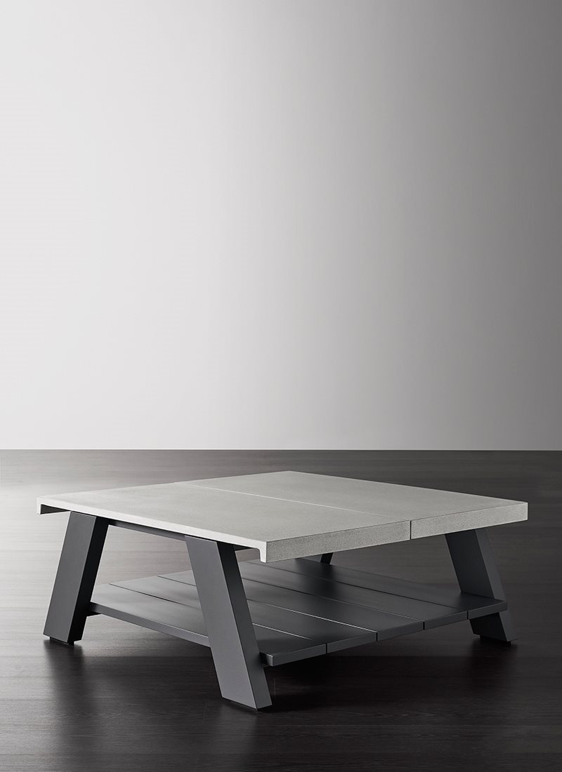 Iroko solid wood, concrete and matt or glossy lacquer come to life with Joi, a collection of rectangular tables and square side tables in different sizes, with visually pure lines. The tops can be matt or glassy lacquered in different colours or in Ductal® concrete, a material of the highest quality and technology made up of very fine natural mineral components and organic fibers, which make it resistant and flexible. Its light gray finish makes Joi perfect for a contemporary and urban stage.