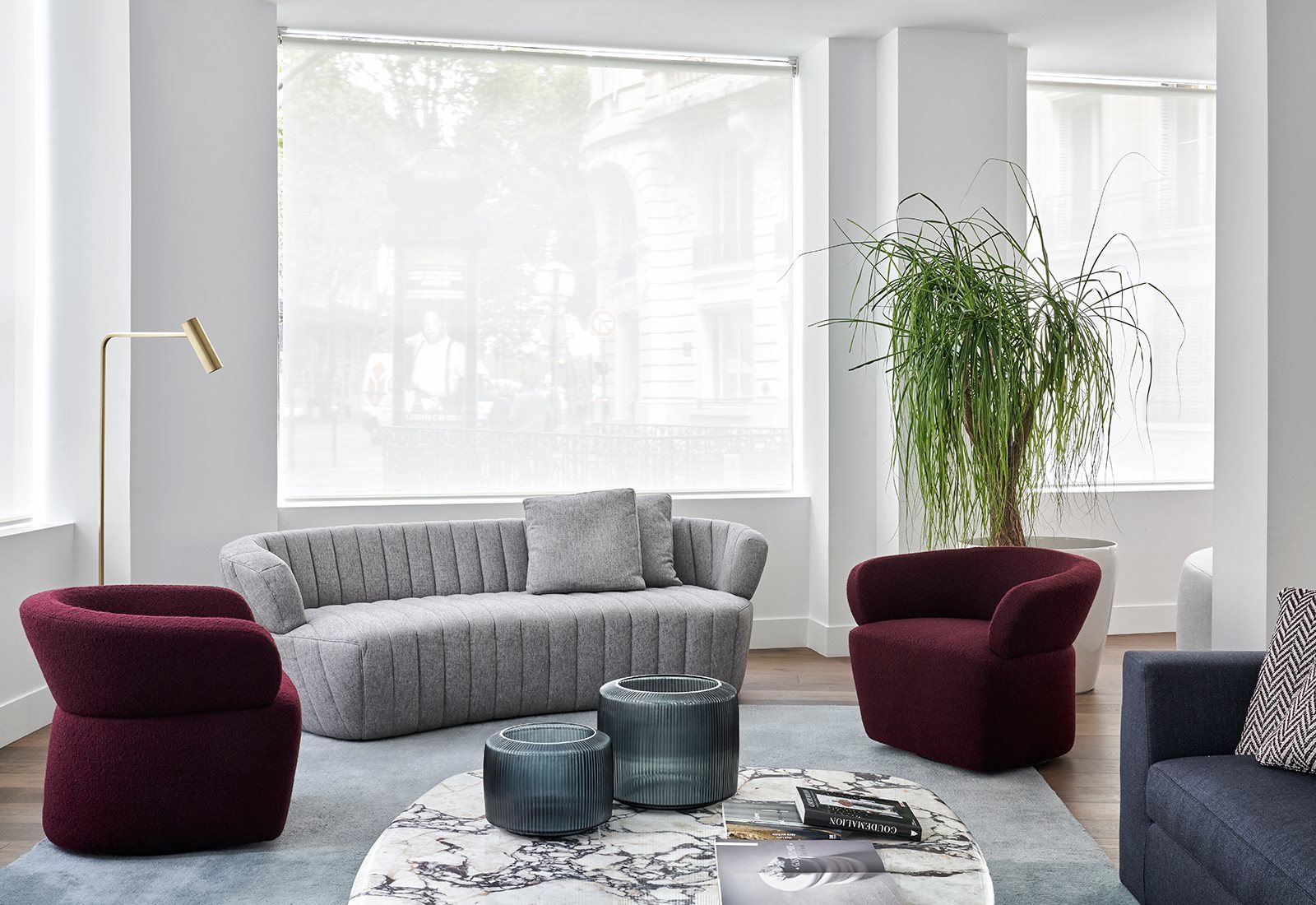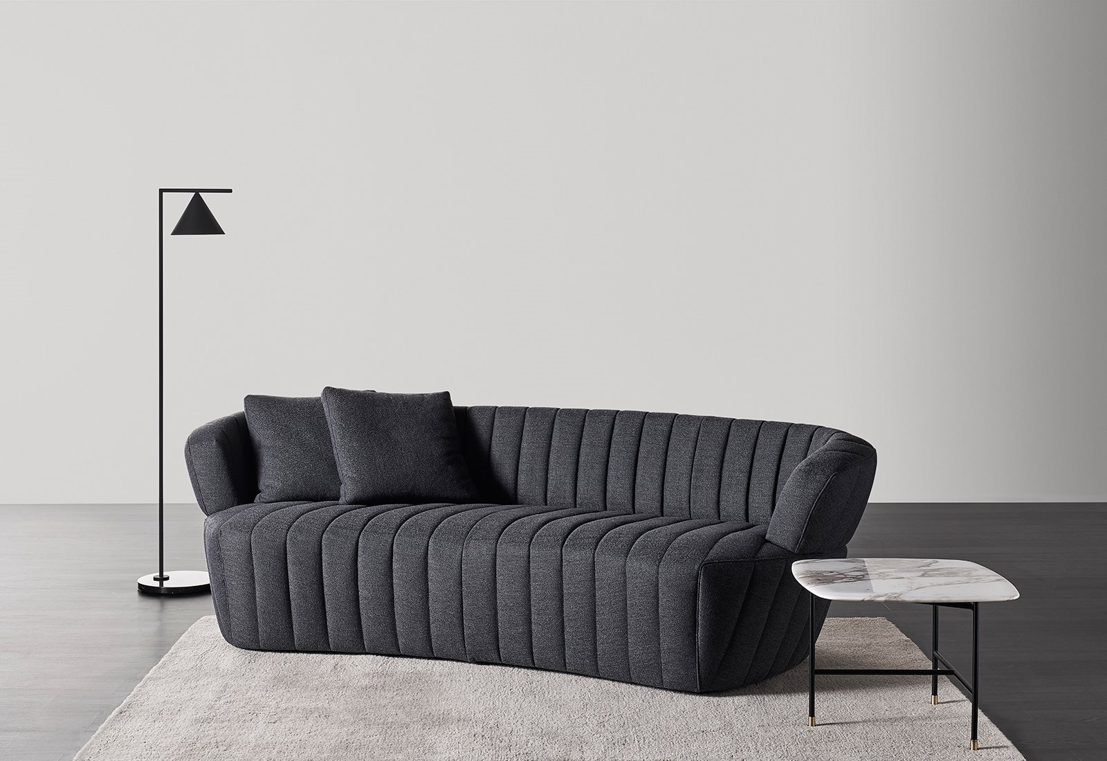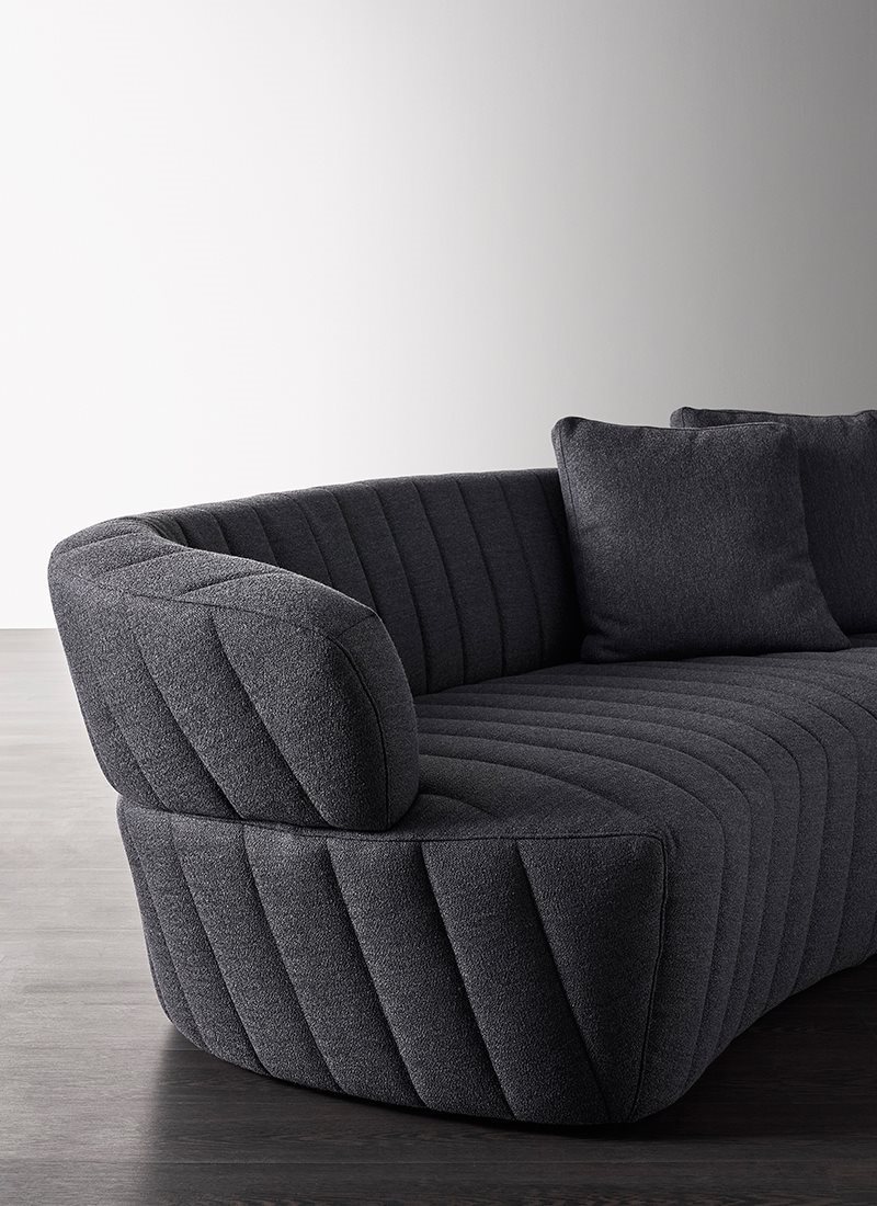Joseph is a sofa with an aerodynamic line, a shaped tilted to the side ‘bean’, imagined with a double look: a more bourgeois and elegant, completely tight one, and another more casual, entirely quilted one. A convivial element, for conversation, conceived – both for the height of its backrest and for the overall conformation – for a placement in the middle of the room or to be combined with other elements.
