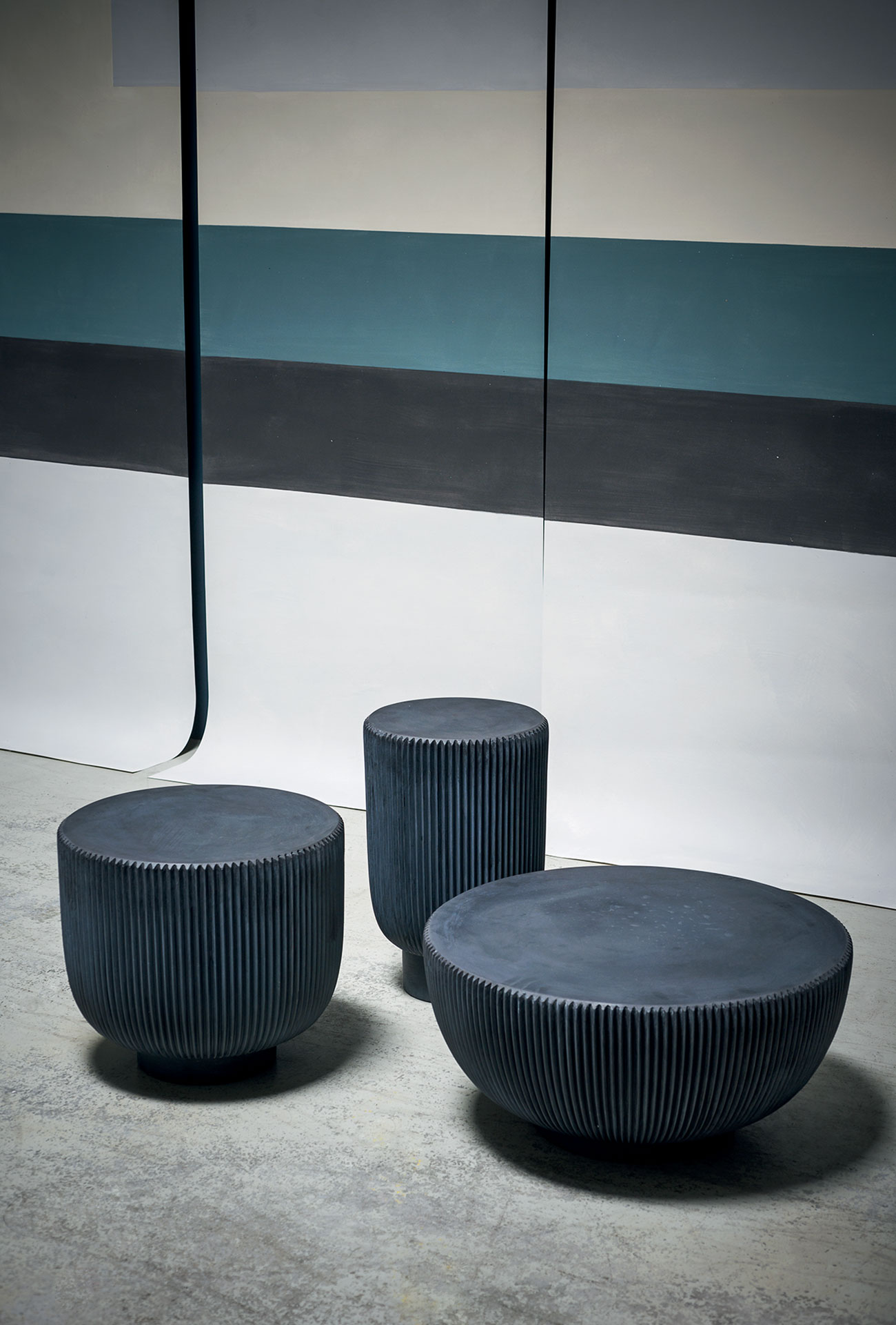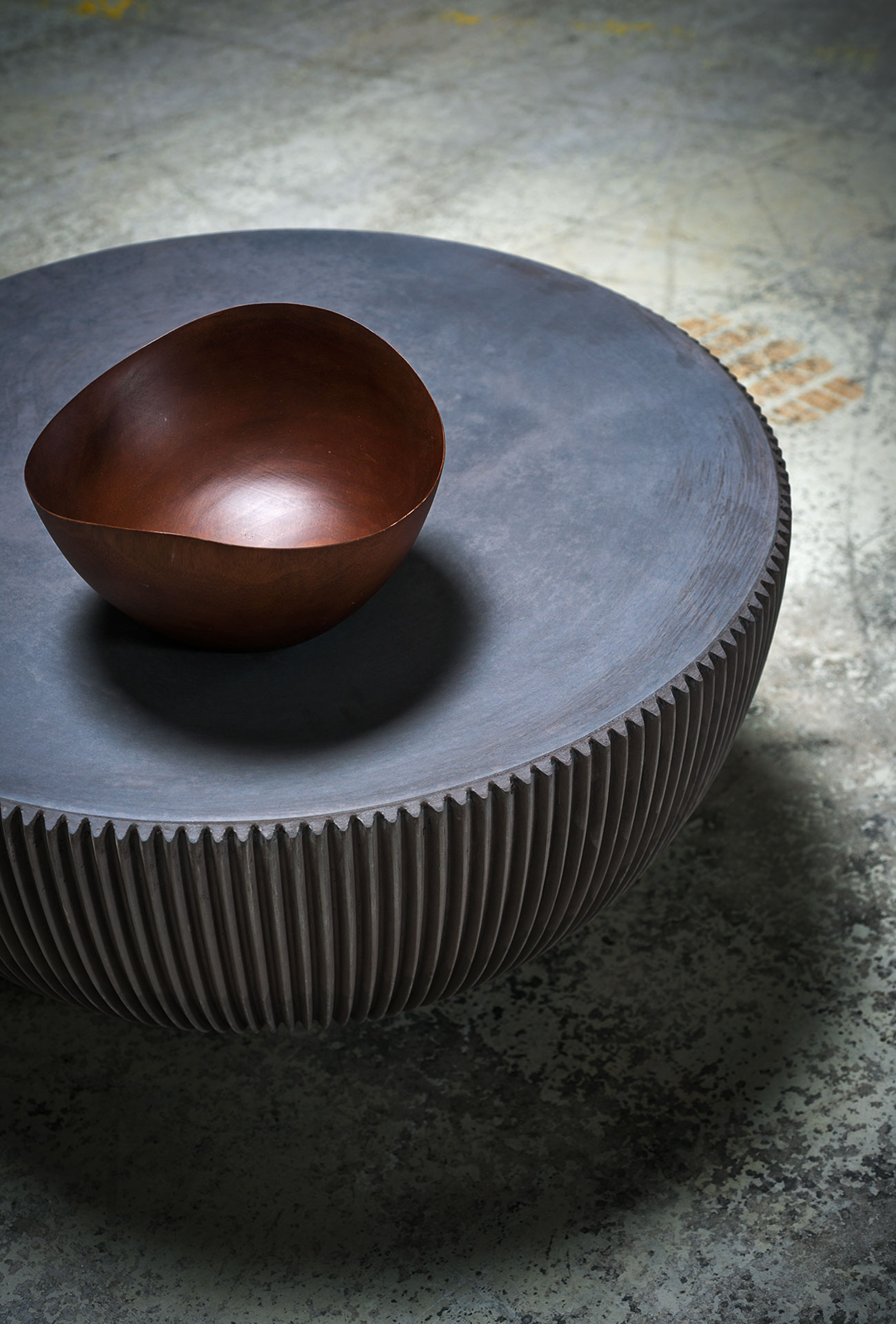 Round structure realized with moulded concrete in order to create vertical pleating on the surface.