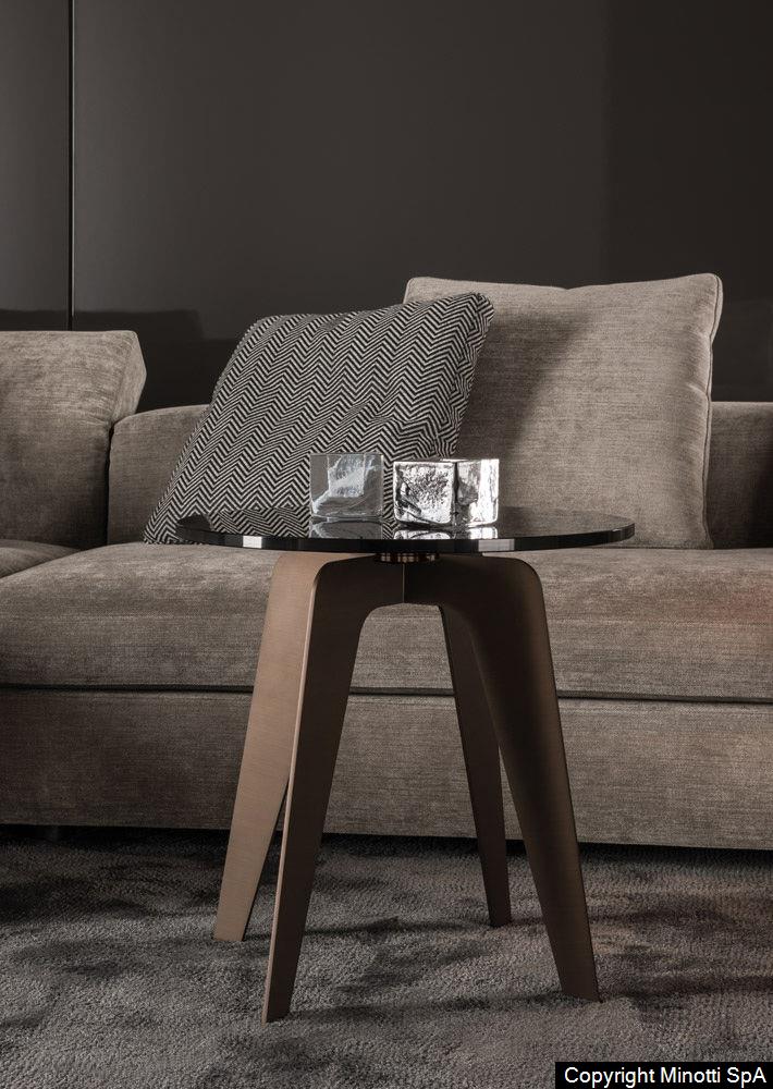 Each combination of base and table top materials evokes a different mood and feel, and the choices are countless. The transparent bronze glass top allows for appreciation of the elegant base and the opaque gold satin-finished metal plates, also available in bronze painted metal version.